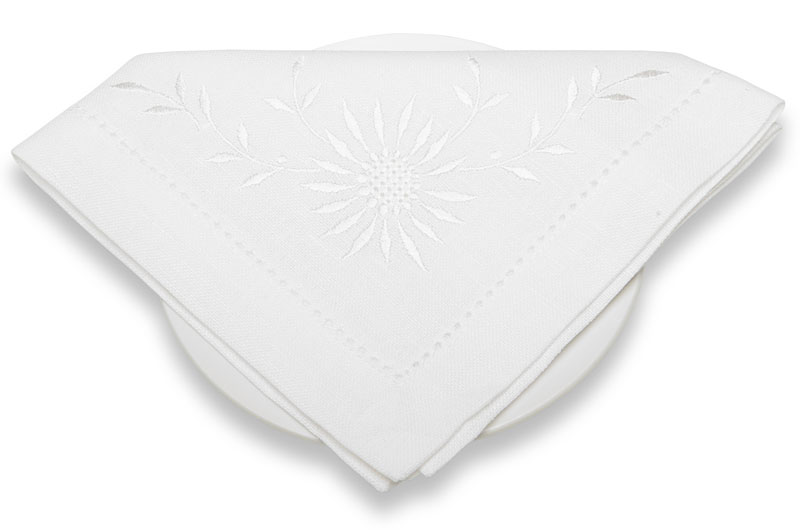Śnieżnobiała haftowana serwetka stołowa. Motyw haftu jednego rogu serwetki - biały kwiat. Brzeg serwetki wykończony mereżką.