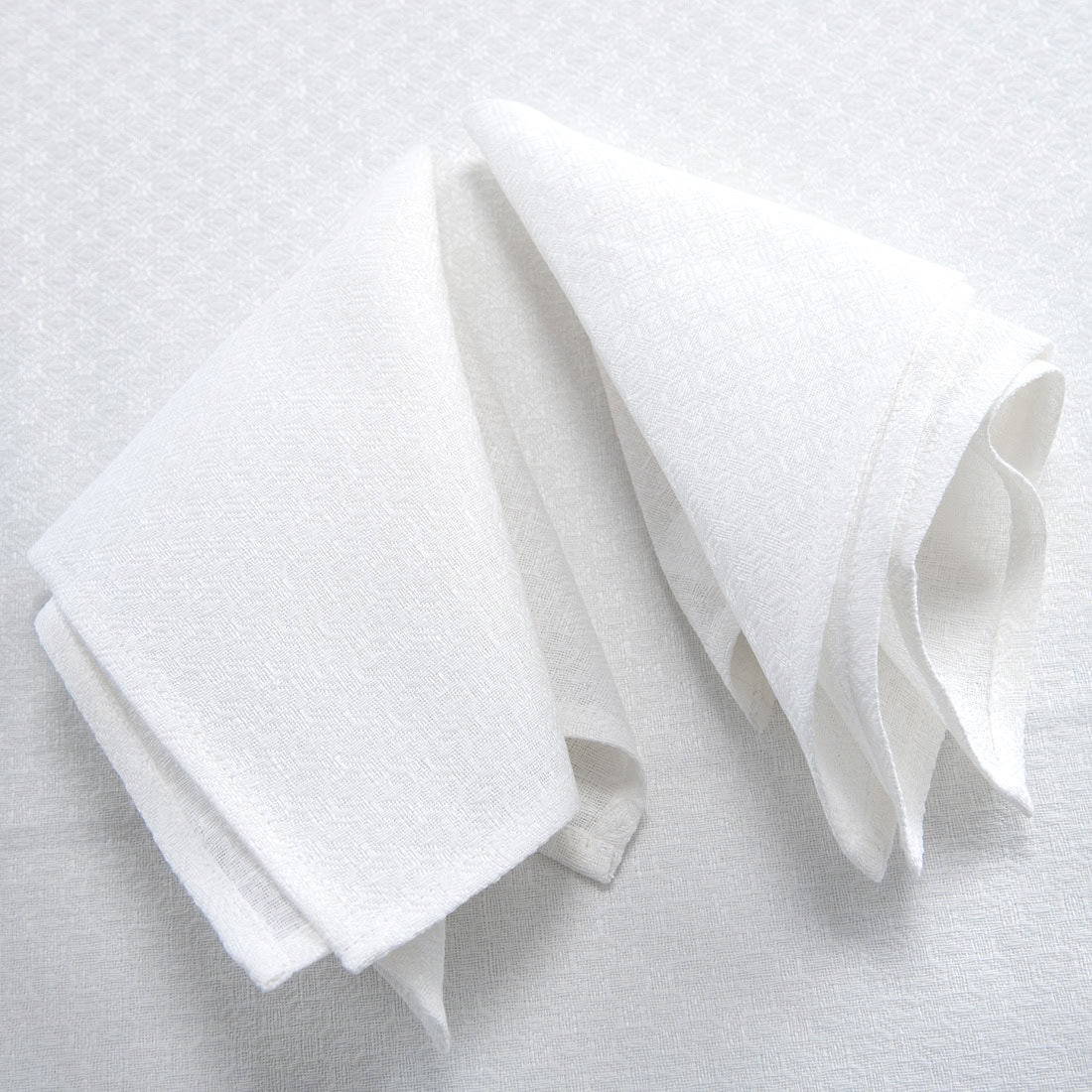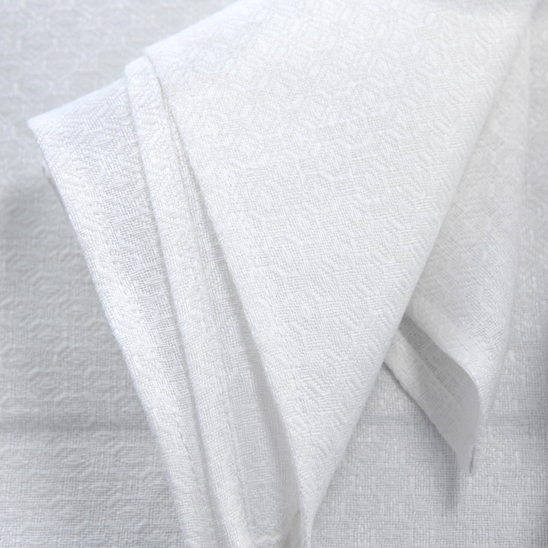 Śnieżnobiała serwetka stołowa z tkaniny lniano - bawełnianej wytkanej we wzór rombów. W miejscu styku rombów wzór układa się w geometryczne kwiatki. W naszym sklepie można dobrać obrusy z identycznej śnieżnobiałej tkaniny.
