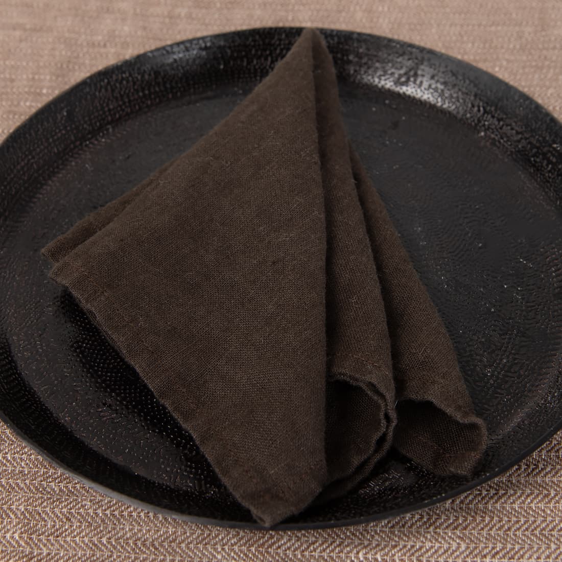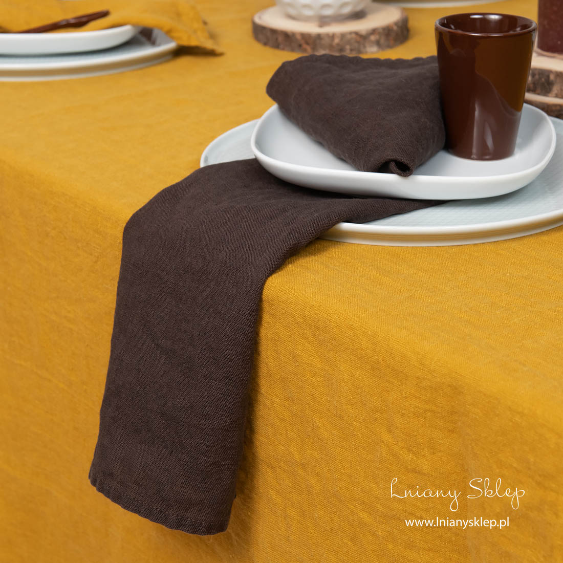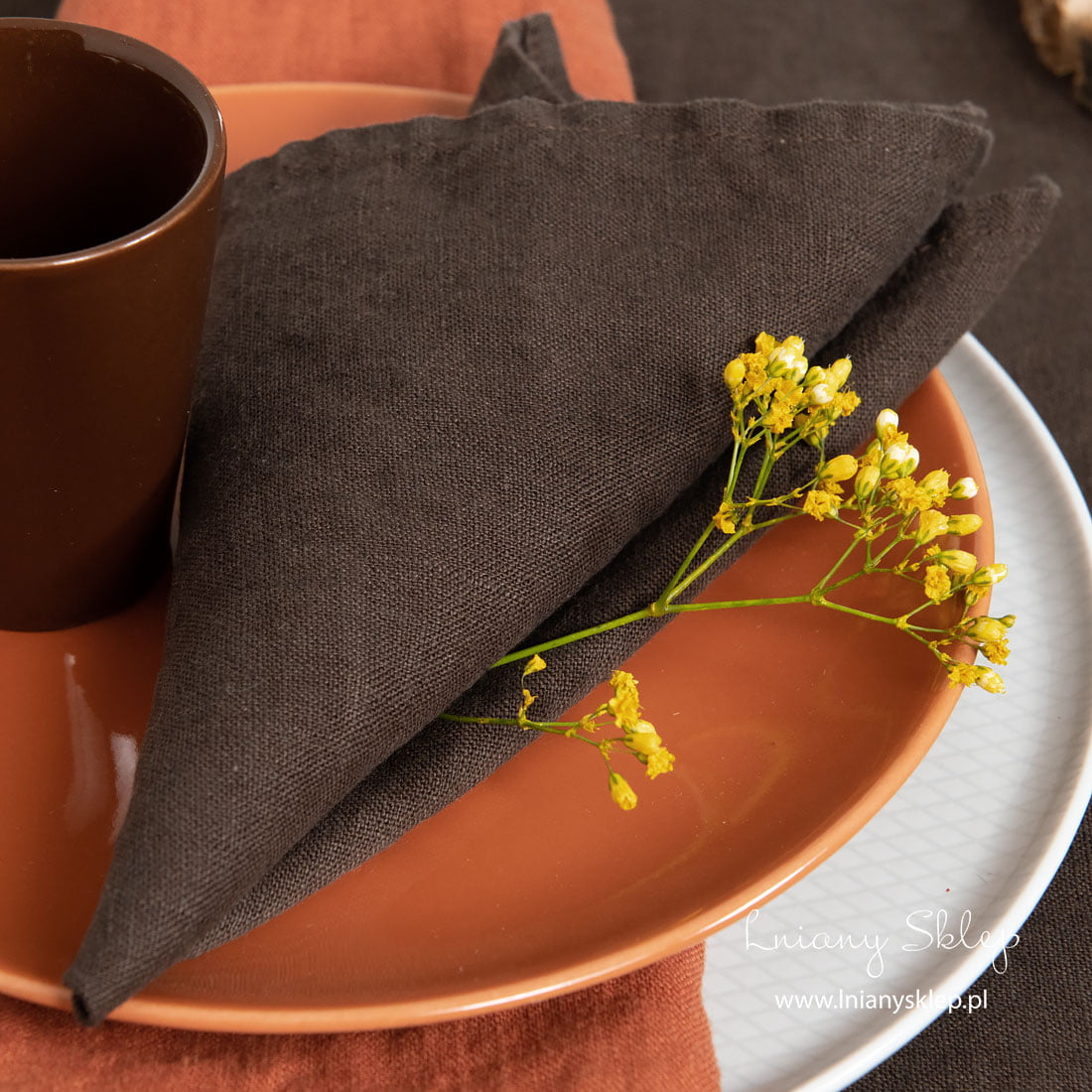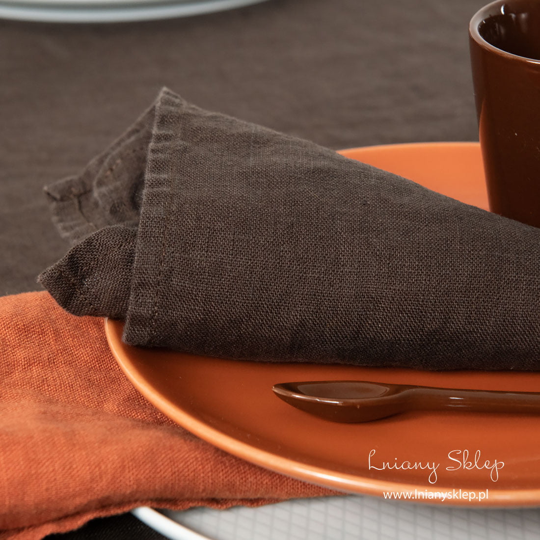 Brązowa serwetka prany len ma odcień czarnej czekolady. Można ją dopasować do obrusu z identycznej w kolorze albo kontrastowej tkaniny. Zależy to od gustu nakrywającej do stołu osoby. Serwetki pięknie się też prezentują na zwykłym stole z naturalnego drewna.