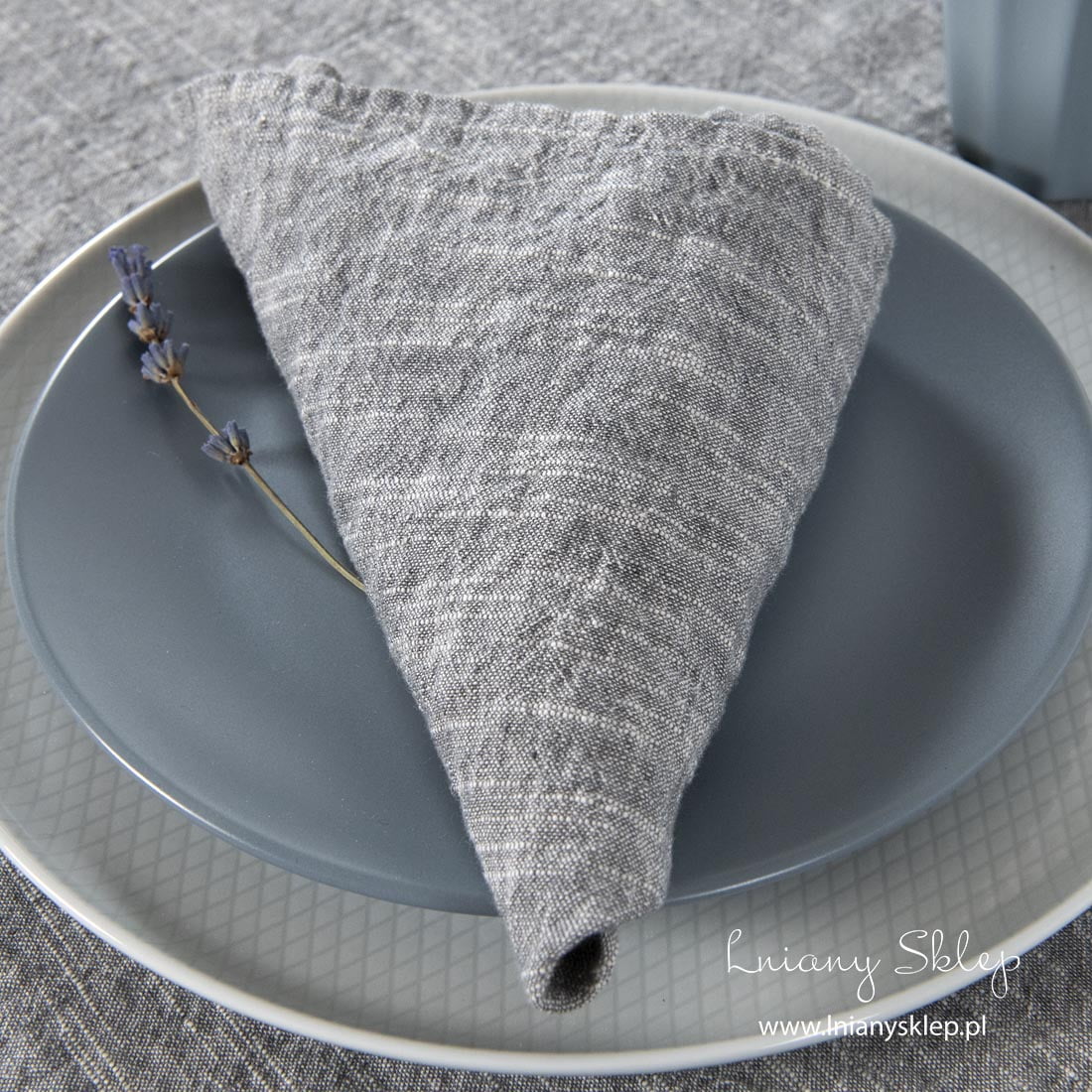 Ciemna szara serwetka z pranej tkaniny wytkanej z przędzy bawełnianej ciemnej szarej i lnianej mlecznobiałej (lekko żółtawej). Lniana przędza ma lekkie zgrubienia, które ożywiają tkaninę, układając się w tkaninie w nieregularne paski. Po praniu serwetka jest miękka, ma lekko gniecioną fakturę. Ozdób stół kompletem sympatycznych serwetek z pranej tkaniny.