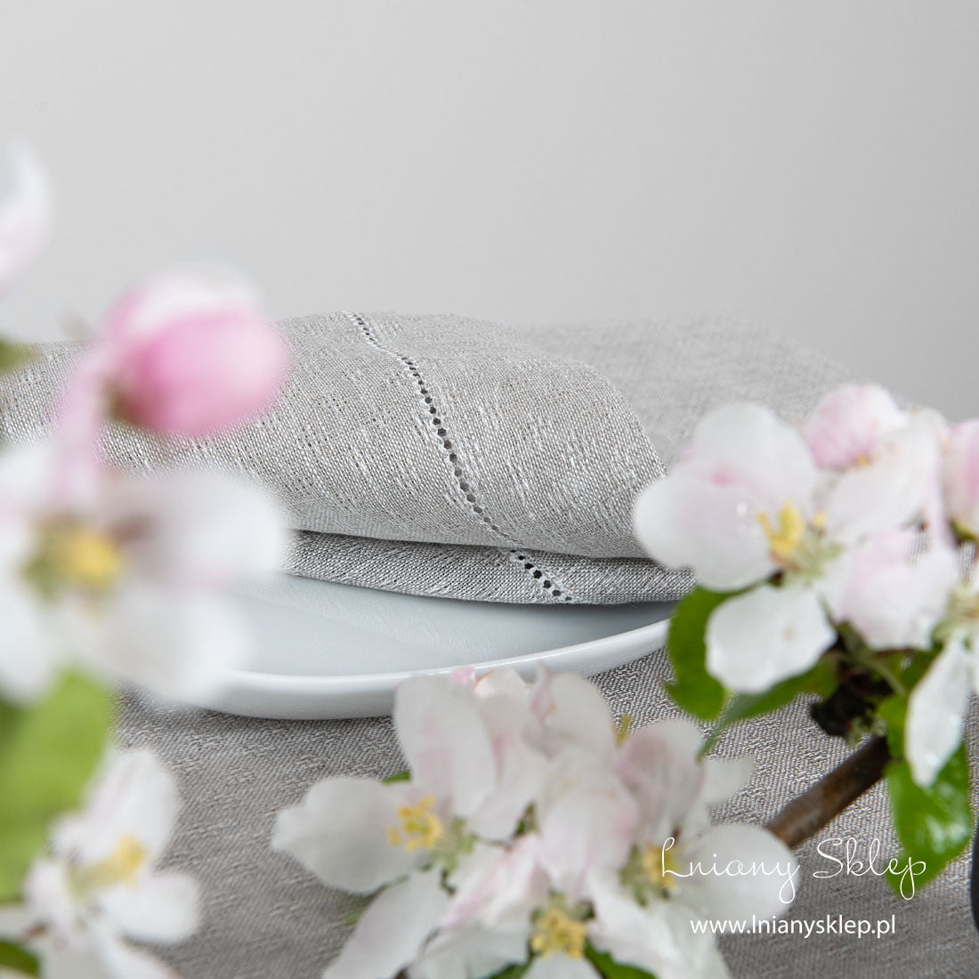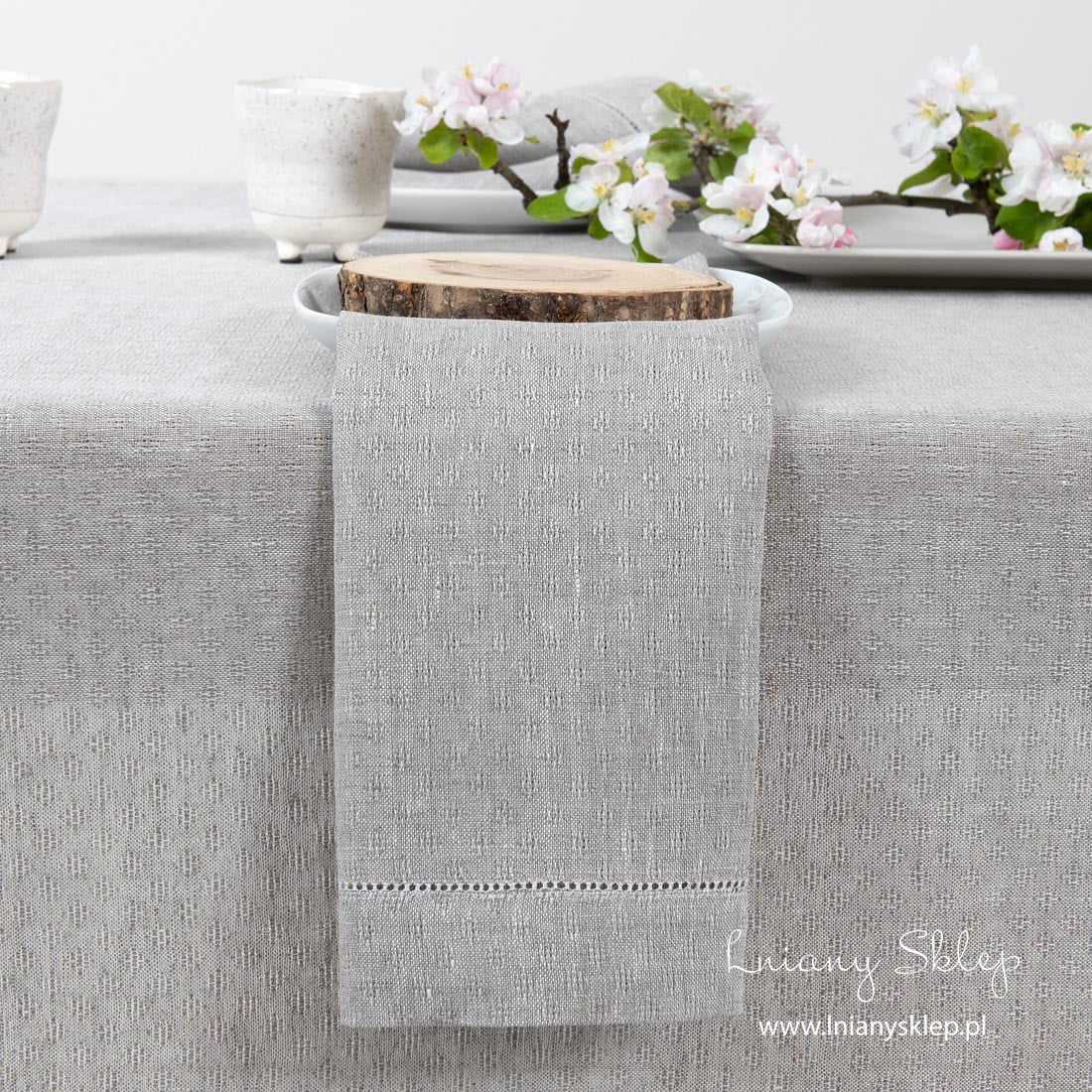Lniana jasnoszara serwetka bankietowa, wytkana w ażurową krateczkę. Brzeg serwetki ozdobiono 1 rzędem mereżki. Pięknie się będzie prezentowała na świątecznym albo codziennym stole. W naszej kolekcji można znaleźć obrus z identycznej tkaniny, ozdobiony mereżką.