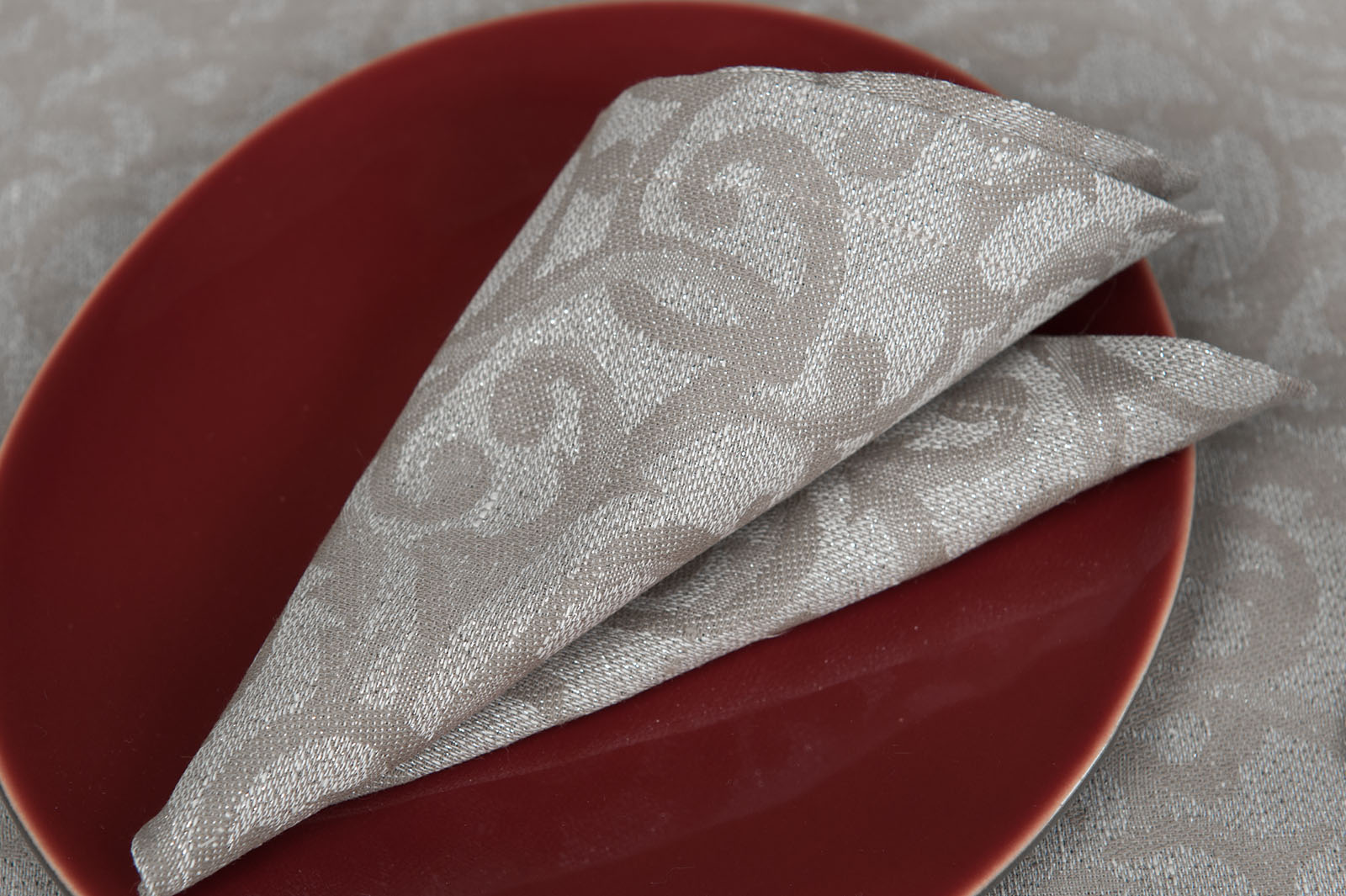 Świąteczna lniano – bawełniana żakardowa serwetka stołowa. Do wytkania żakardowej tkaniny użyliśmy srebrzystej nitki poliesterowej. Pięknie prezentować się będą serwetki w komplecie z obrusem lub bieżnikiem z identycznej tkaniny albo dodadzą blasku jednobarwnemu, np. szaremu obrusowi.