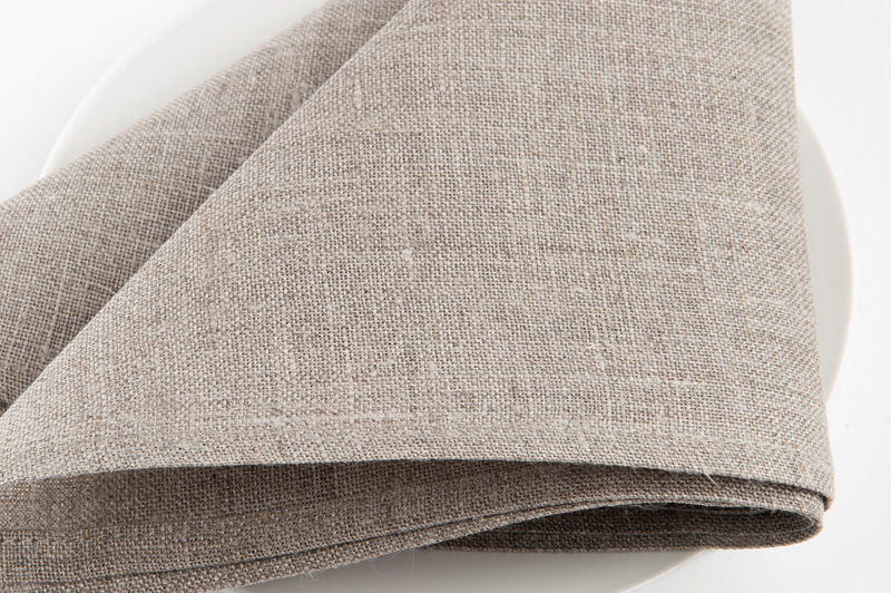 Szara (kolor włókna lnianego) serwetka bankietowa z gładko tkanej tkaniny 100% lnianej. Klasyczna, uniwersalna serwetka, którą można dopasować do dowolnego białego, szarego lub dowolnego innego obrusu o neutralnej barwie.