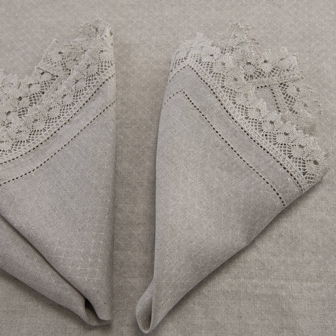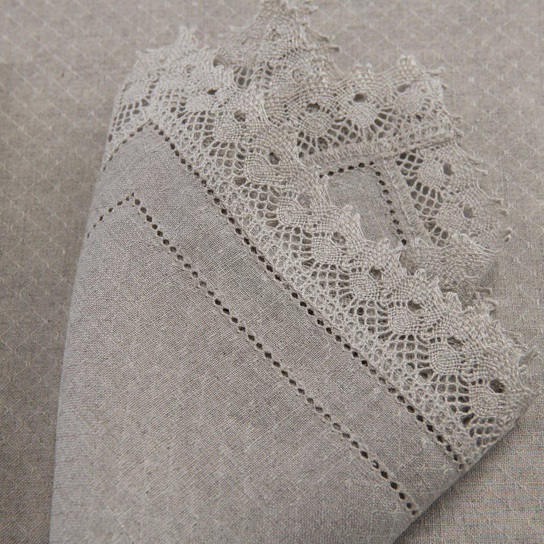 Elegancka serwetka bankietowa z naturalnej, szarej w delikatne romby tkaniny 100% lnianej. Brzeg serwetki ozdobiono koronką i dwoma rzędami delikatnej mereżki. Niezwykle elegancka serwetka odpowiednia na każdą, nawet najbardziej uroczystą okazję. W naszej kolekcji można znaleźć obrus do kompletu.