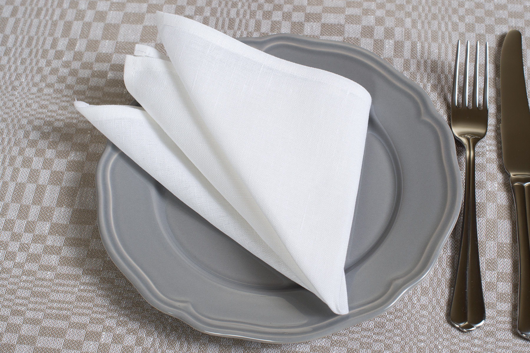 Śnieżnobiała lniano - bawełniana serwetka stołowa. Brzegi serwetki podwinięto gładkim szwem. Klasyczne śnieżnobiałe serwetki podkreślą odświętny charakter imprezy, spotęgują wrażenie eleganckiej świeżości.