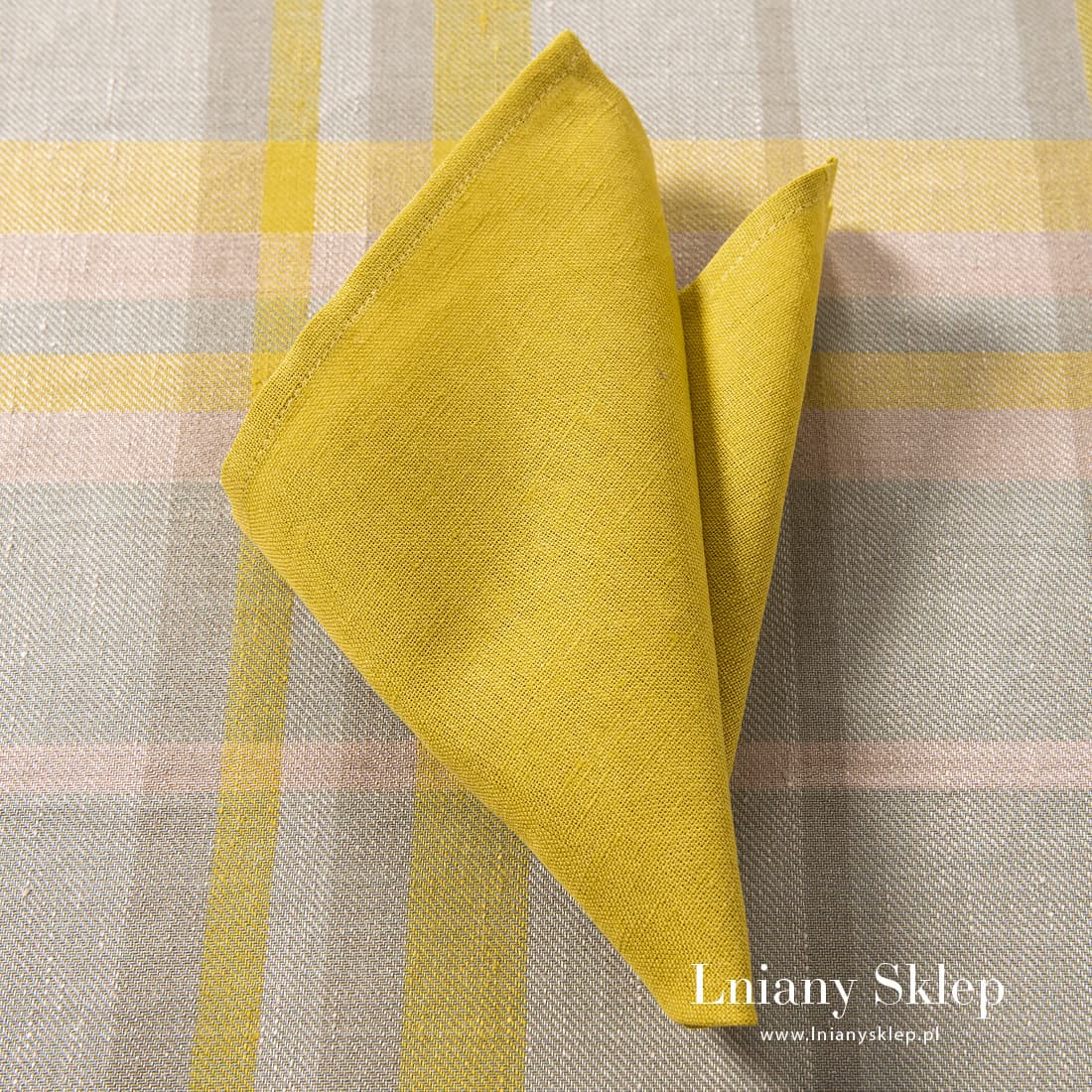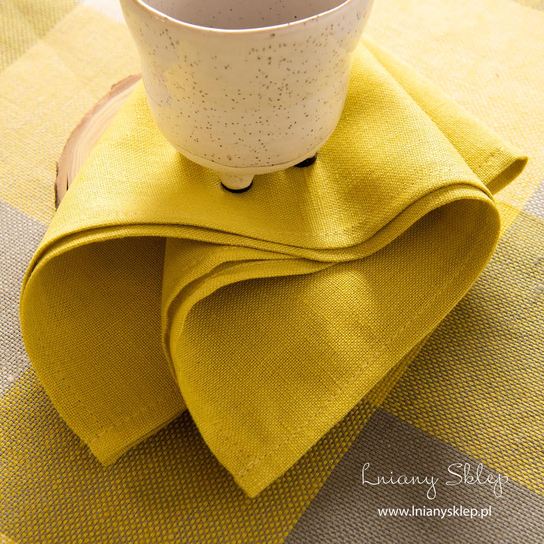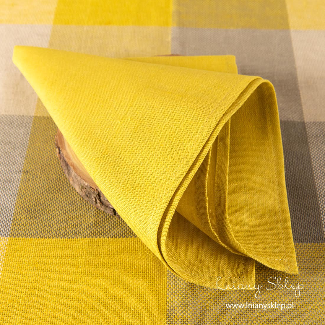 Żółta lniano – bawełniana serwetka. Brzegi wykończone zwykłym podwinięciem. Dostępna w czterech rozmiarach. Dobierz do jednobarwnego obrusu z żółtej jaskrawej tkaniny (brzeg ozdobiony mereżką) albo do obrusu w dość dużą żółto – szarą kratkę.