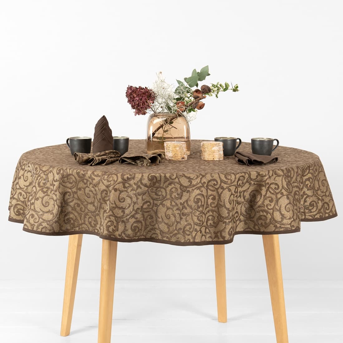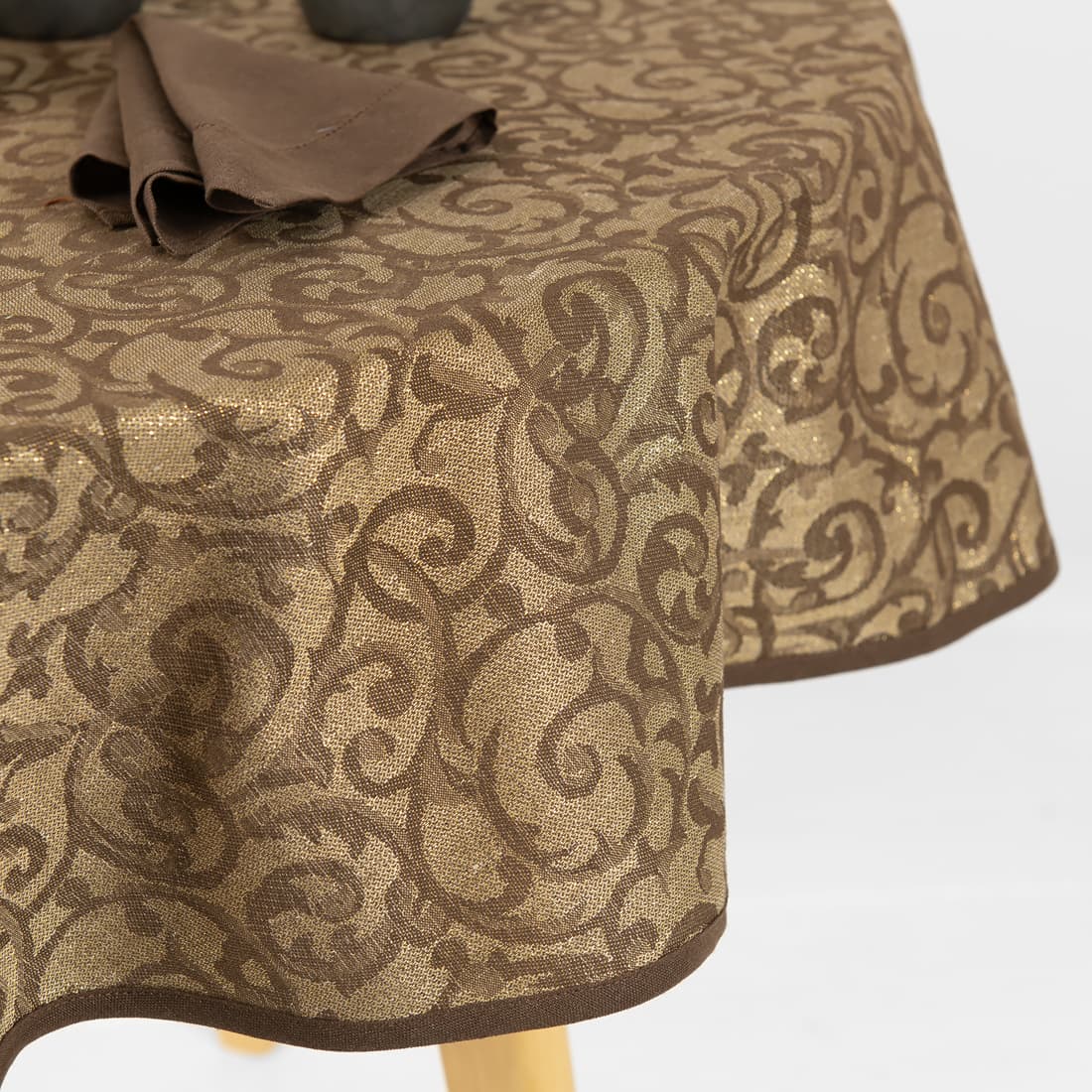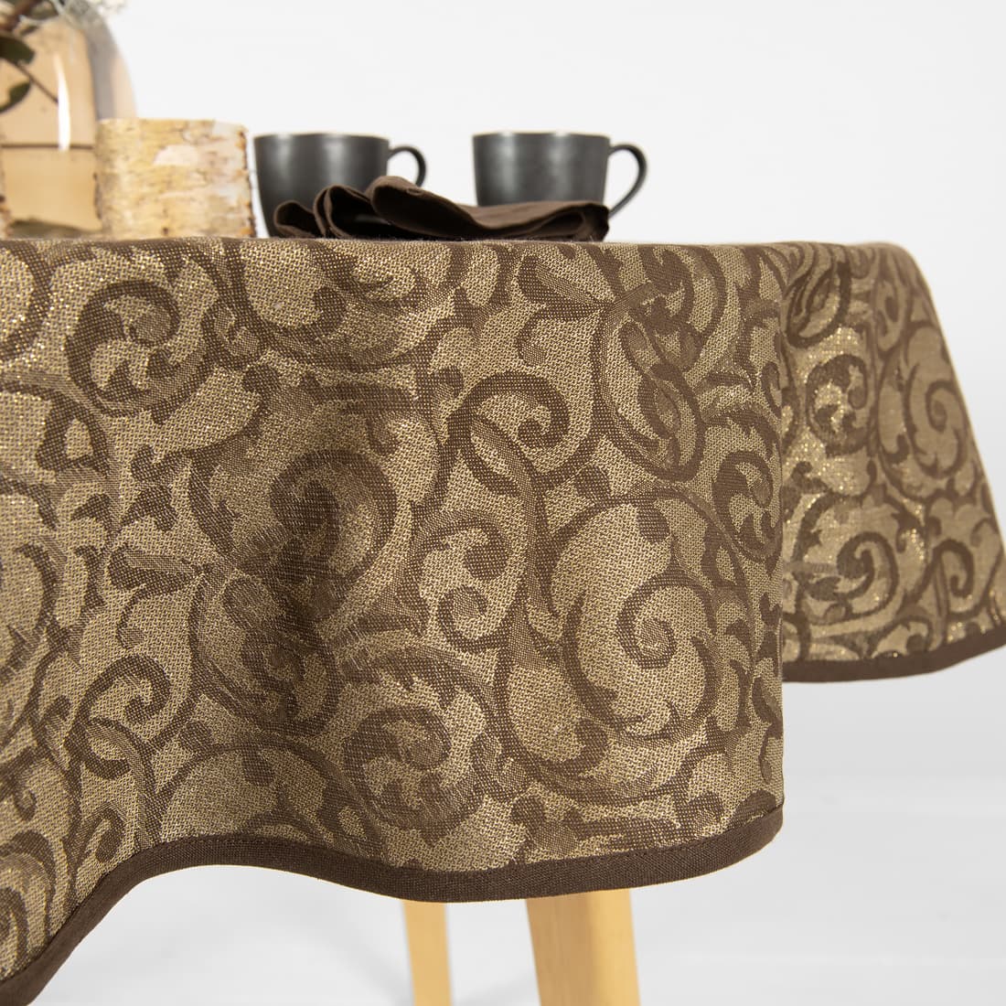 - Kolor: wytkany z przędzy bawełnianej ciemnobrązowej, lnianej niebarwionej (szarej o piaskowym odcieniu) i złotej (PES)