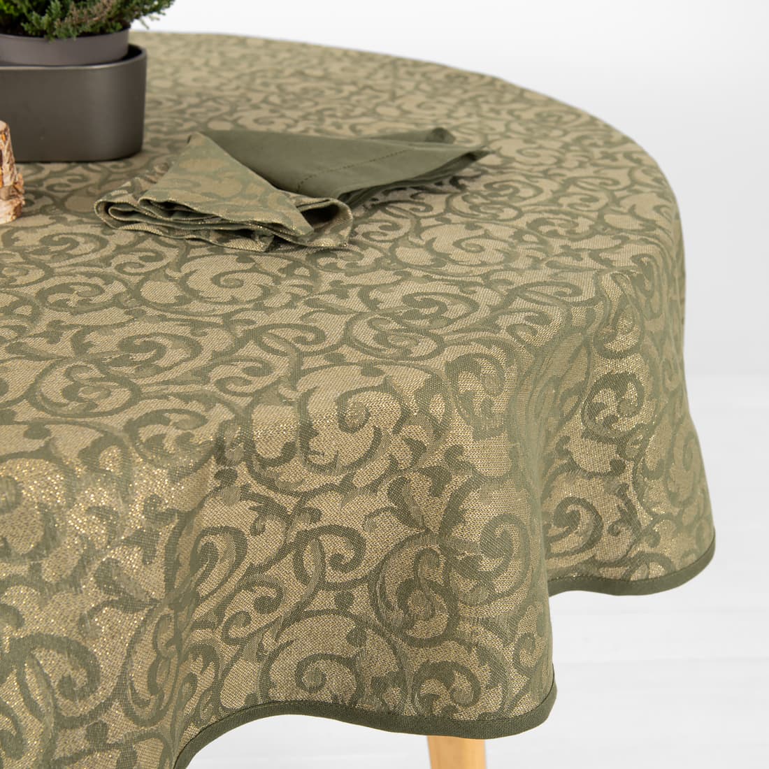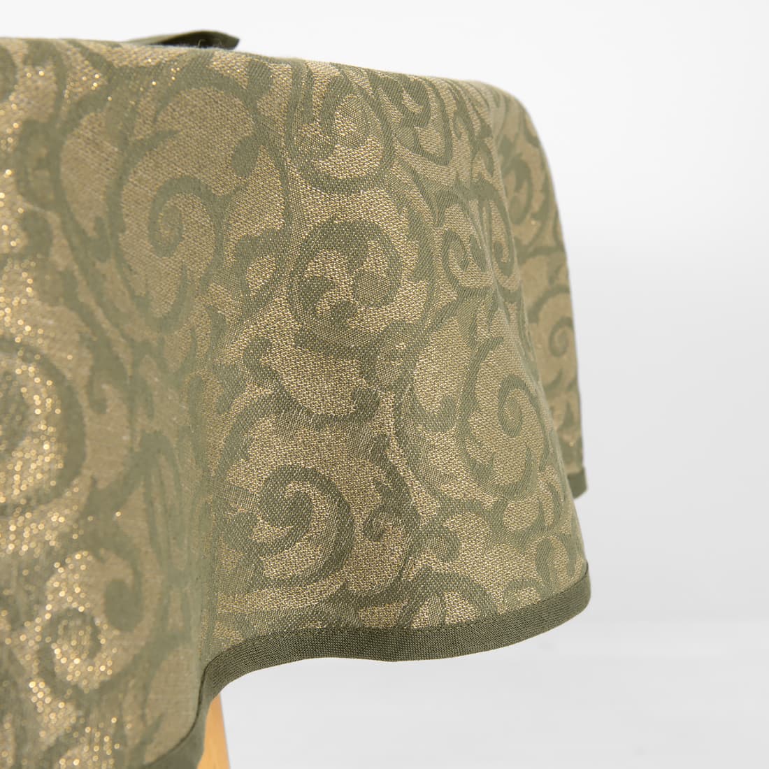 - Kolor: wytkany z przędzy bawełnianej ciemnozielonej, lnianej niebarwionej (szarej o piaskowym odcieniu) i złotej (PES)