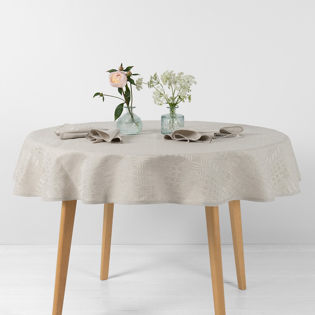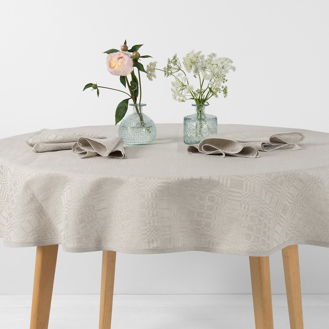 - Kolor: wytkany z białej bawełnianej i niebarwionej (szarej w piasek) lnianej przędzy