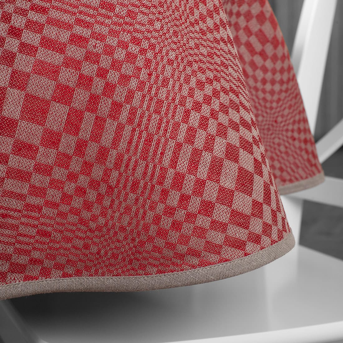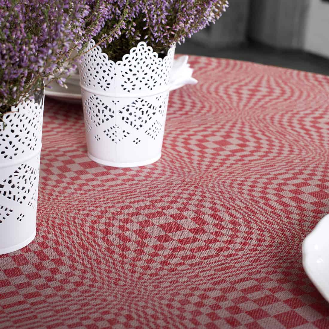 Lniano - bawełniany obrus wytkany w czerwono - szarą kratkę o różnej wielkości. Brzeg obrusu zdobi szara lamówka. W naszej ofercie do wyboru: okrągły lub owalny obrus. Obrus, wytkany w niecodzienny, geometryczny wzór dodatkowo ożywią jednobarwne - czerwone serwetki z oferty naszego sklepu internetowego.