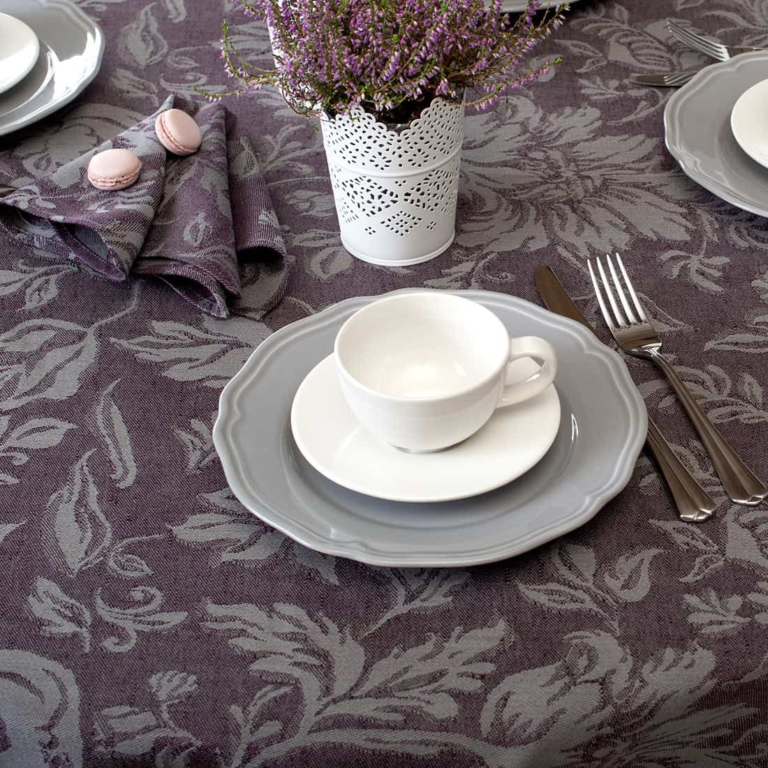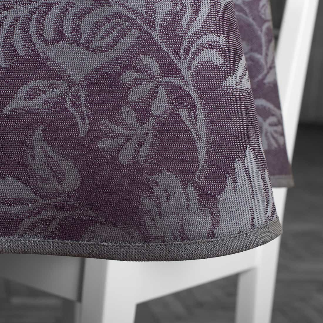 Obrus okrągły lub owalny z żakardowej tkaniny lniano - bawełnianej wytkanej z przędzy ciemnofioletowej (o lekko czerwonawym odcieniu) i szarej w przepiękne, barokowe kwiaty. Brzeg obrusu wykończono szarą lamówką. W naszej kolekcji - serwetki z identycznej oraz dopasowanej - szarej tkaniny.