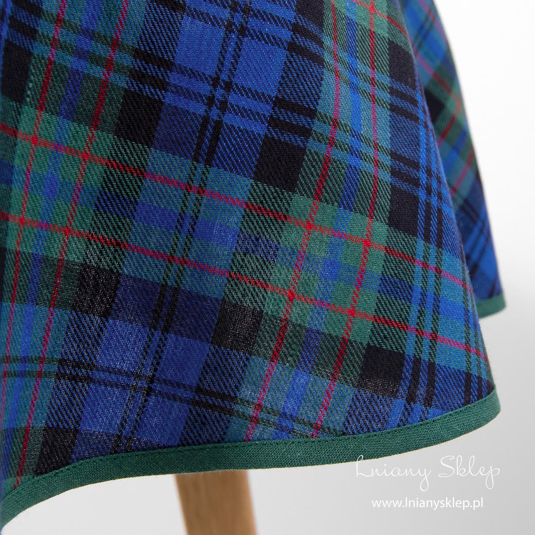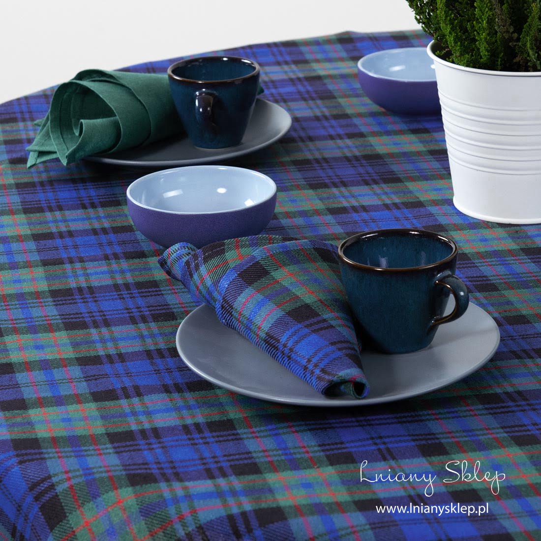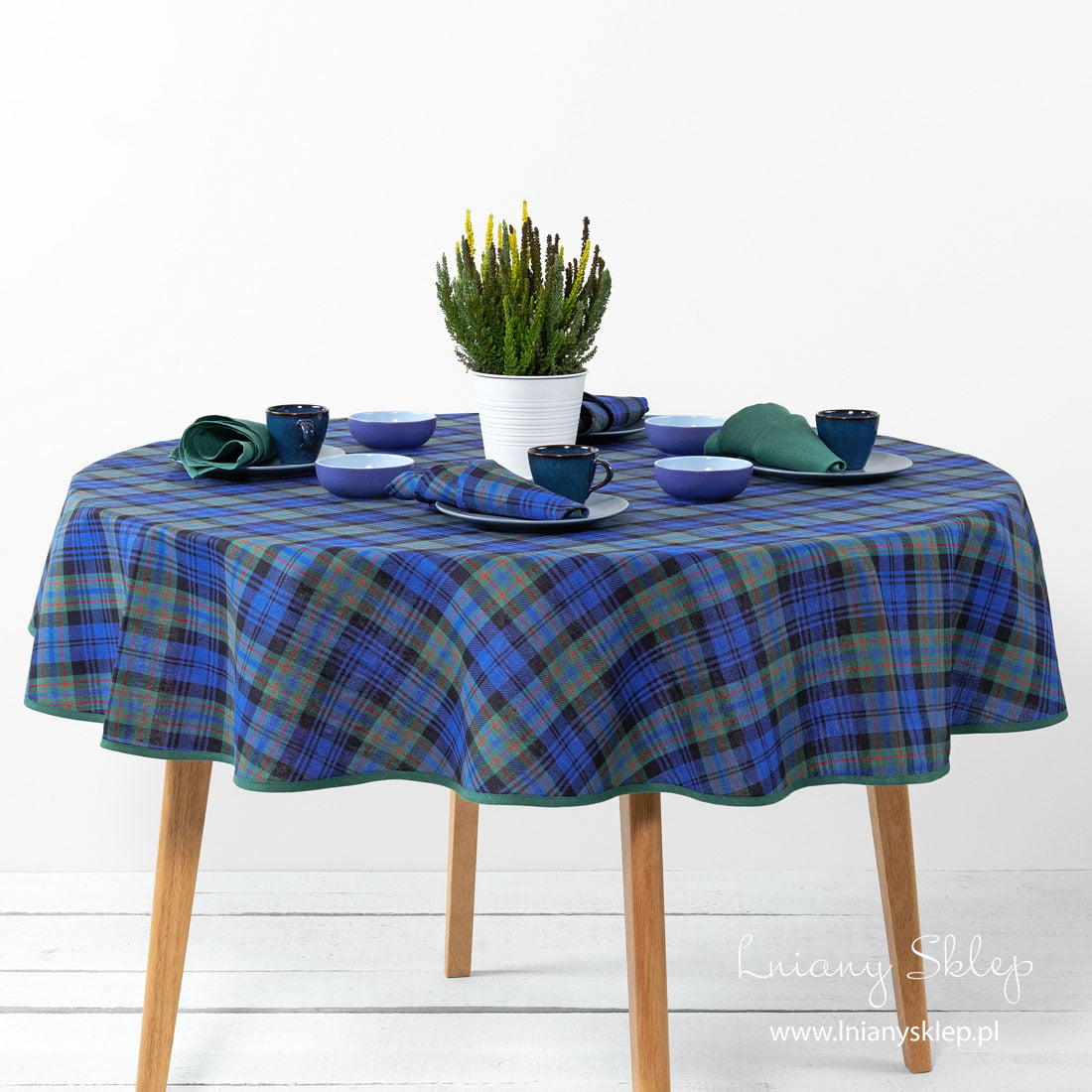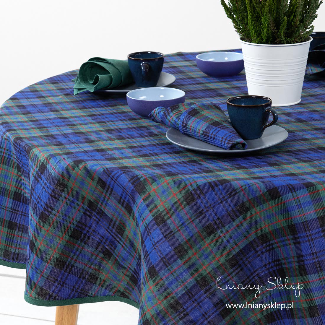 Lniano - bawełniany obrus okrągły lub owalny w kratkę niebieską i zieloną wykonany został z tkaniny wytkanej splotem skośnym. Brzeg obrusu wykończyliśmy zieloną jednobarwną lamówką. Do kompletu można dobrać identyczne albo jednobarwne zielone serwetki. Obrus w szkocką kratkę pięknie będzie się prezentować na świątecznym stole.