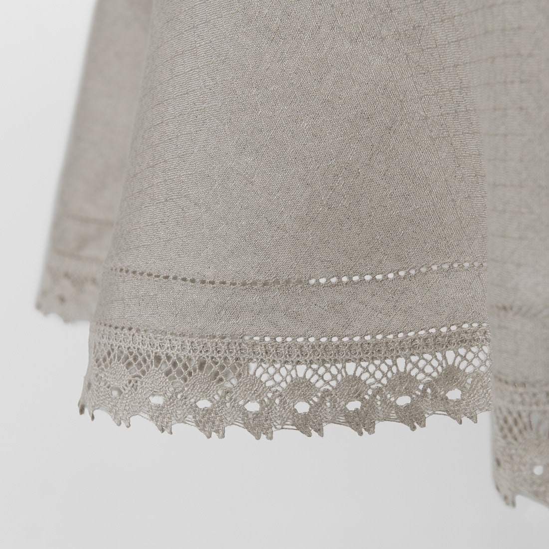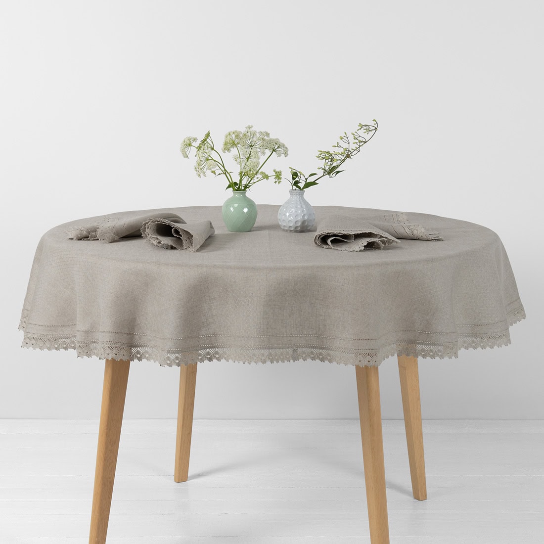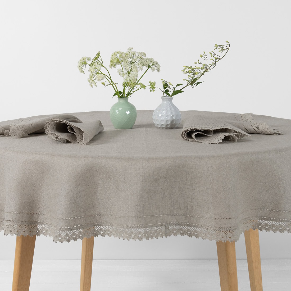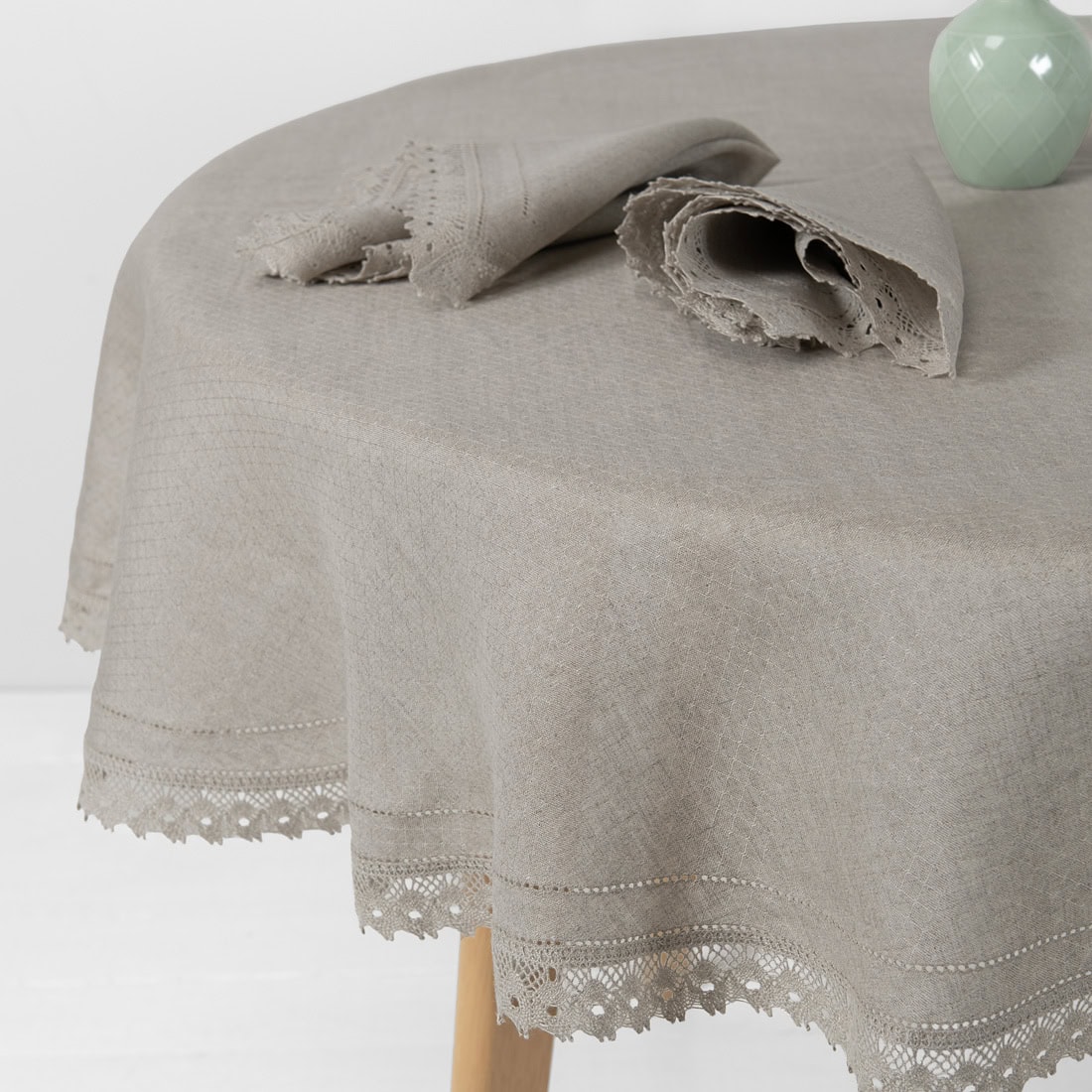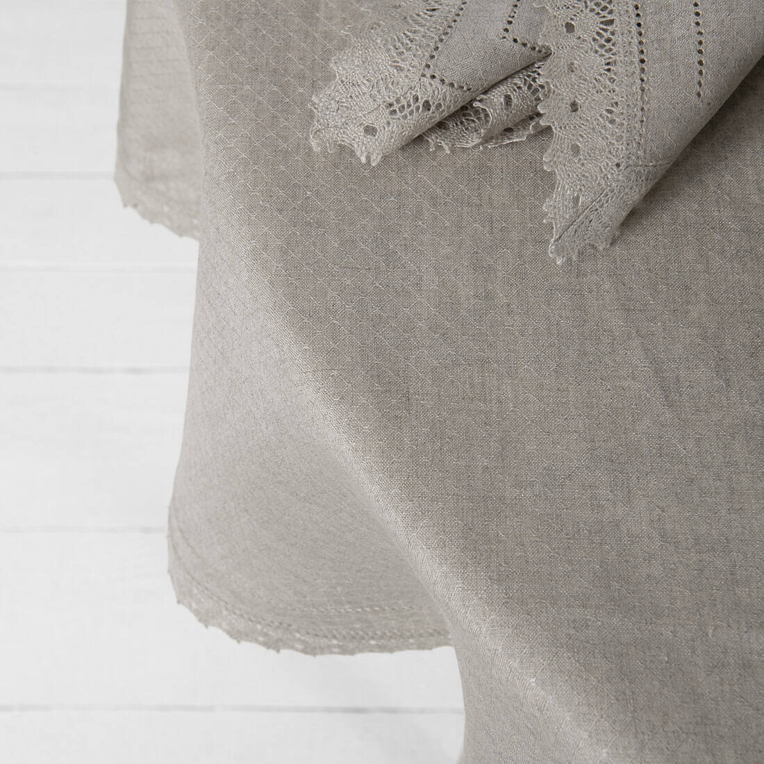Okrągły (owalny) jasnoszary lniany obrus wytkano we wzór drobnych rombów. Brzeg obrusu ozdobiono dwoma rzędami mereżki i wykończono lnianą koronką o identycznym szarym odcieniu. W naszej kolekcji można znaleźć ozdobione mereżką i koronką serwetki stołowe z identycznej tkaniny. Mamy też identycznie zdobiony prostokątny obrus.
