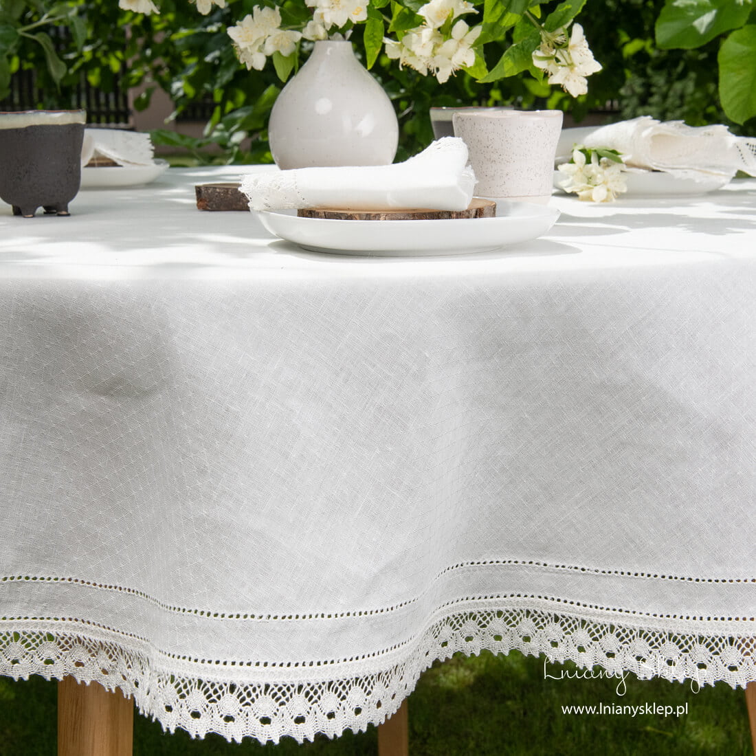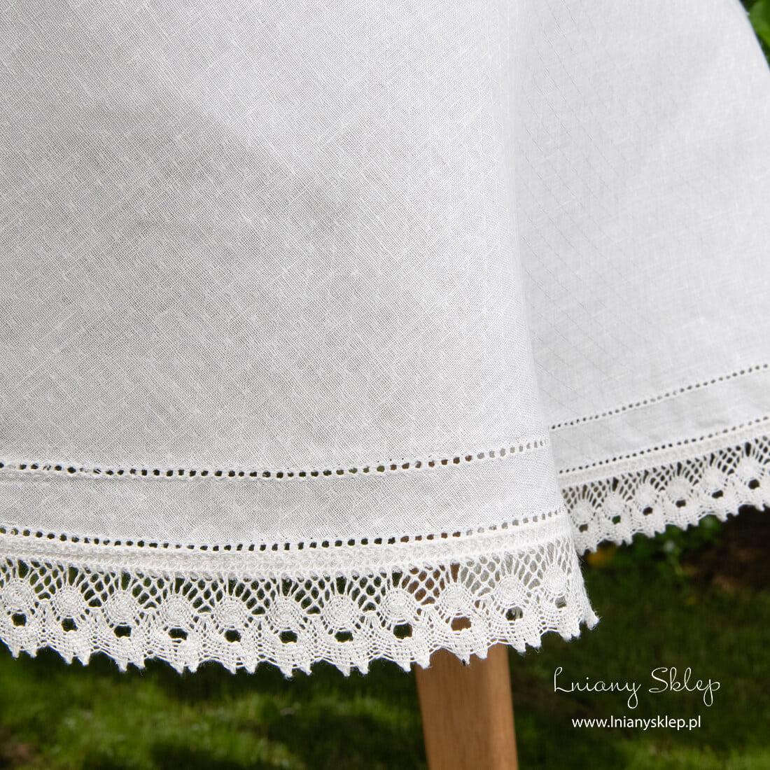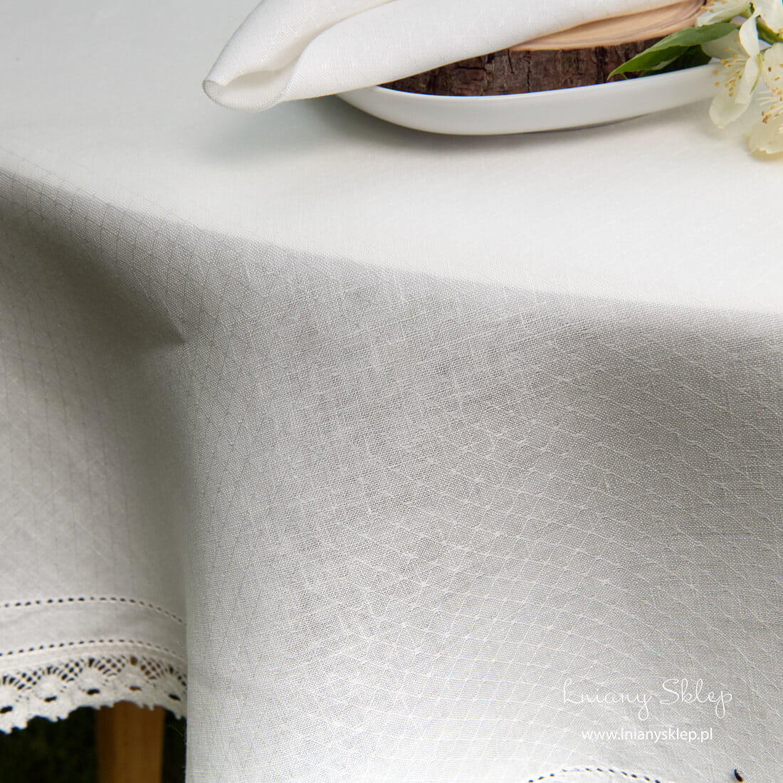 Okrągły (owalny) biały ażurowy obrus z koronką został wykonany z mlecznobiałej (lekko żółtawej) tkaniny 100% lnianej wytkanej we wzór delikatnych, nieprzeźroczystych rombów. Brzeg obrusu zdobią dwa rzędy mereżki i delikatna lniana koronka. W kolekcji mamy dopasowane serwetki ozdobione identyczną koronką.