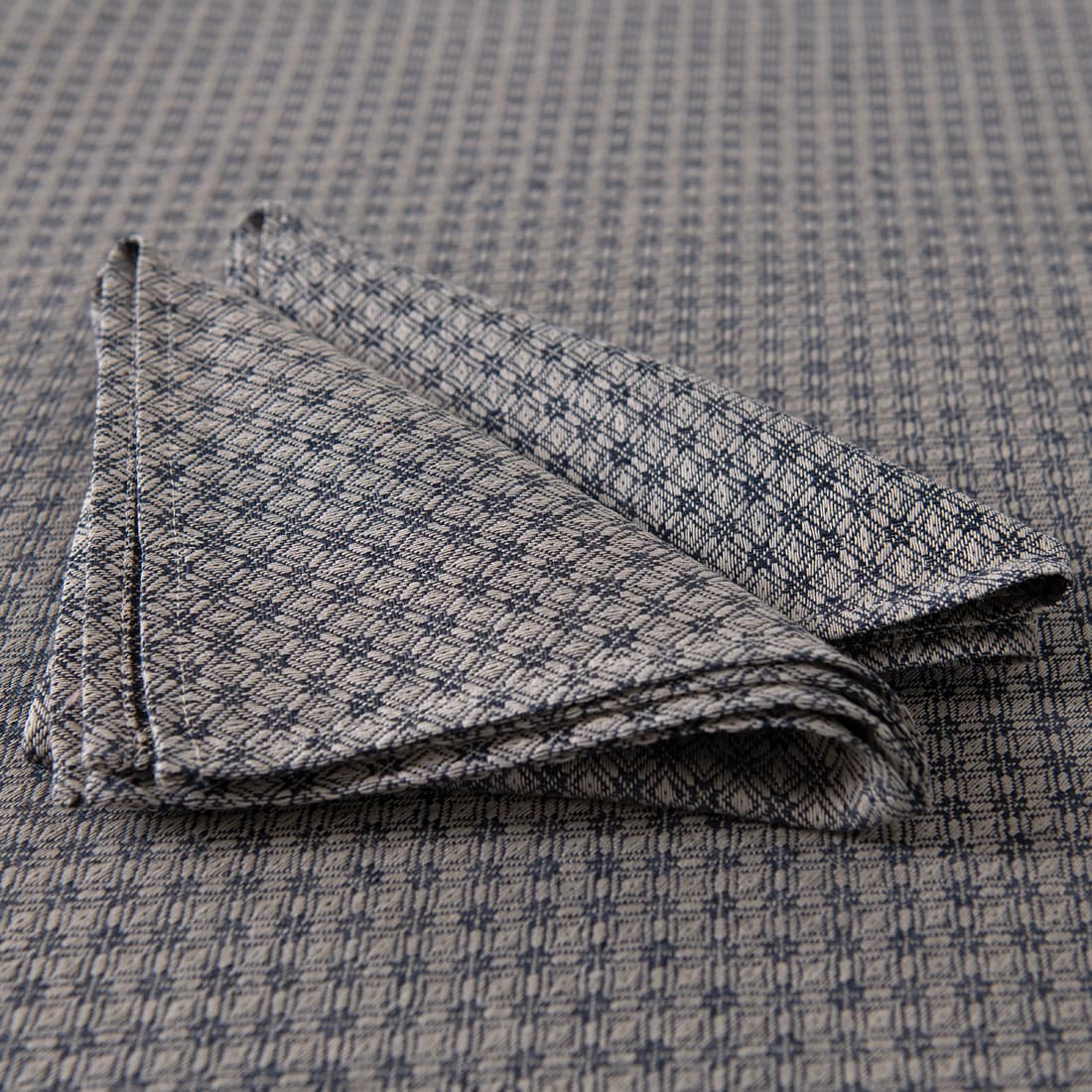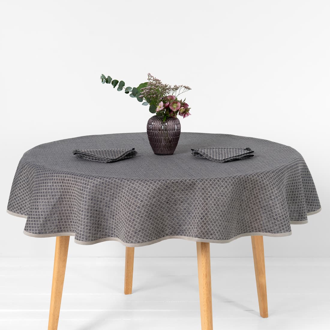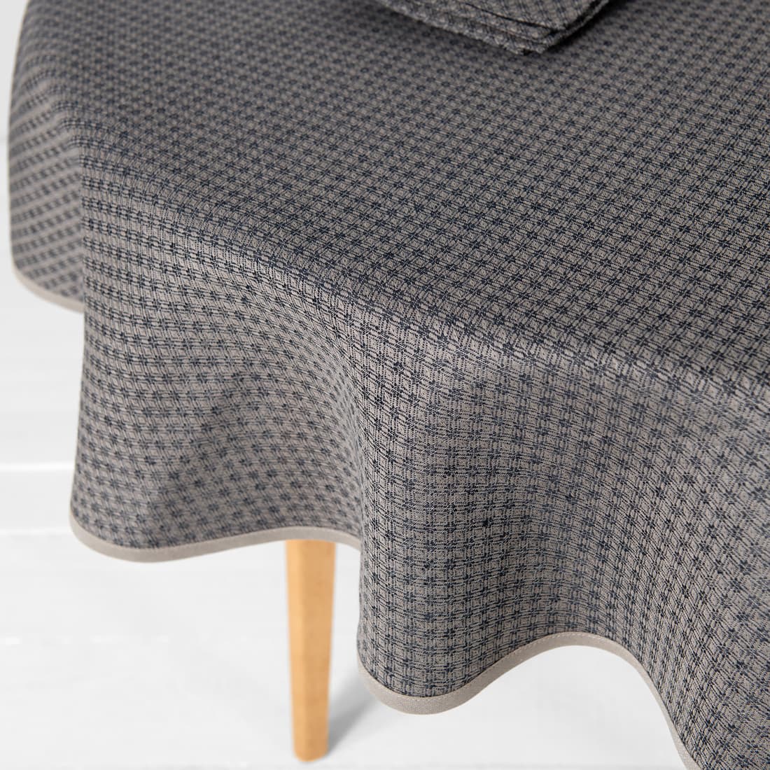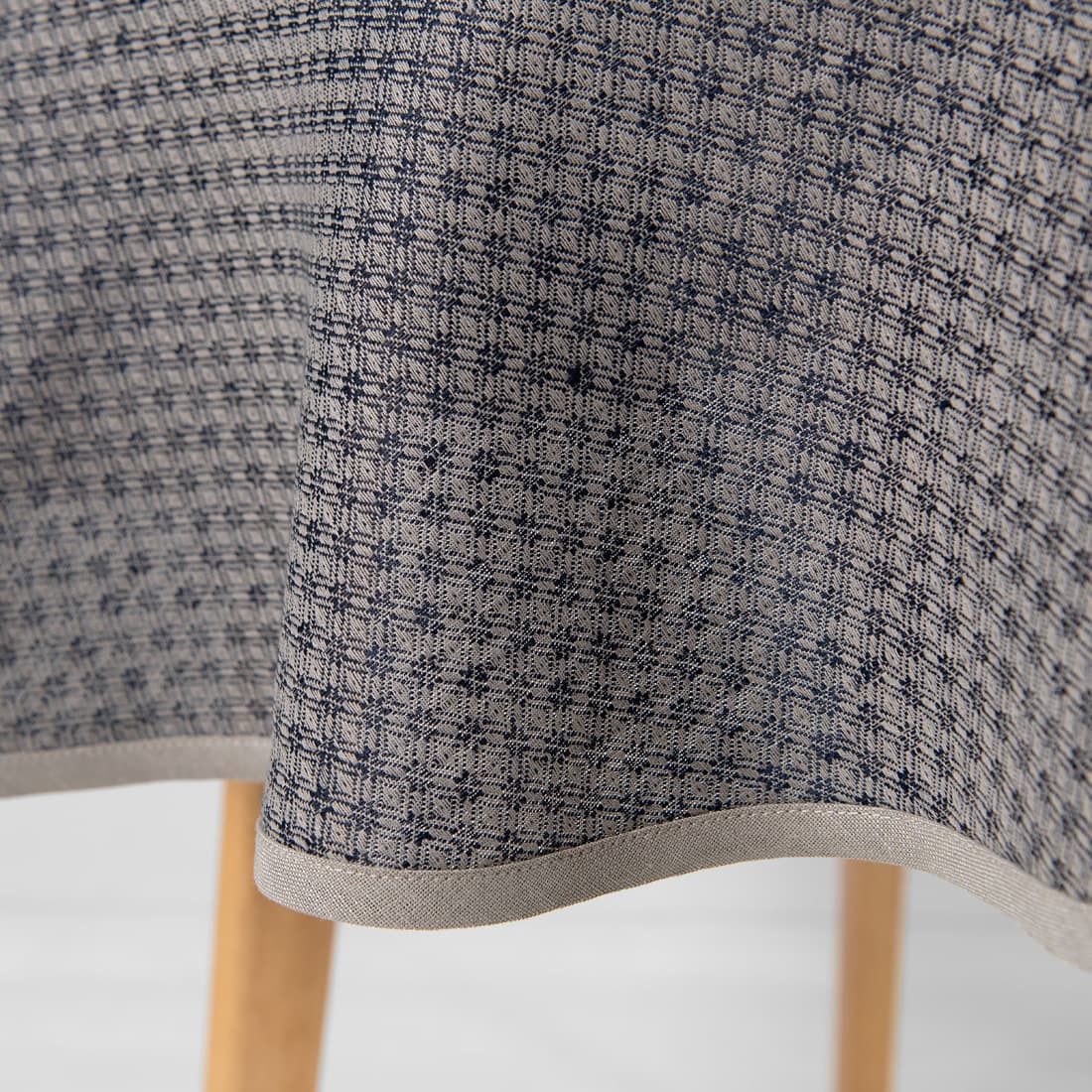 Lniano - bawełniany okrągły lub owalny obrus wytkany we wzór granatowych i szarych rombów. W miejscu styku rombów wzór układa się w geometryczne kwiatki. Brzeg obrusu wykończono szarą lamówką. Obrus w neutralnej tonacji stanie się sympatycznym akcentem wigilijnego lub innego - świątecznego stołu. W naszym sklepie można dobrać serwetki stołowe do kompletu.