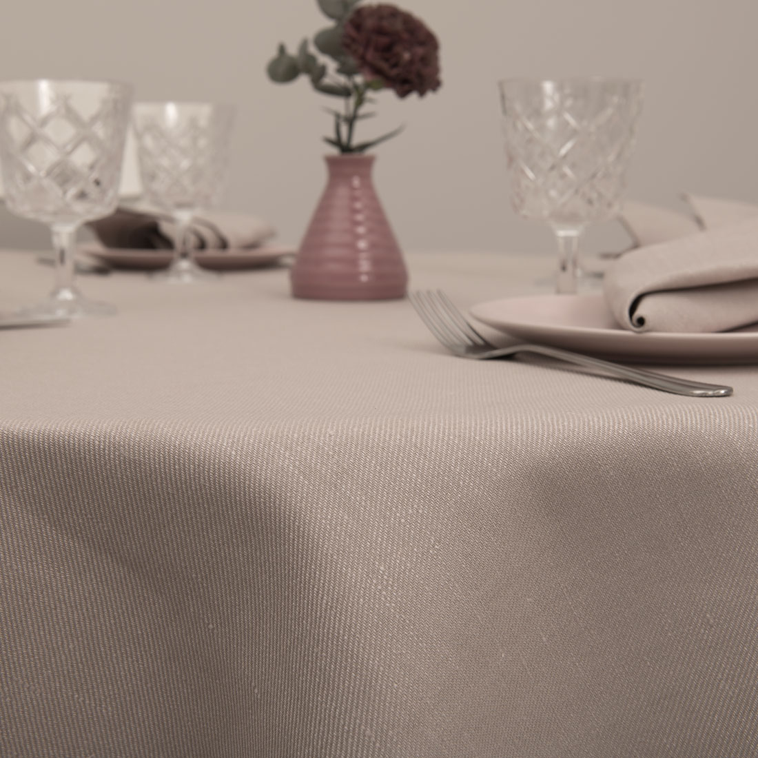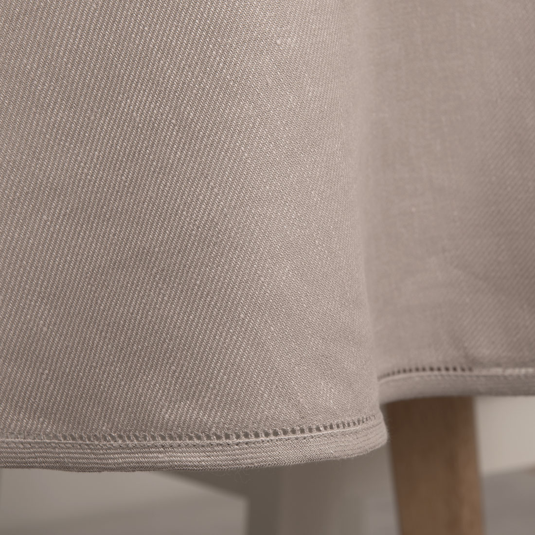 Okrągły (owalny) lniano – bawełniany obrus wytkany splotem skośnym z przędzy jasnoróżowej i szarej o piaskowym odcieniu. Brzeg obrusu wykończono lamówką i ozdobiono rzędem mereżki. Do tego delikatnego w barwie obrusu można dopasować najróżniejsze serwetki z naszej kolekcji.