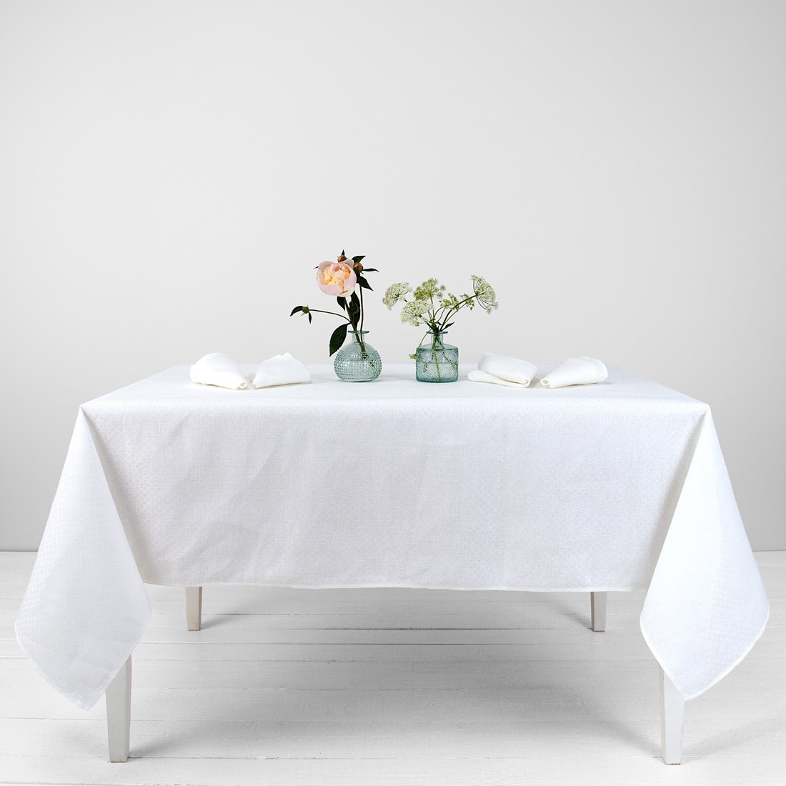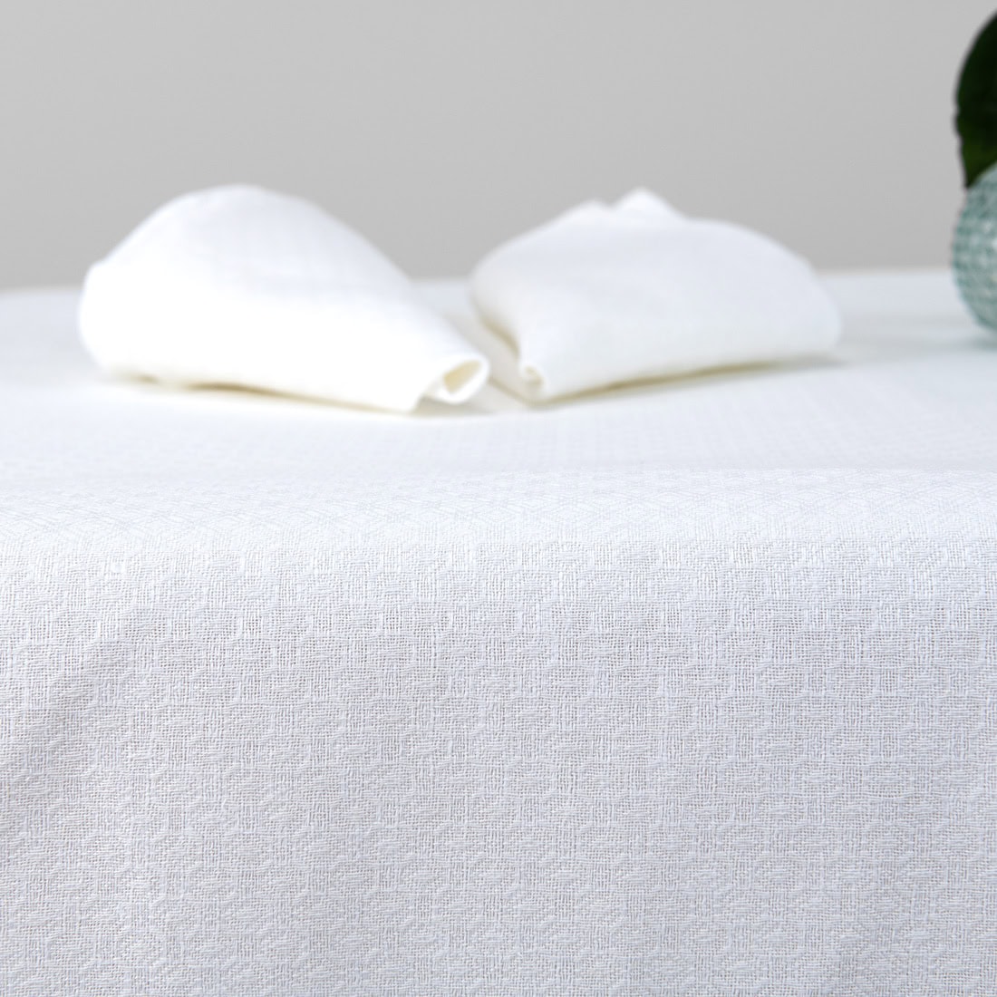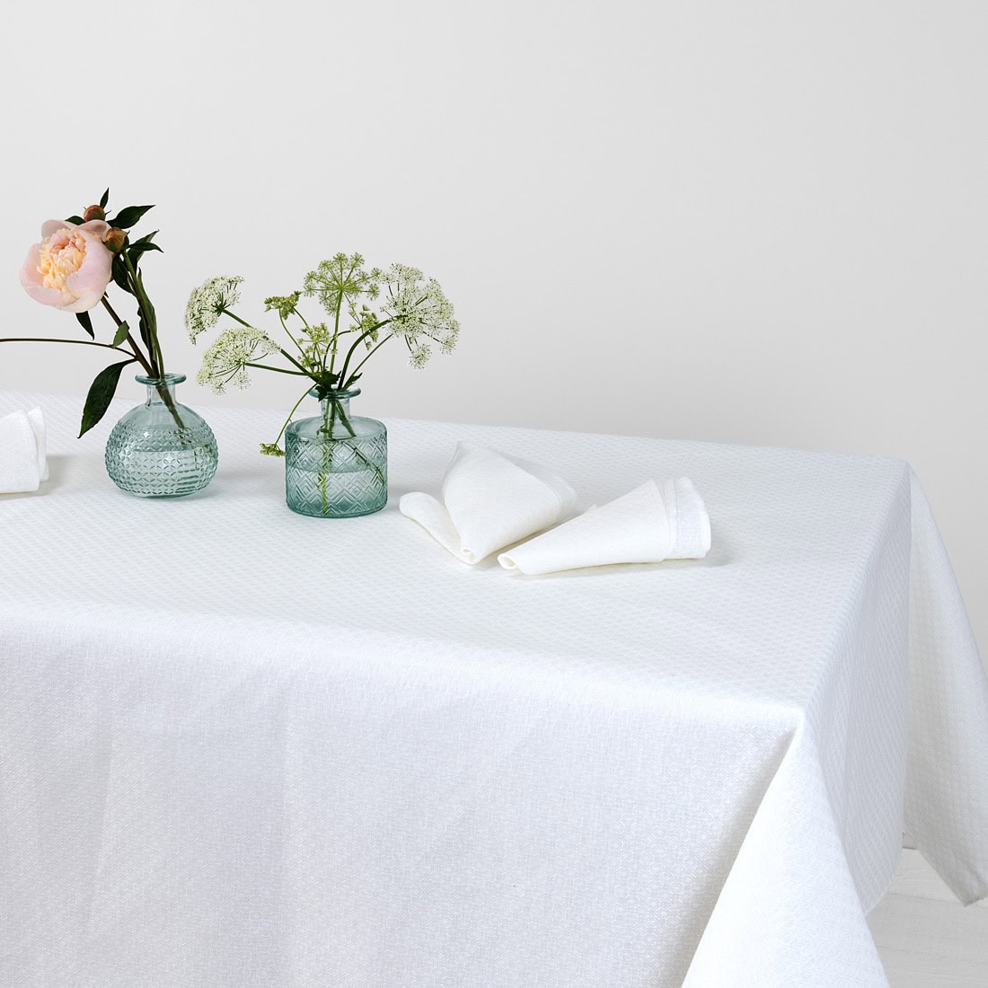 Śnieżnobiały lniano - bawełniany obrus wytkany we wzór rombów. W miejscu styku rombów wzór układa się w geometryczne kwiatki. Śnieżnobiały obrus stanie się ozdobą świątecznego stołu. W naszym sklepie można dobrać serwetki stołowe do kompletu.
