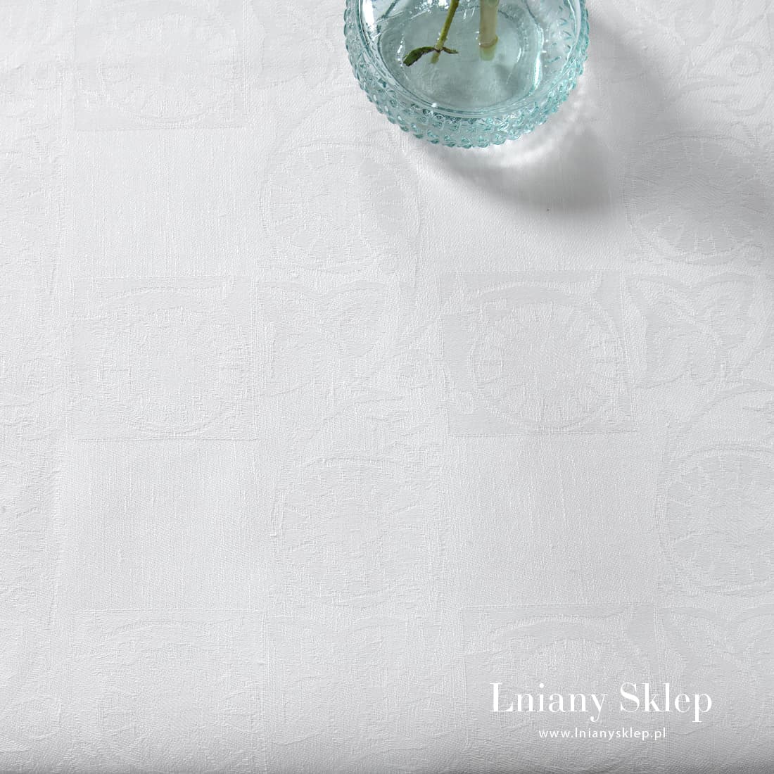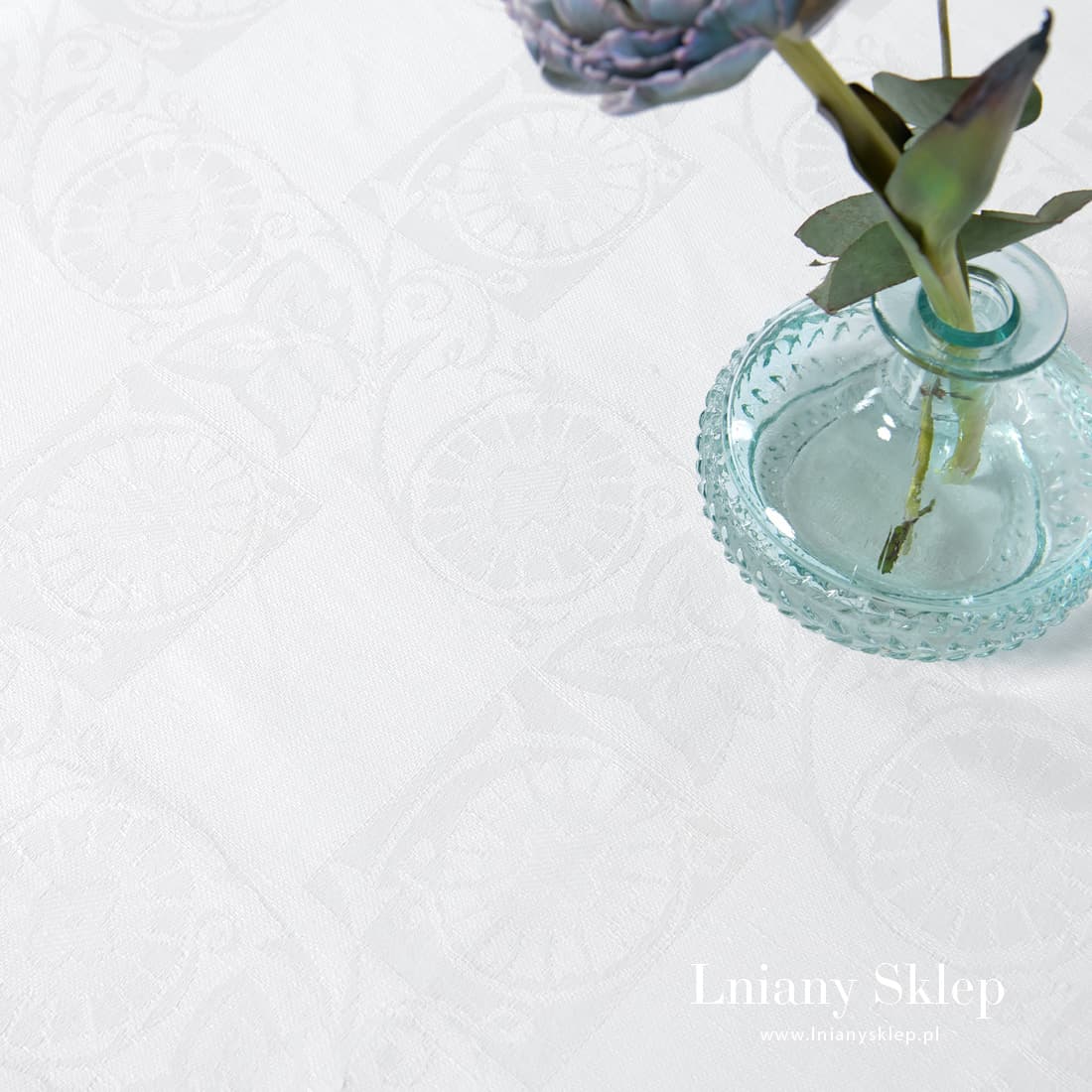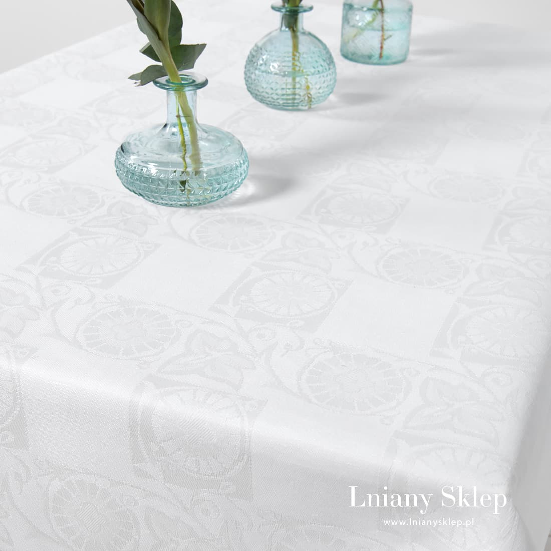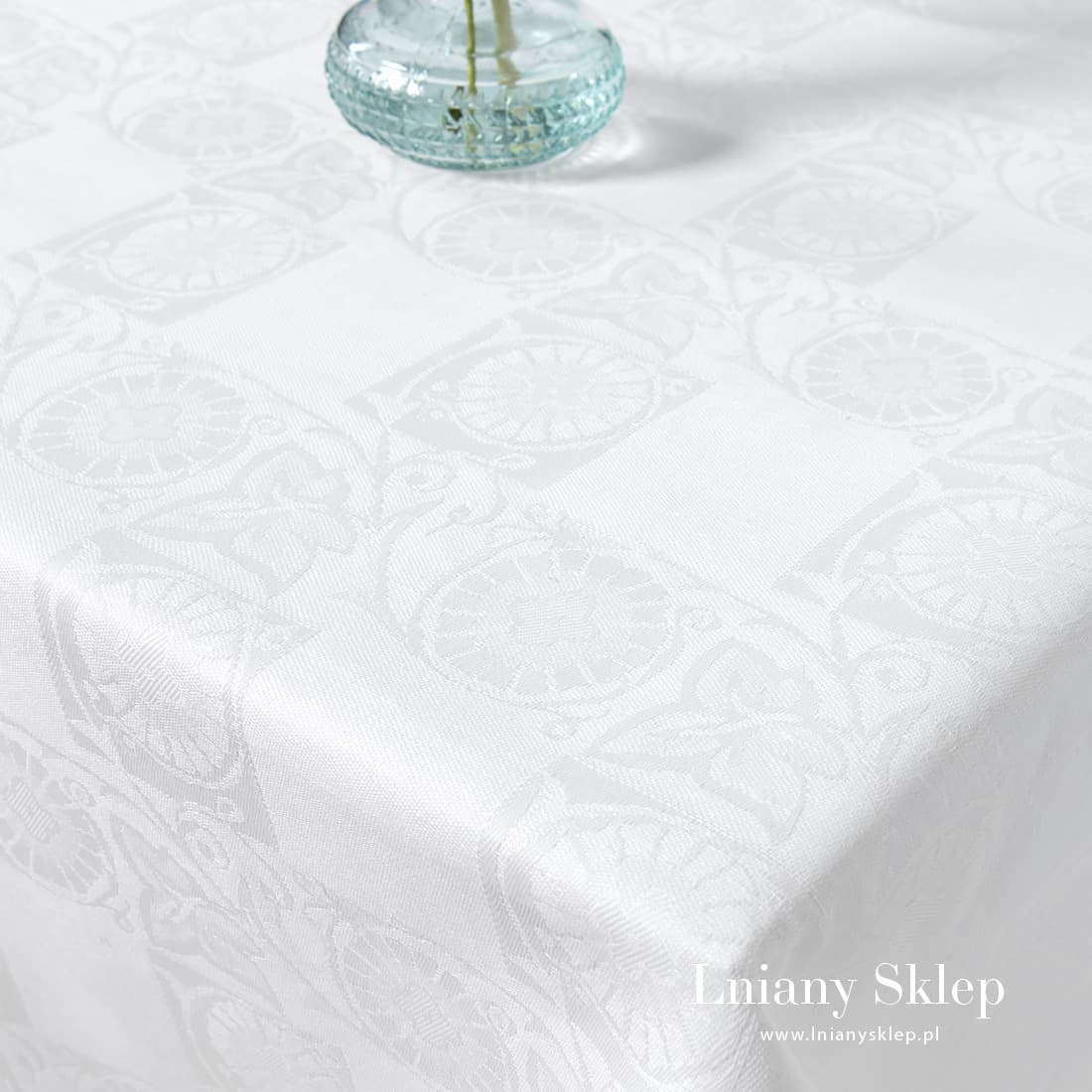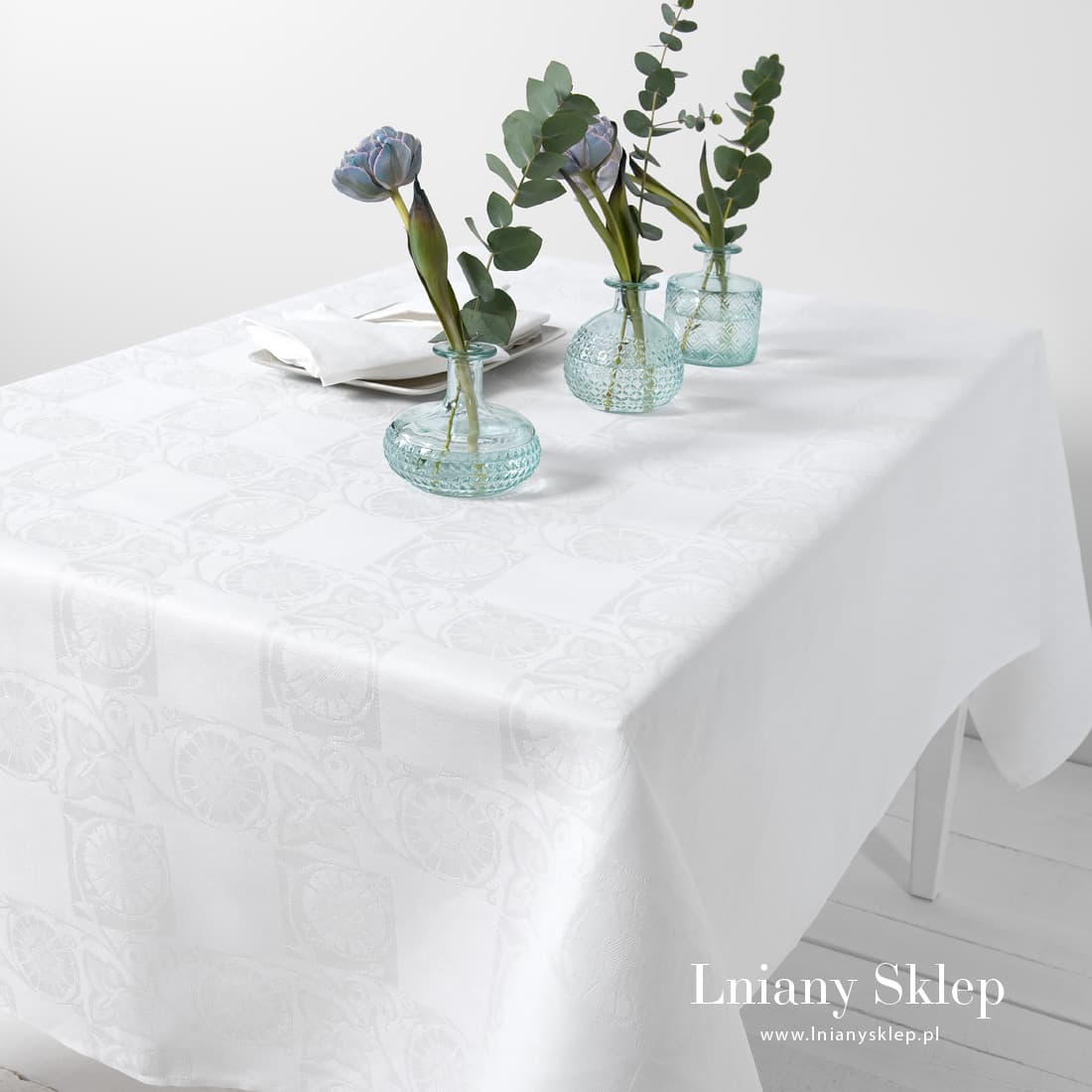 • Śnieżnobiały żakardowy obrus kwadratowy lub prostokątny.