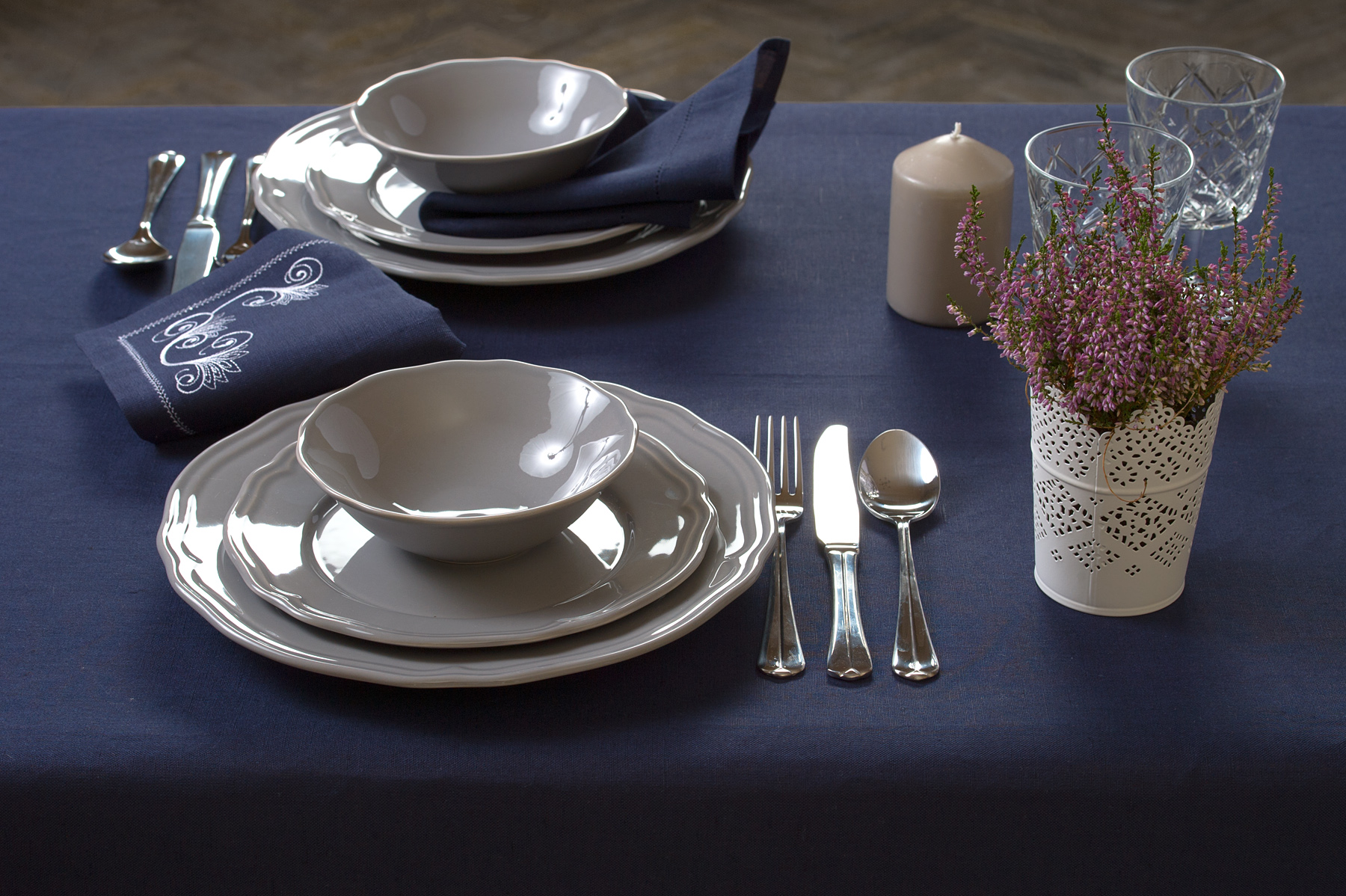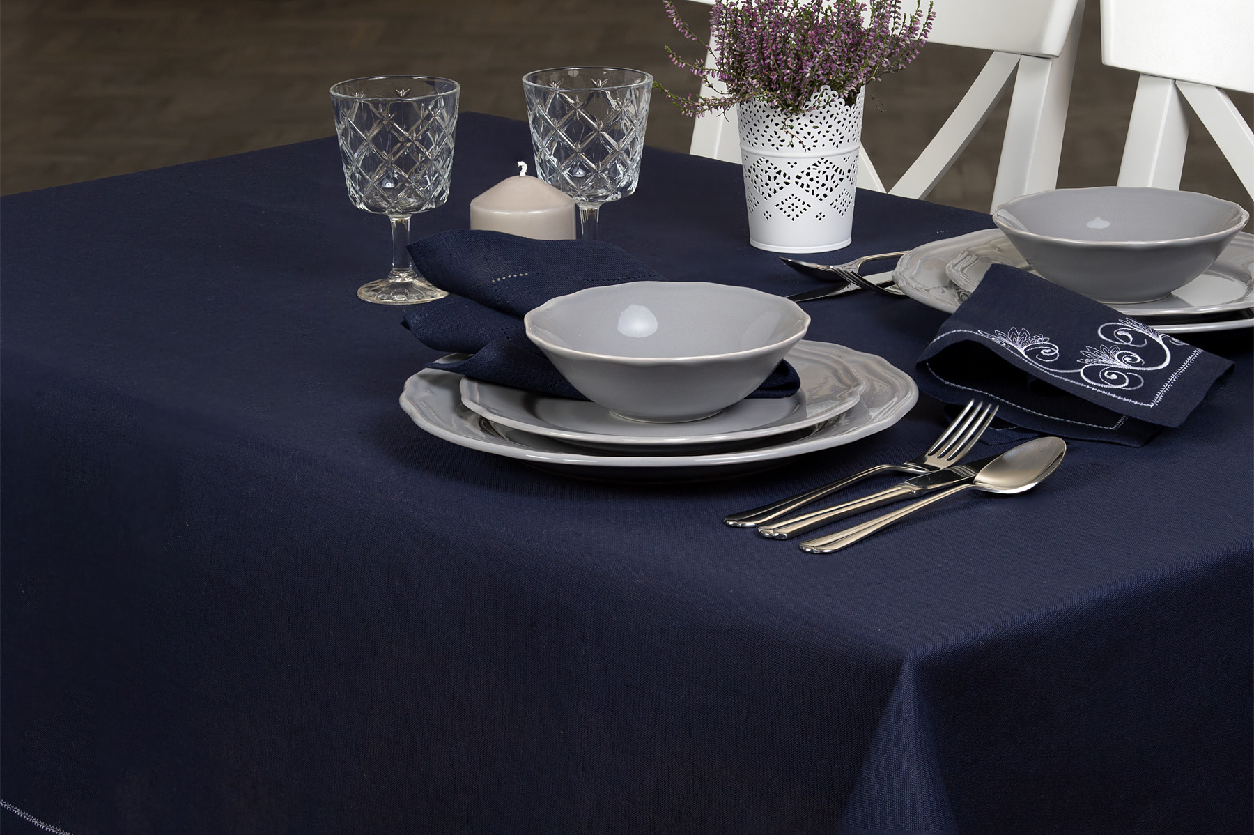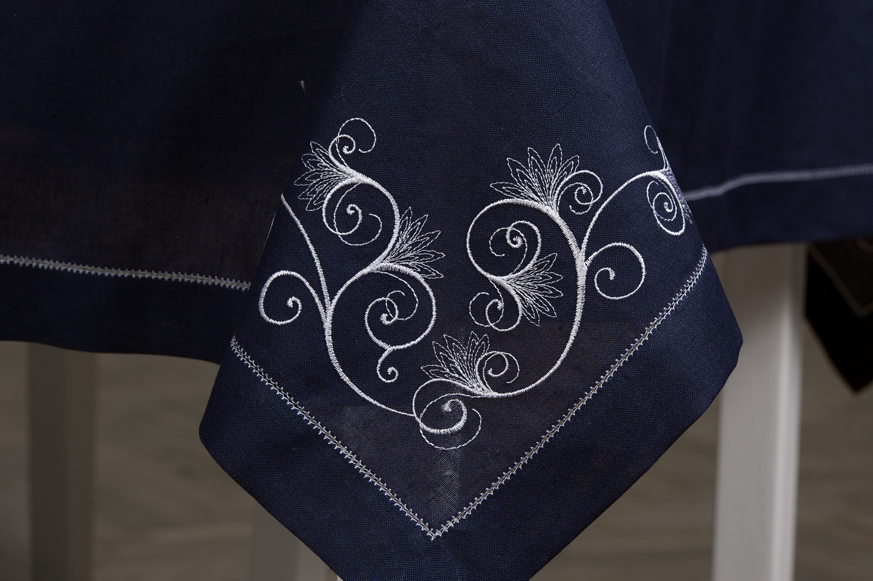 Granatowy lniano - bawełniany obrus ozdobiony w każdym z rogów delikatnym białym haftem. Brzegi obrusu wykończono podwinięciem 4cm i ozdobiono jednym rzędem białej mereżki. Granatowy obrus, ozdobiony lekkim jak szron haftem i mereżką, pięknie ozdobi Twój stół na Święta.