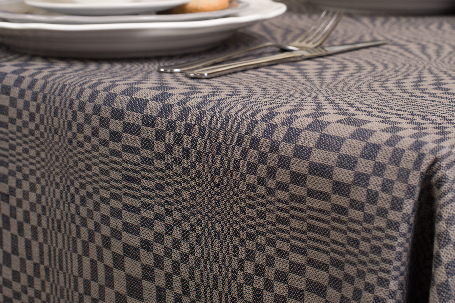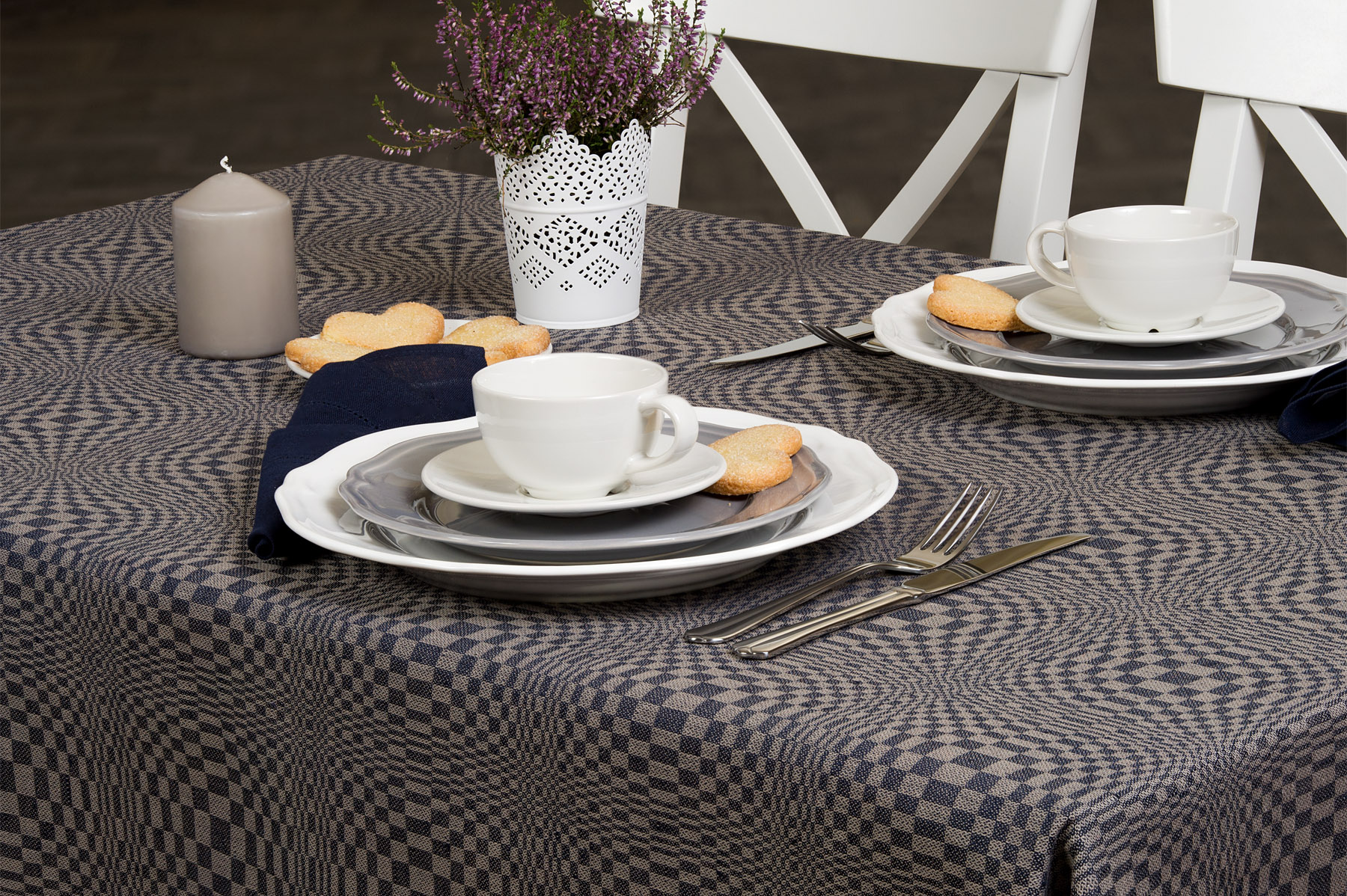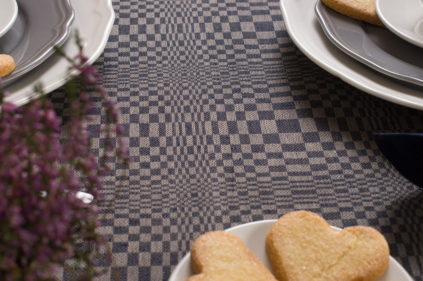 Lniano - bawełniany obrus wytkany w granatowo - szarą kratkę o różnej wielkości. Wybierz na święta obrus wytkany w niecodzienny, geometryczny wzór! Dobierz do obrusu granatowe lub szare, jednokolorowe serwetki lniane, ulubioną zastawę stołową i czekaj na Święta oraz gości!