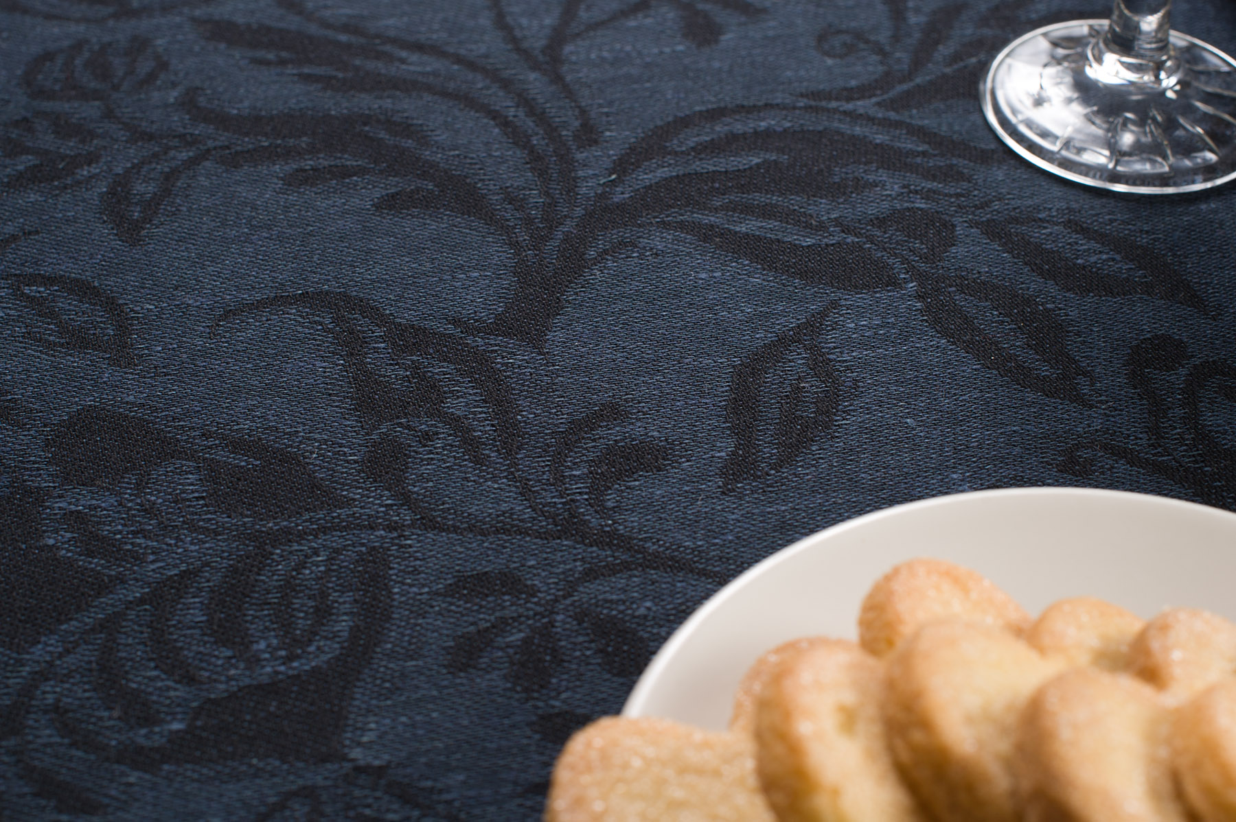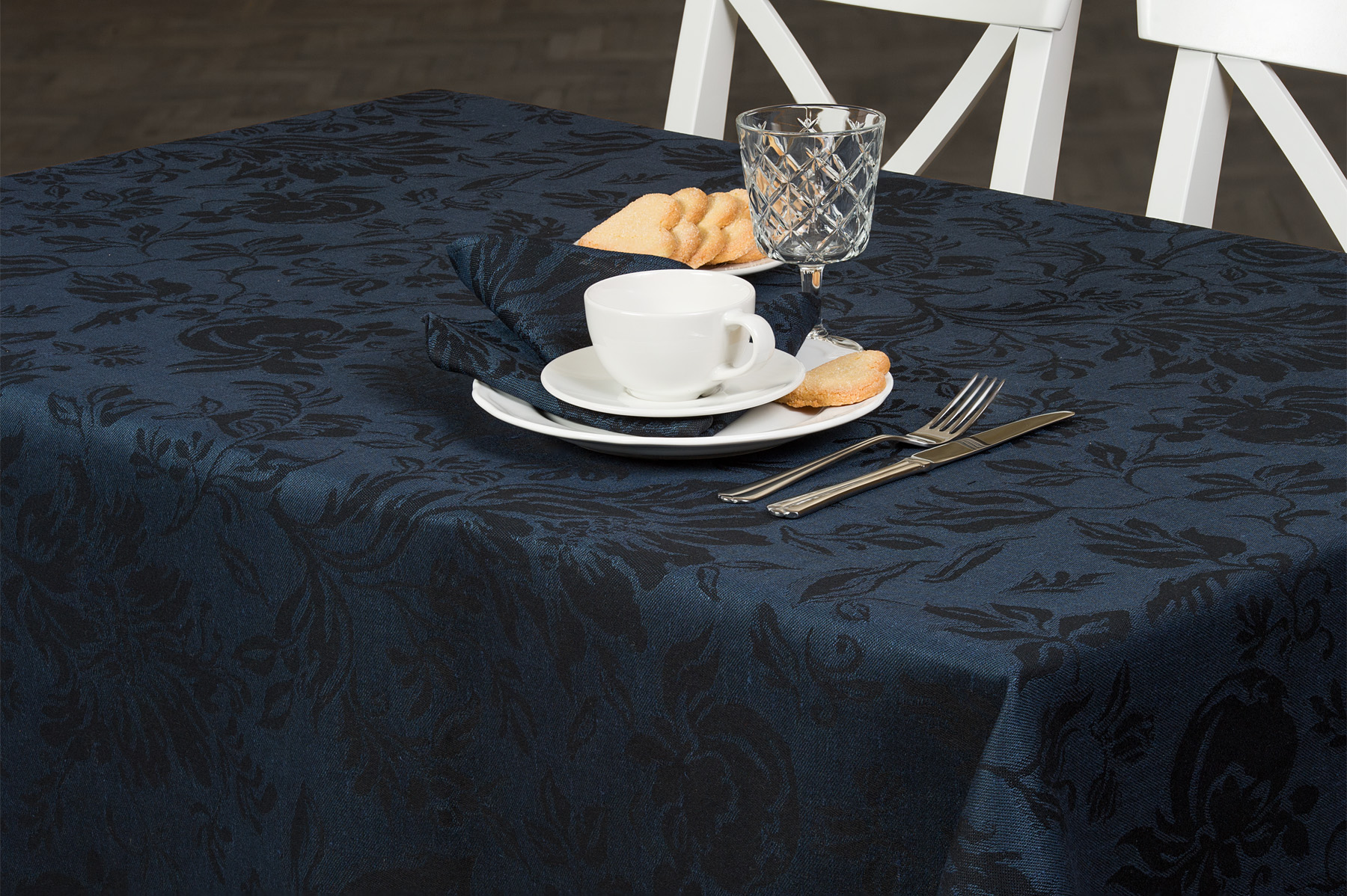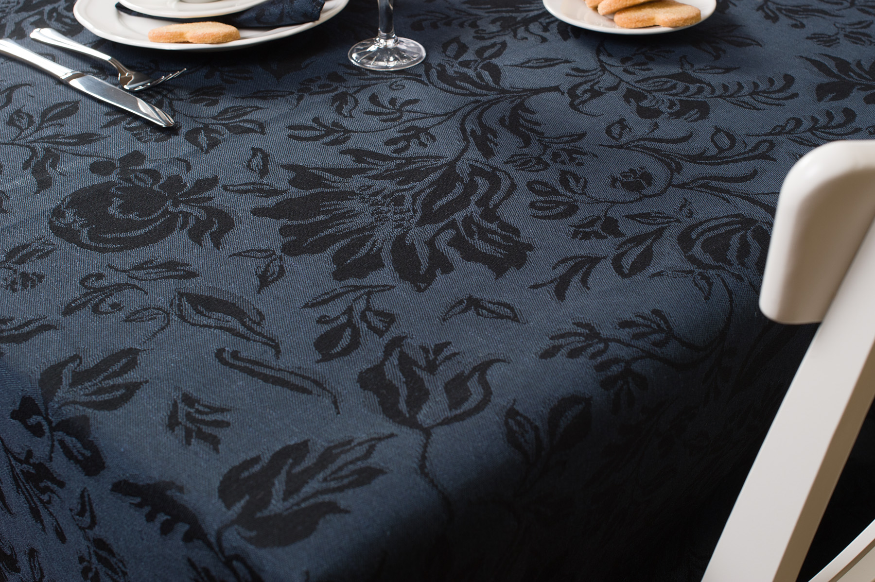 Obrus z żakardowej tkaniny lniano - bawełnianej wytkanej z przędzy granatowej i czarnej w przepiękne, barokowe kwiaty. Wykwintny obrus stanie się niewątpliwą ozdobą eleganckiego, świątecznego wnętrza. Do kompletu polecamy serwetki stołowe z identycznej tkaniny.