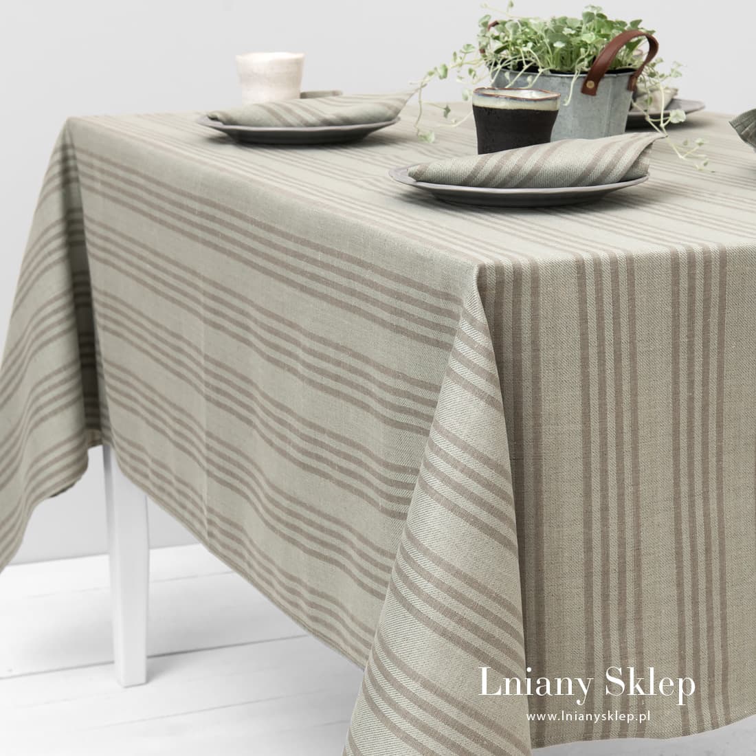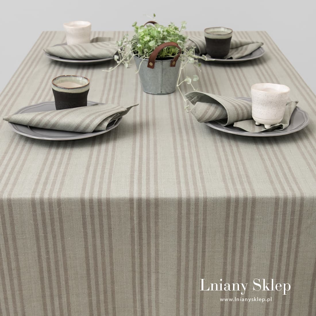 Zielony obrus z tkaniny lniano - bawełnianej. Tkanina została wytkana splotem skośnym w paski z przędzy zielonkawej, zielonej o szarym odcieniu i niebarwionej (szarej o piaskowym odcieniu). Stonowane barwy pozwolą nakryć tym obrusem stół na wiele okazji. Dopasuj do tego obrusu serwetki z naszej kolekcji GRASA.