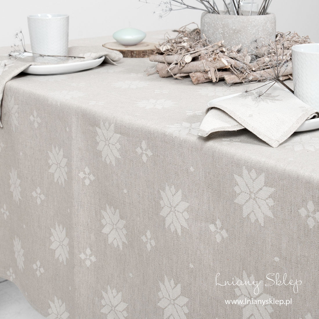 Lniano – bawełniany obrus w gwiazdki uszyty został z tkaniny żakardowej wytkanej w stylizowane śnieżynki – gwiazdy z przędzy białej i szarej niebarwionej (lekko piaskowej). Klasyczny obrus na zimowe święta. W kolekcji mamy serwetki do kompletu.