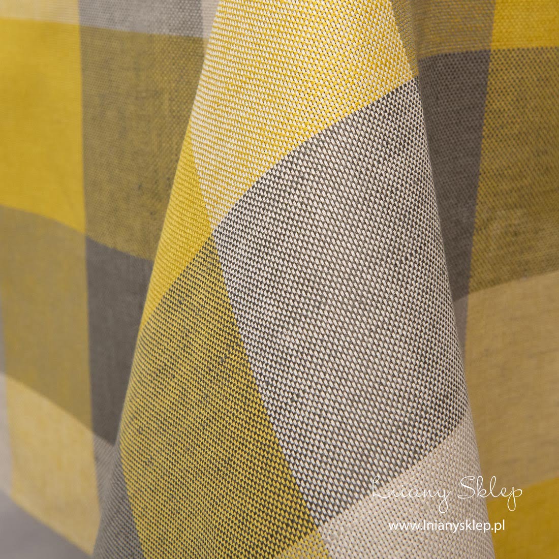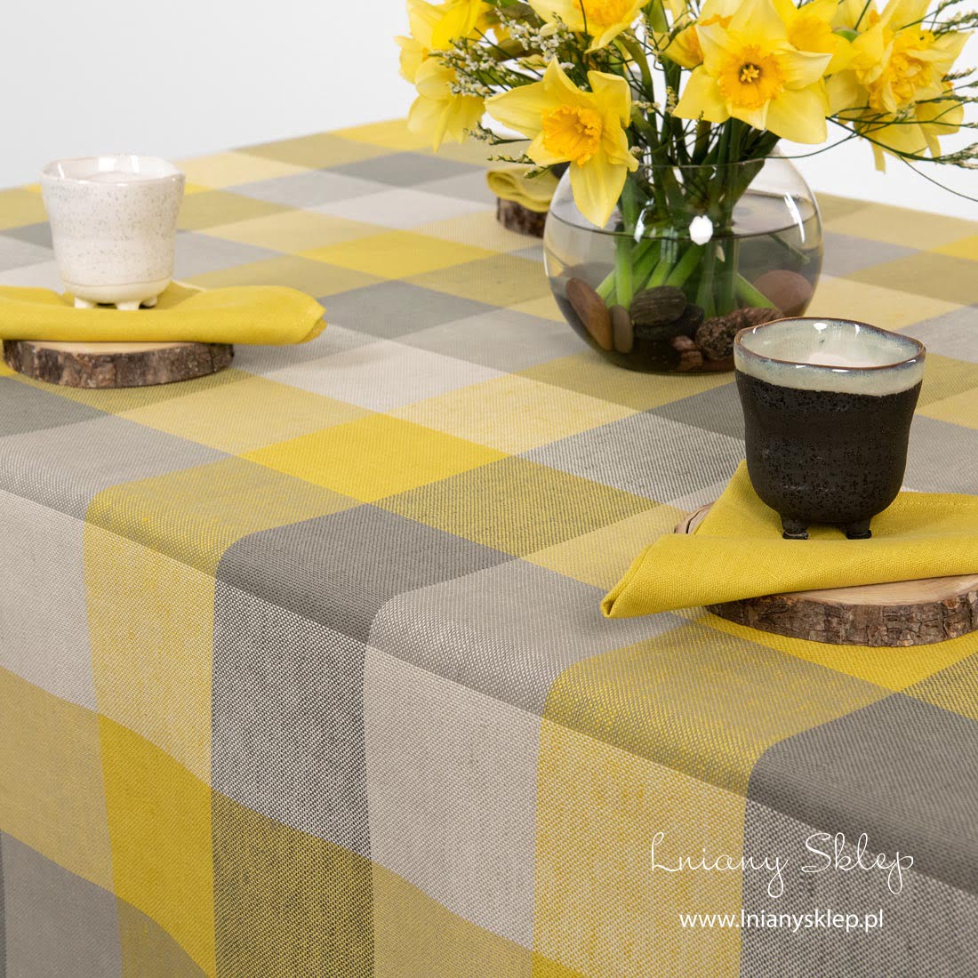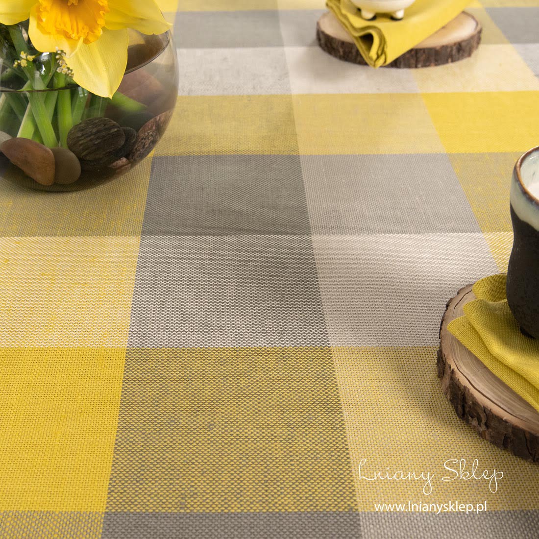 Lniano – bawełniany obrus w żółto – szarą kratkę. Wielkość kratki: 10 x 10 cm. Kratki: białe, żółte, szare o zielonym odcieniu, jasnoszare. Duet szarej i żółtej barw – przyciąga wzrok! Chcesz prawdziwej wiosny na stole? Dobierz do kompletu jednobarwne serwetki z żółtej jaskrawej tkaniny.