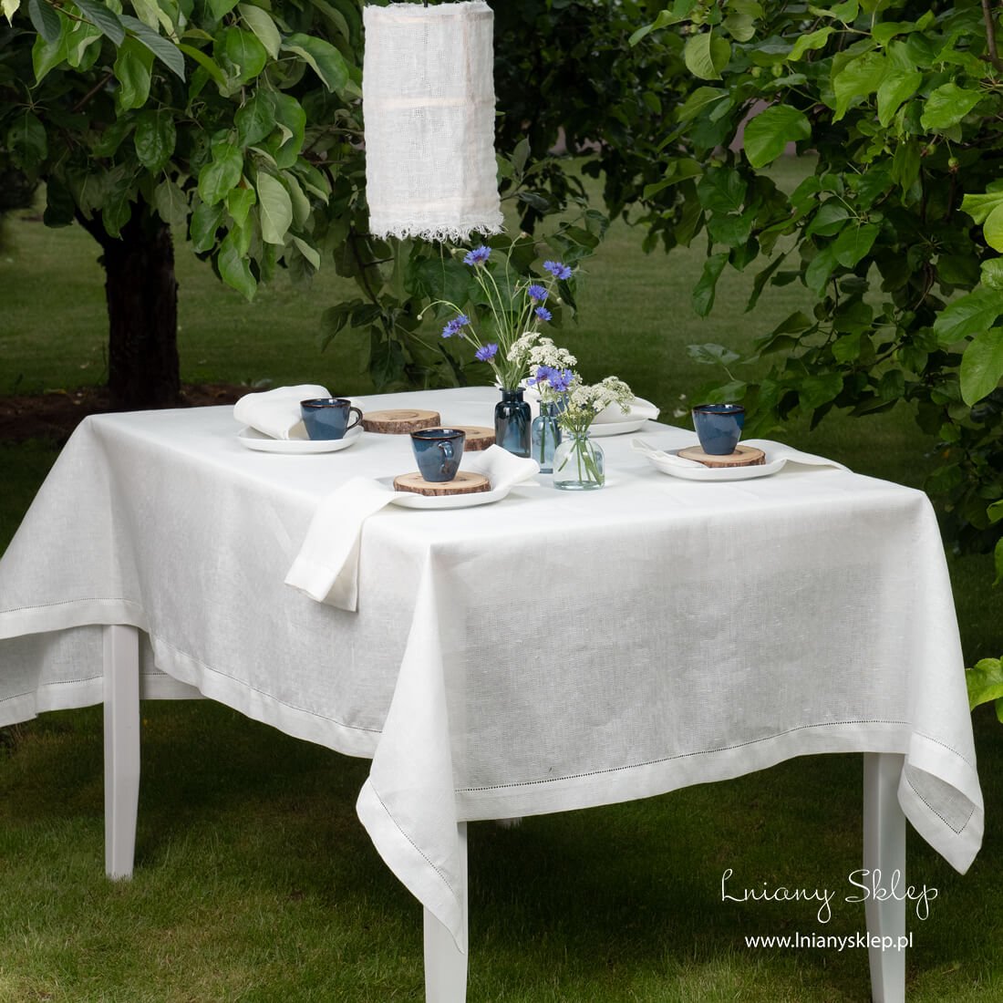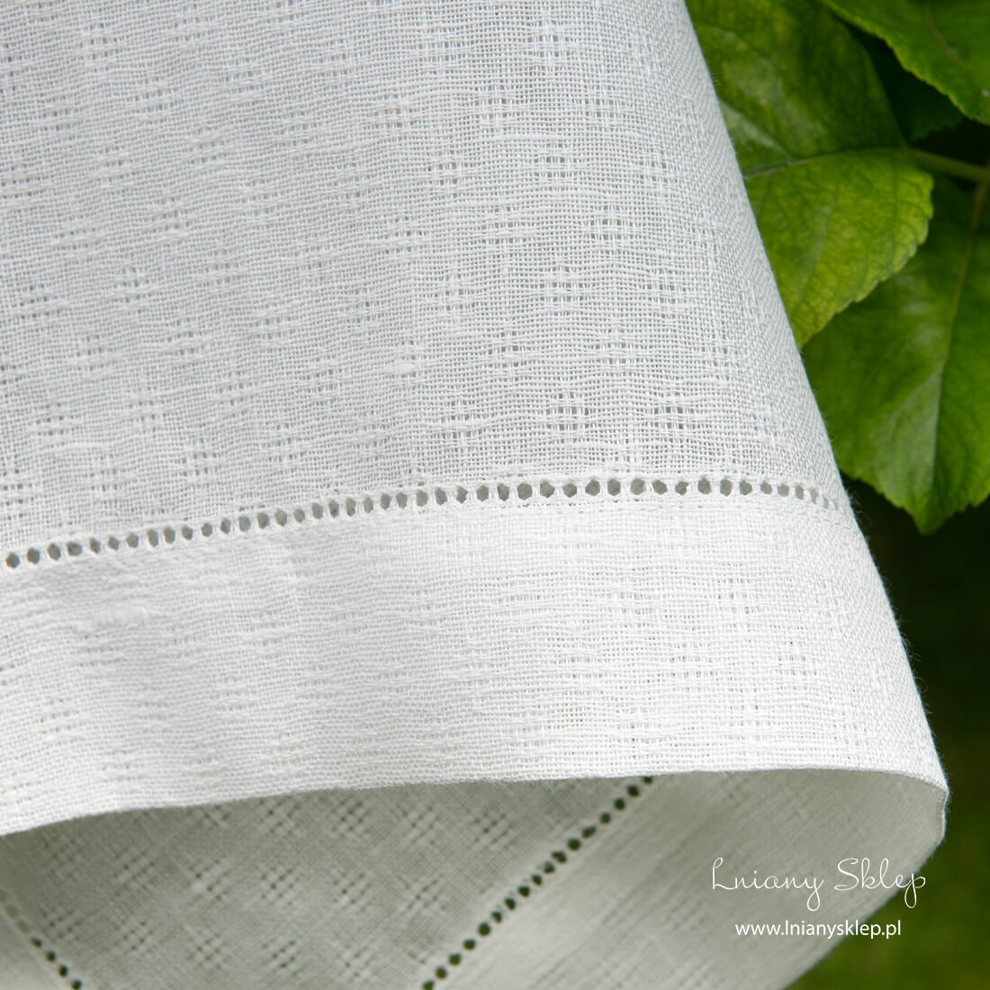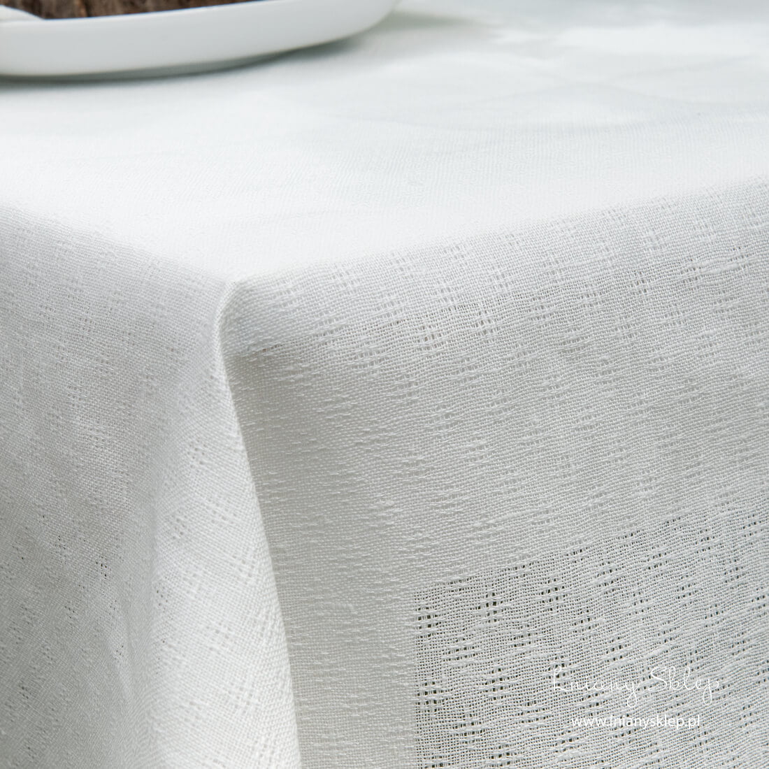 Lekki, mlecznobiały (żółtawy) obrus wytkano we wzór drobnej ażurowej krateczki. W odległości 4cm od brzegu obrus ozdobiono 1 rzędem delikatnej mereżki. Tradycyjny, delikatnie ozdobiony obrus, będzie ozdobą zarówno codziennego jak i świątecznego stołu. W naszej kolekcji można znaleźć serwetki stołowe dopasowane do tego obrusu.