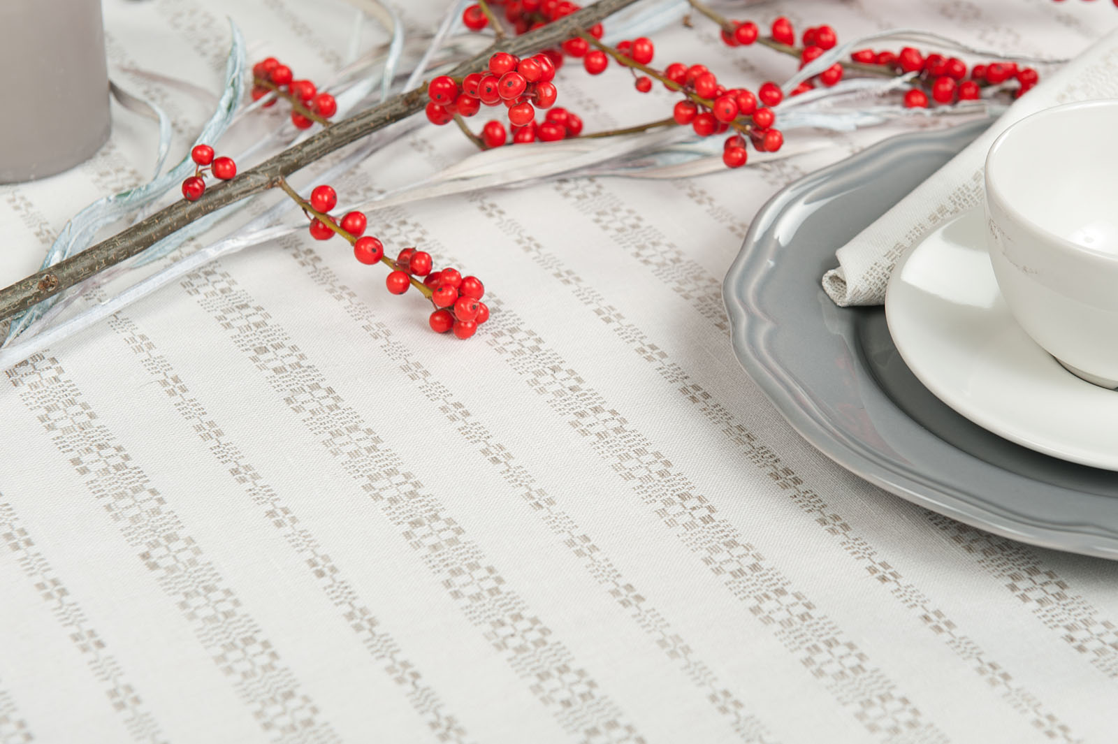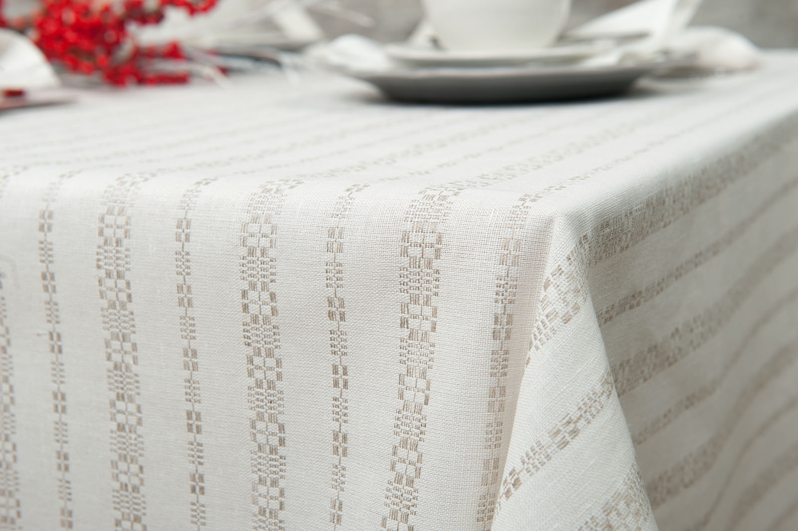 Mlecznobiały (lekko żółtawy) obrus z tkaniny lniano - bawełnianej wytkanej w pasy, na które układają się ustawione w szeregu szare - wytkane z niebarwionej przędzy lnianej - geometryczne wzorki. W naszej kolekcji znajdziesz serwetki stołowe z identycznej tkaniny.
