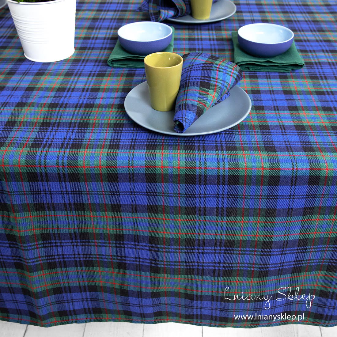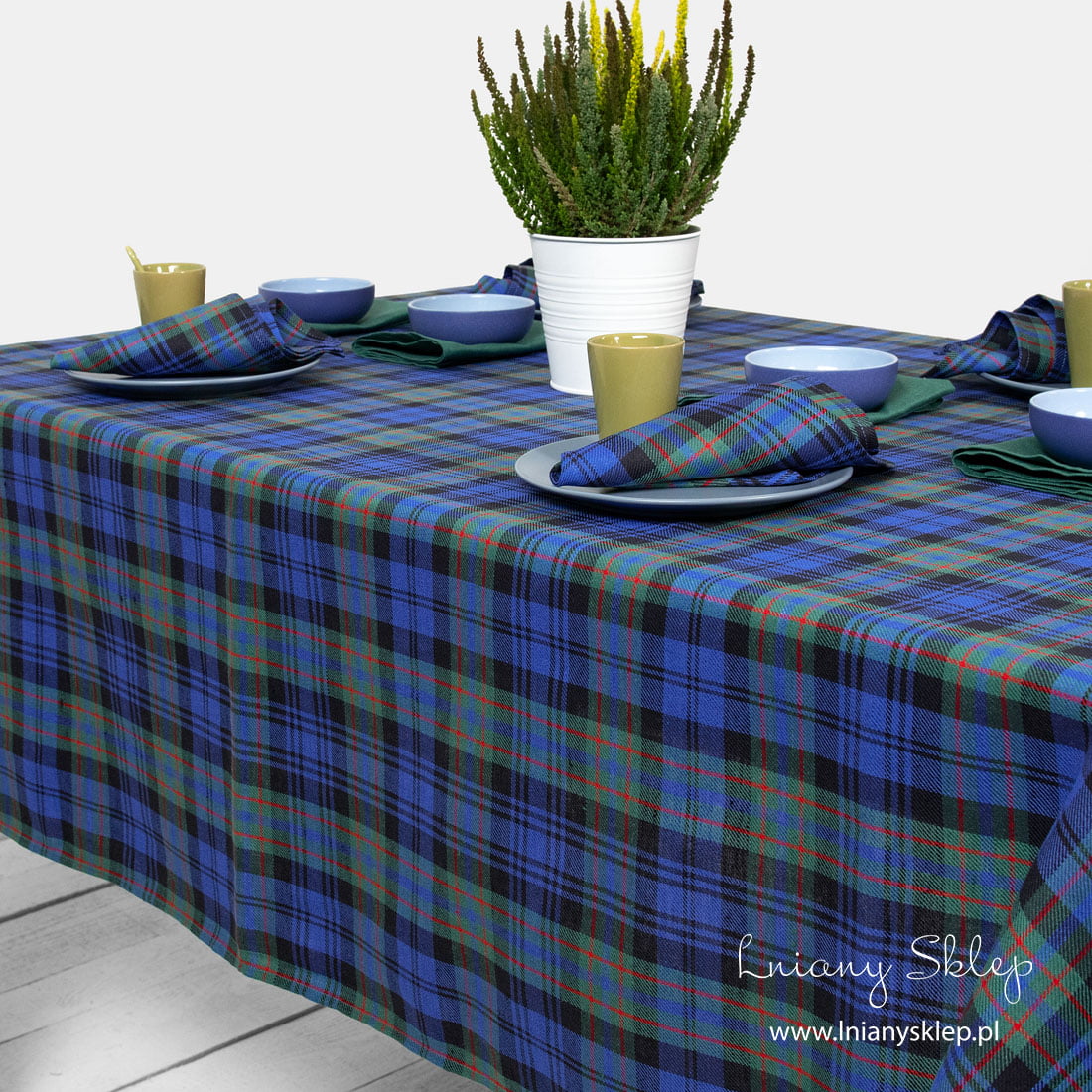 Lniano - bawełniany obrus w kratkę niebieską i zieloną wykonany został z tkaniny wytkanej splotem skośnym. Do kompletu można dobrać identyczne albo jednobarwne zielone serwetki. Obrus ozdobiony motywem szkockiej kratki pięknie będzie się prezentować na świątecznym stole.