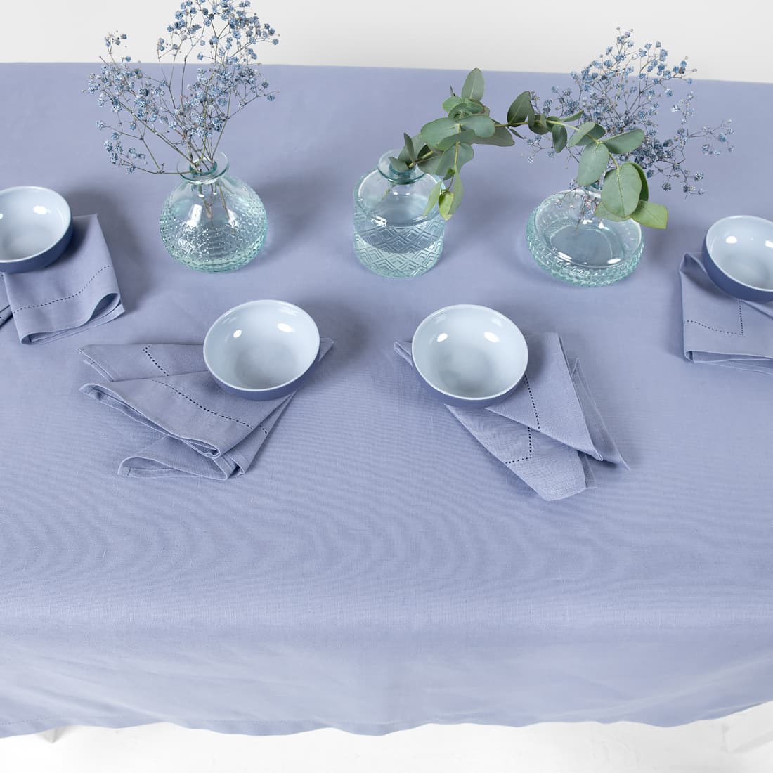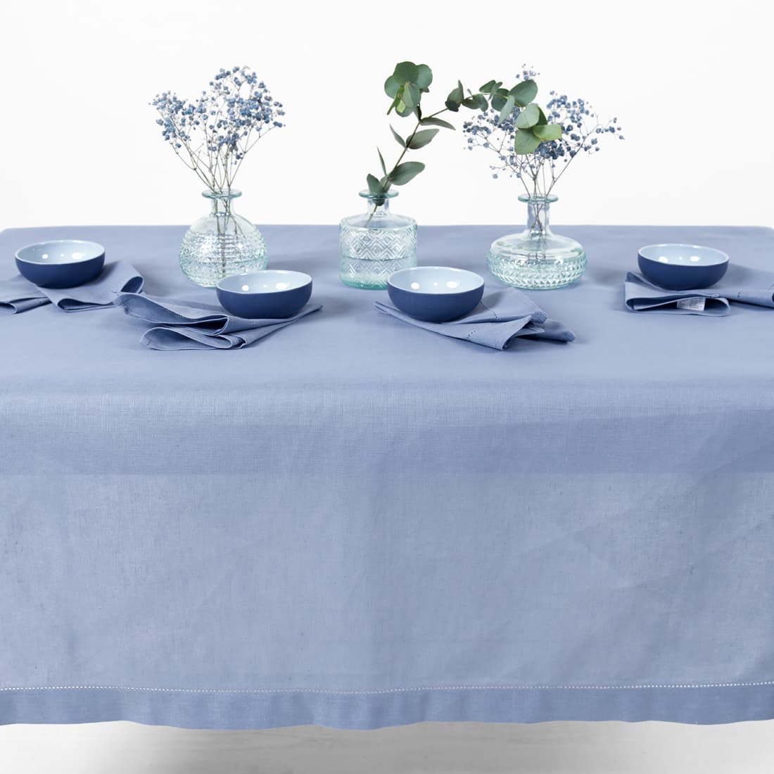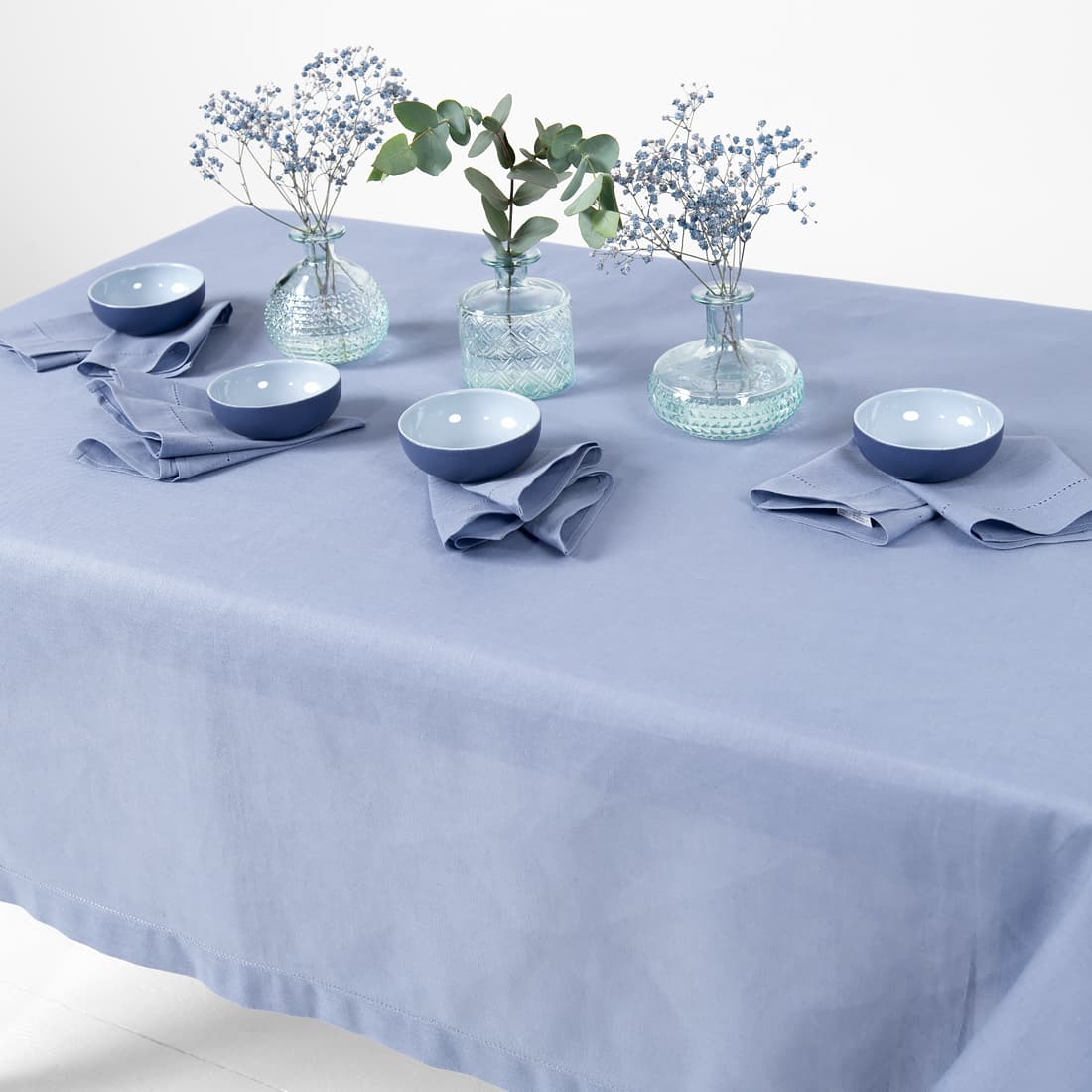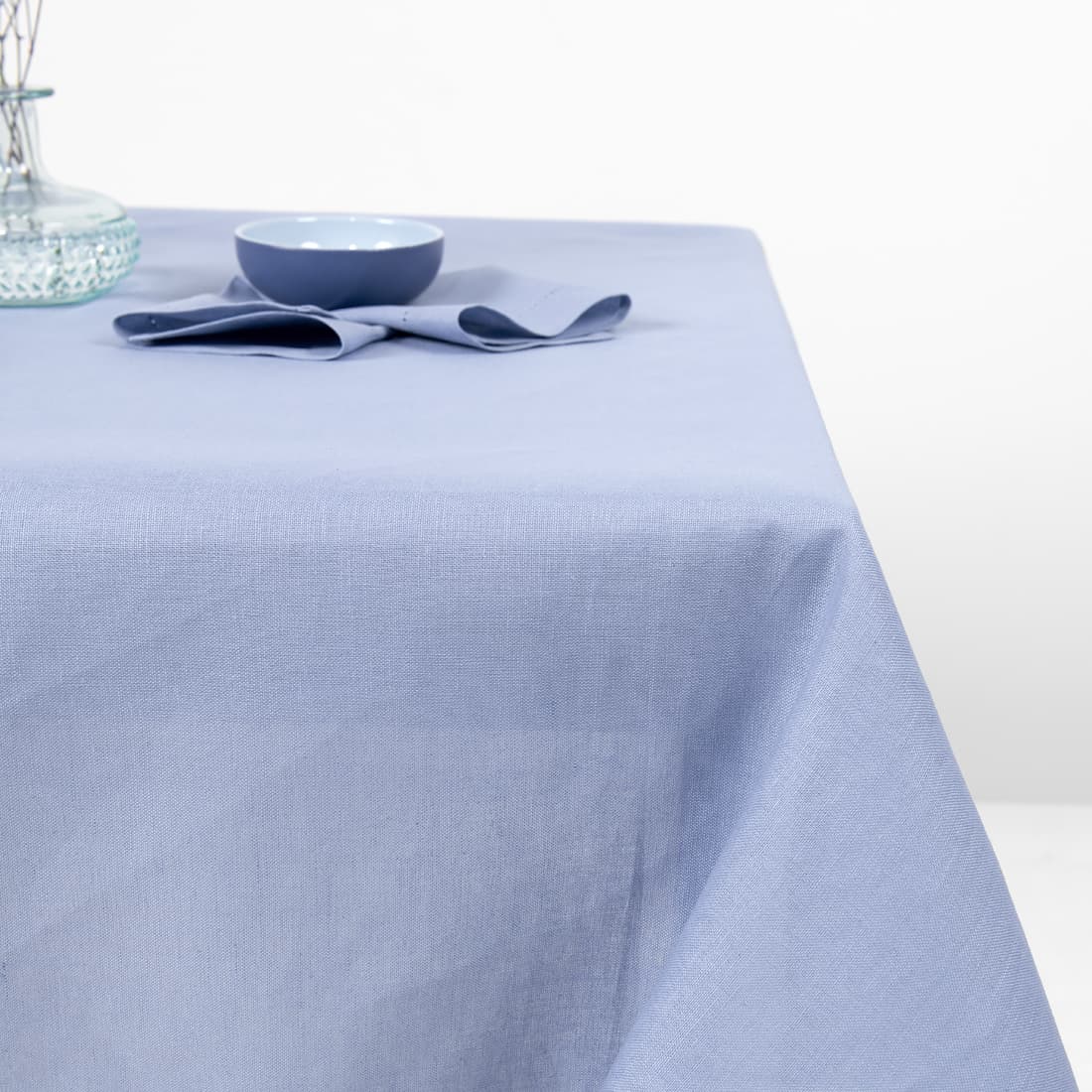 • Gładko wytkany niebieski obrus.