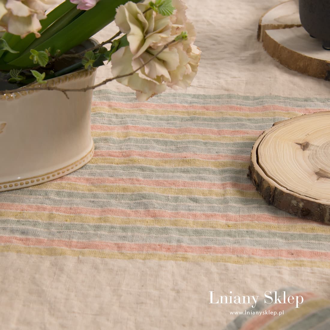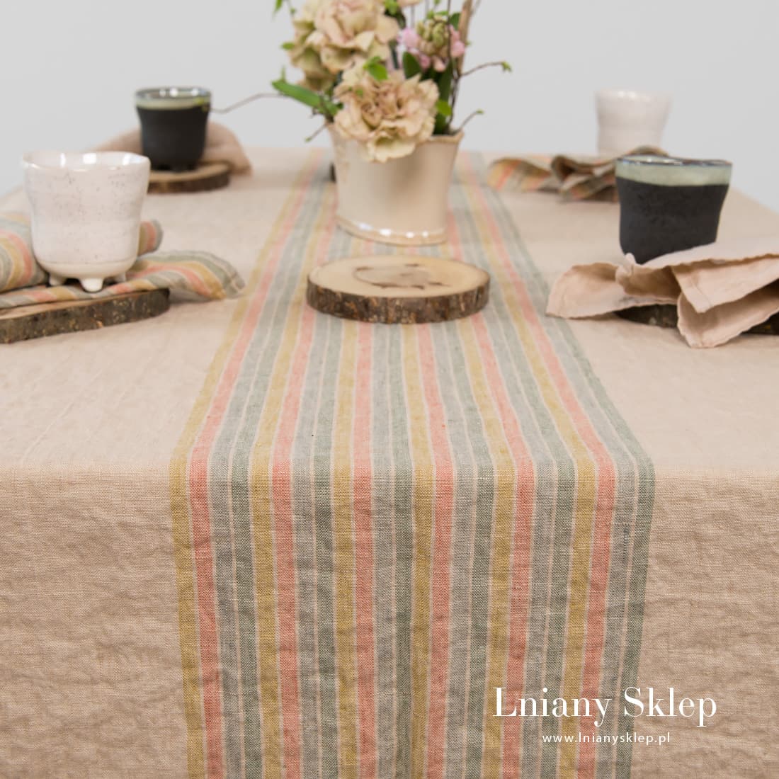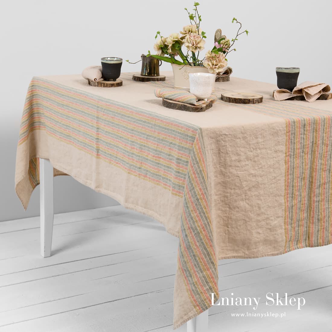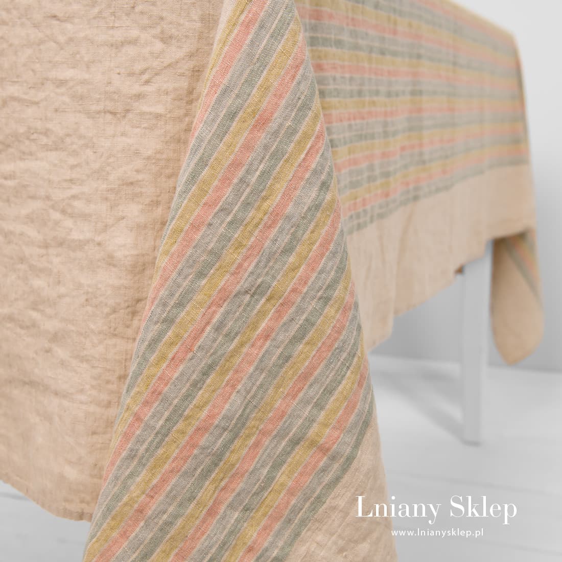 Beżowy obrus w pasy z tkaniny 100% lnianej. Tkanina wytkana została w zgrupowania pasków z przędzy piaskowej, zielonej, żółtawej (kolor imbiru), szarej, czerwonawej. Przed szyciem tkaninę poddano praniu, dlatego obrus jest lekko gnieciony i nie wymaga prasowania – pasuje na co dzień i na święta, ponieważ len gnieciony jest dziś absolutnie na topie! Dopasuj do tego obrusu serwetki MEIZA lub MAIZA z naszej kolekcji.