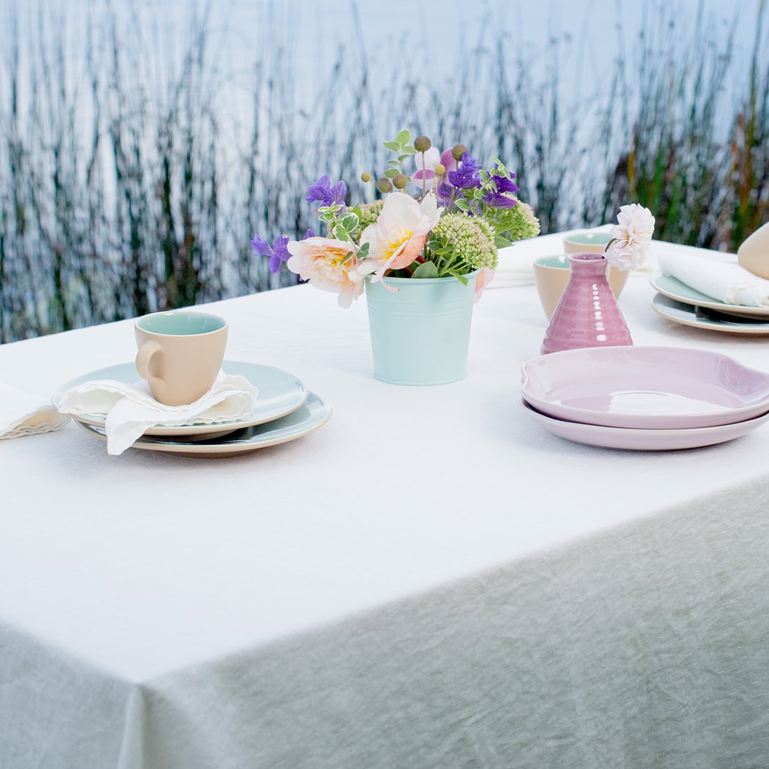 Obrus z mlecznobiałej (lekko żółtawej) tkaniny 100% lnianej. W procesie produkcji tkaninę poddano praniu, dlatego obrus na stałe uzyskał gniecioną fakturę, jest miękki w dotyku, nie wymaga prasowania. Obrus wykonany w duchu najnowszych tendencji mody – prany len podbija serca projektantów!