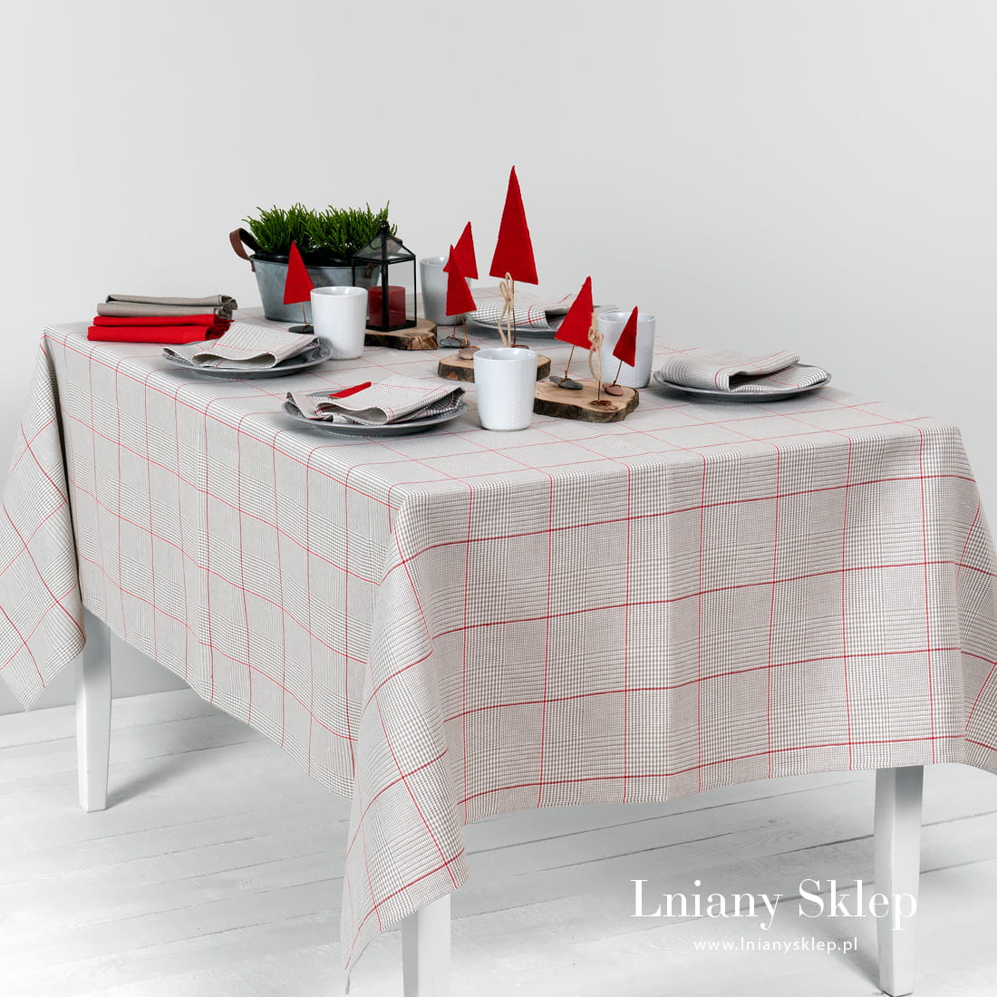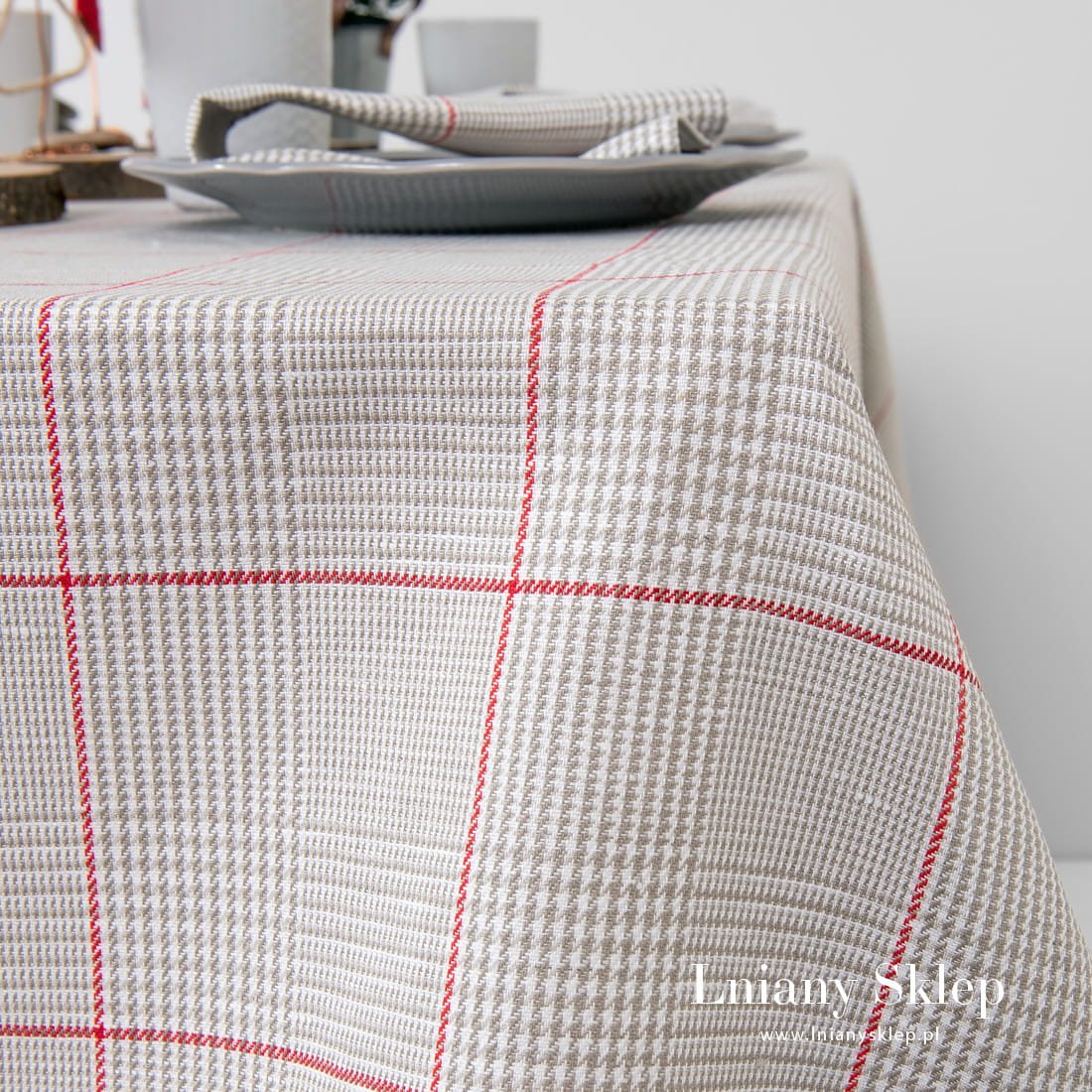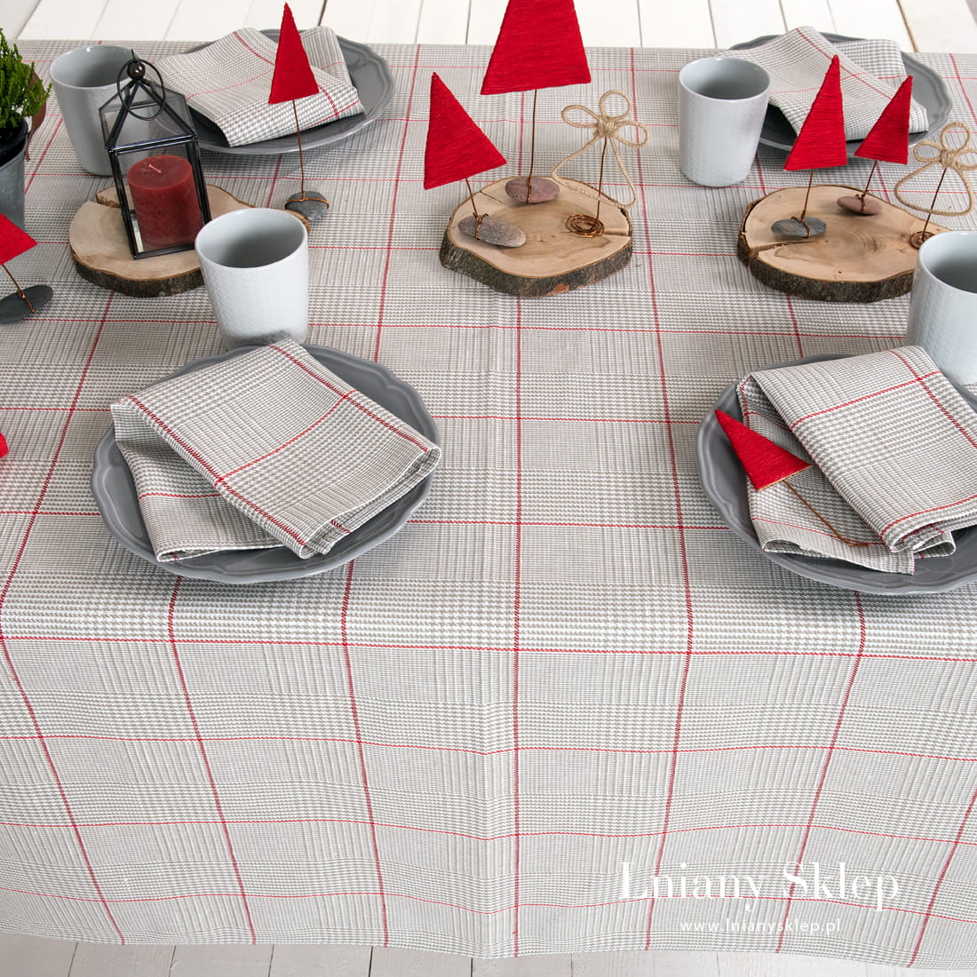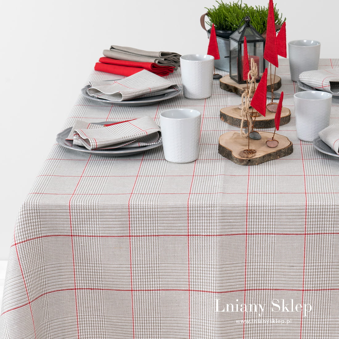 Lniany obrus szary w kratkę NATA z tkaniny wytkanej splotem skośnym z przędzy lnianej oraz bawełnianej: szarej, mlecznobiałej (lekko żółtawej) i niebarwionej lnianej. Wytkany wzór układa się w rysunek dużej czerwonej kratki. Obrus dostępny w dziewięciu rozmiarach. Szaro – czerwona kolorystyka sprawdzi się na wiele okazji: pasuje na Święta i na różne inne okazji. Mamy w kolekcji dopasowane serwetki.