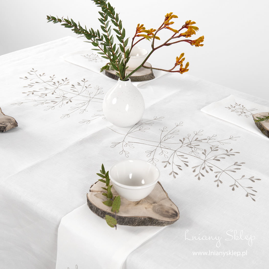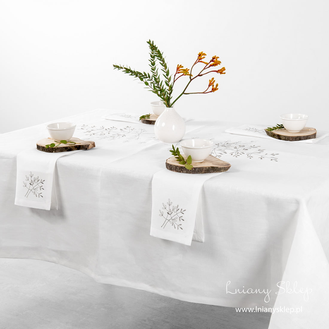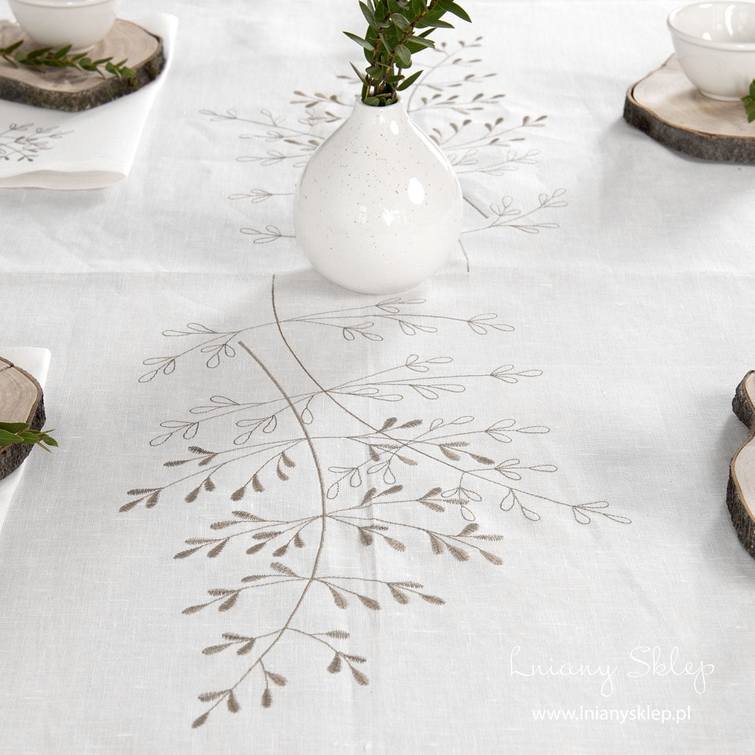 Obrus mlecznobiały (lekko żółtawy), lniany, ozdobiony haftem delikatnych szarych gałązek. Haftem ozdobiliśmy centrum obrusu. W naszej kolekcji znajdziesz serwetki ozdobione identycznym haftem. Odświętnie elegancki obrus na wyjątkowe okazje.