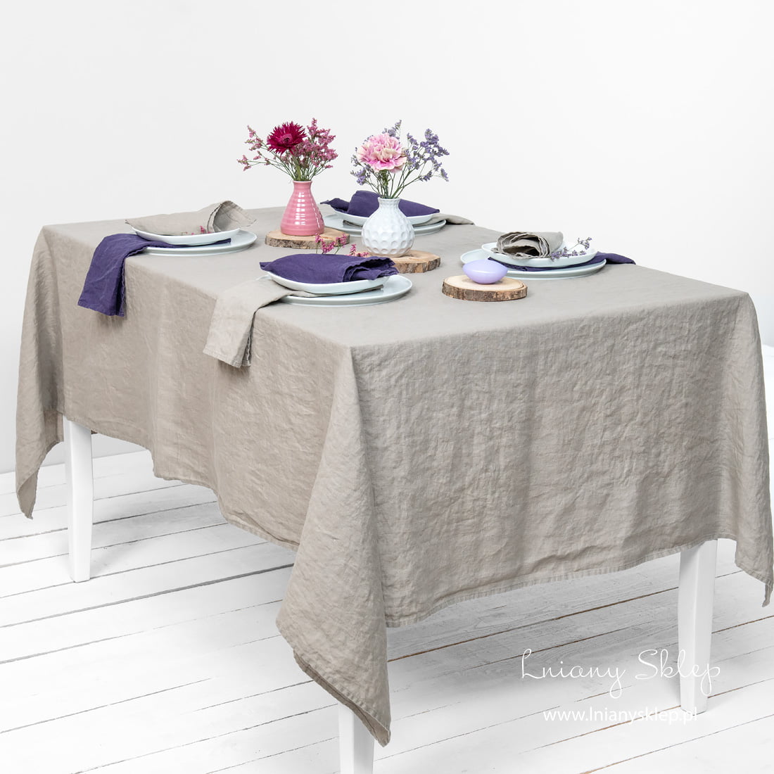 Obrus jasny, szary z pranego lnu. Lekko gnieciony len zaoszczędzi Ci sił i czasu – nie trzeba go prasować. Obrus z niebarwionego lnu może spełnić rolę dziewiczego płótna, które możesz ozdobić dodatkami w takim kolorze, który Ci się najbardziej podoba właśnie dziś, a jutro możesz użyć dodatków w zupełnie innym kolorze – efekt każdego razu będzie zupełnie inny!