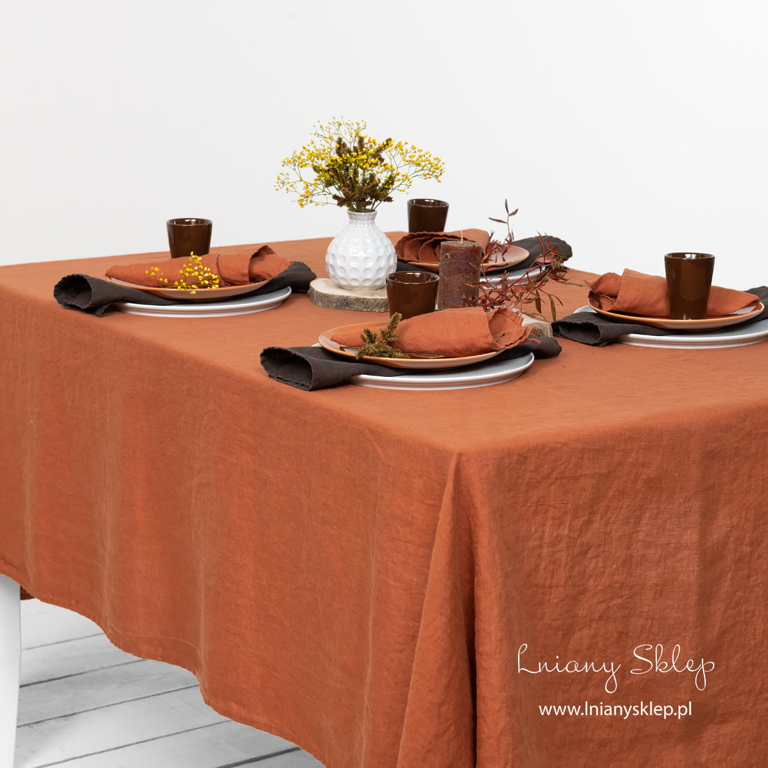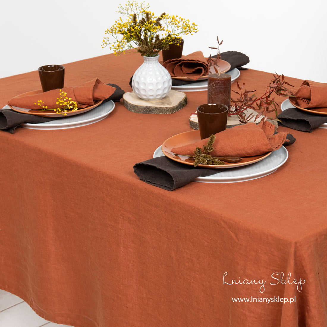 Obrus lniany ciemny pomarańczowy. Odcień tkaniny nieco przypomina czerwoną cegłę. Miękki, prany len zaoszczędzi Ci sił i czasu – nie trzeba go prasować. Dobierz do tego obrusu serwetki z identycznego w kolorze pranego lnu albo kontrastowe - ciemne brązowe. Pobaw się w dobieranie kolorowo zgranych produktów z naszej kolekcji!