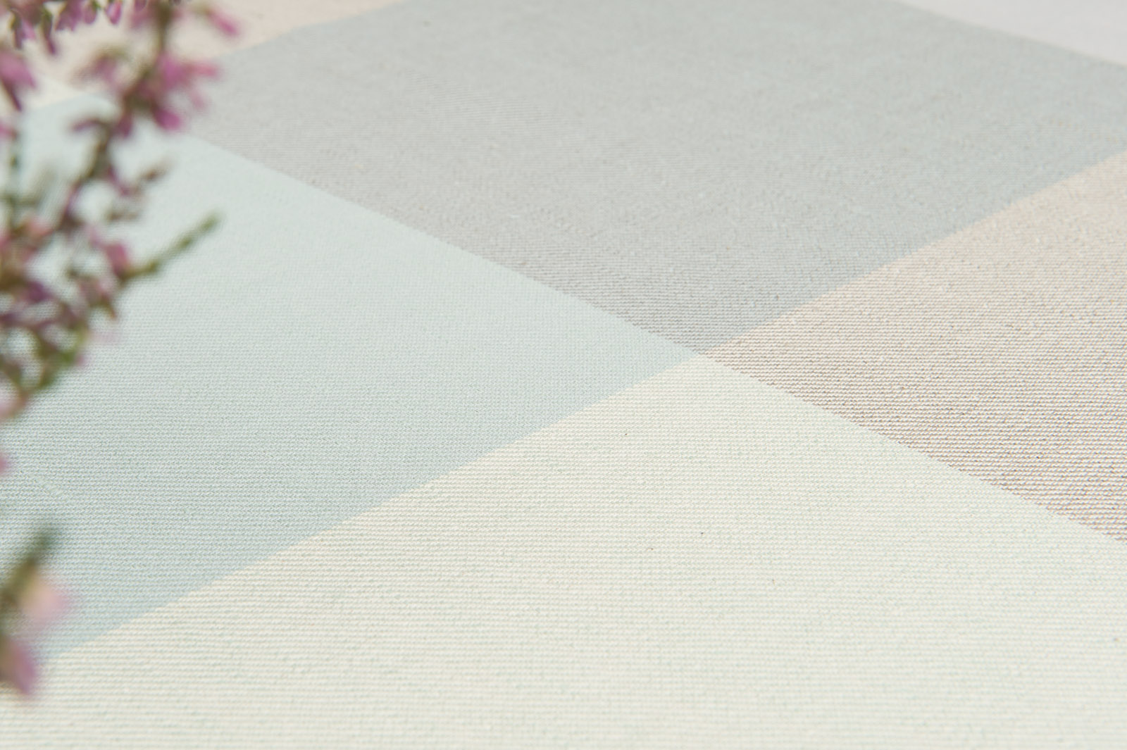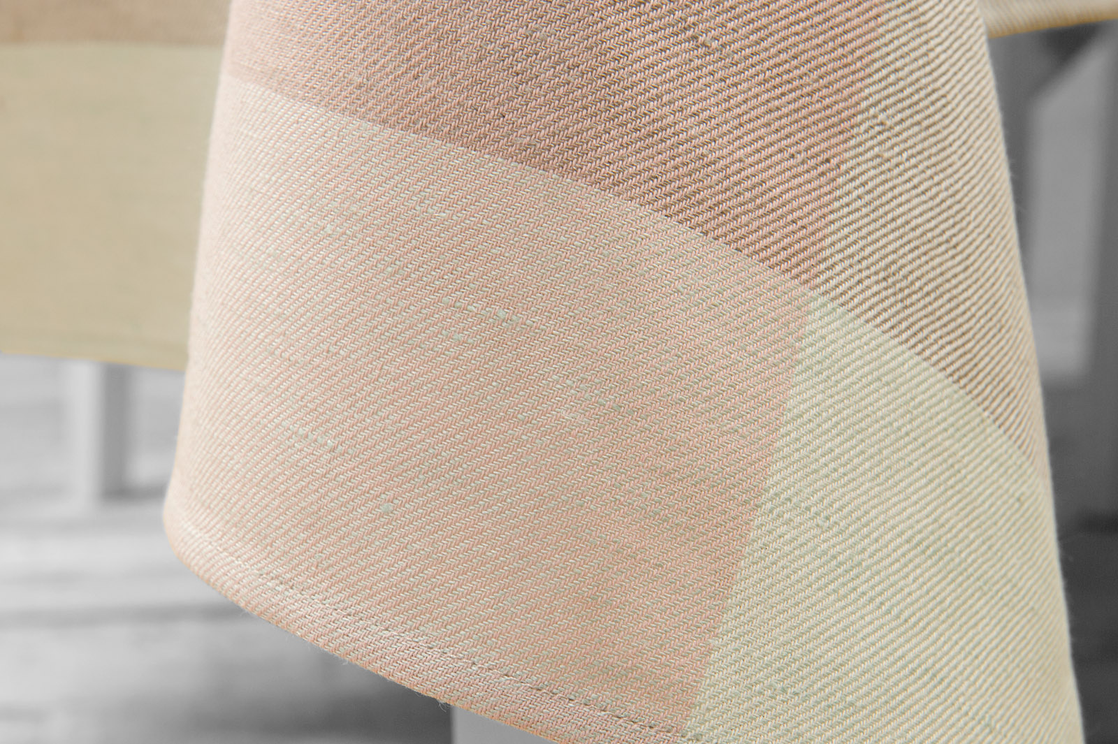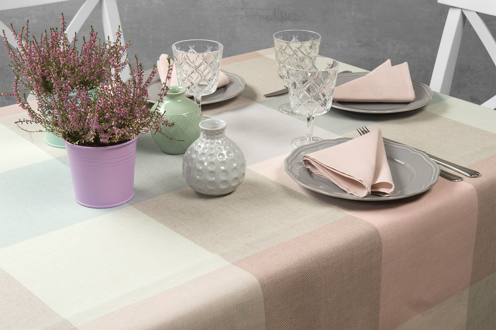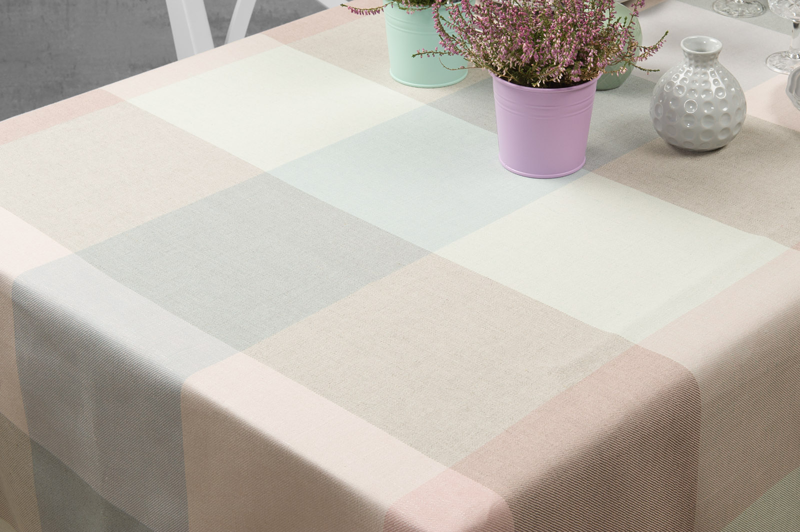 Obrus z tkaniny lniano – bawełnianej wytkanej splotem skośnym w dużą pastelową kratkę. Wielkość kratki 21x21cm. Użyliśmy pastelowych odcieni przędz: róż, zieleń, szary. Obrus będzie szczególnie elegancko się prezentował w zestawie z jednobarwnymi: różowymi, zielonymi albo szarymi serwetkami stołowymi.