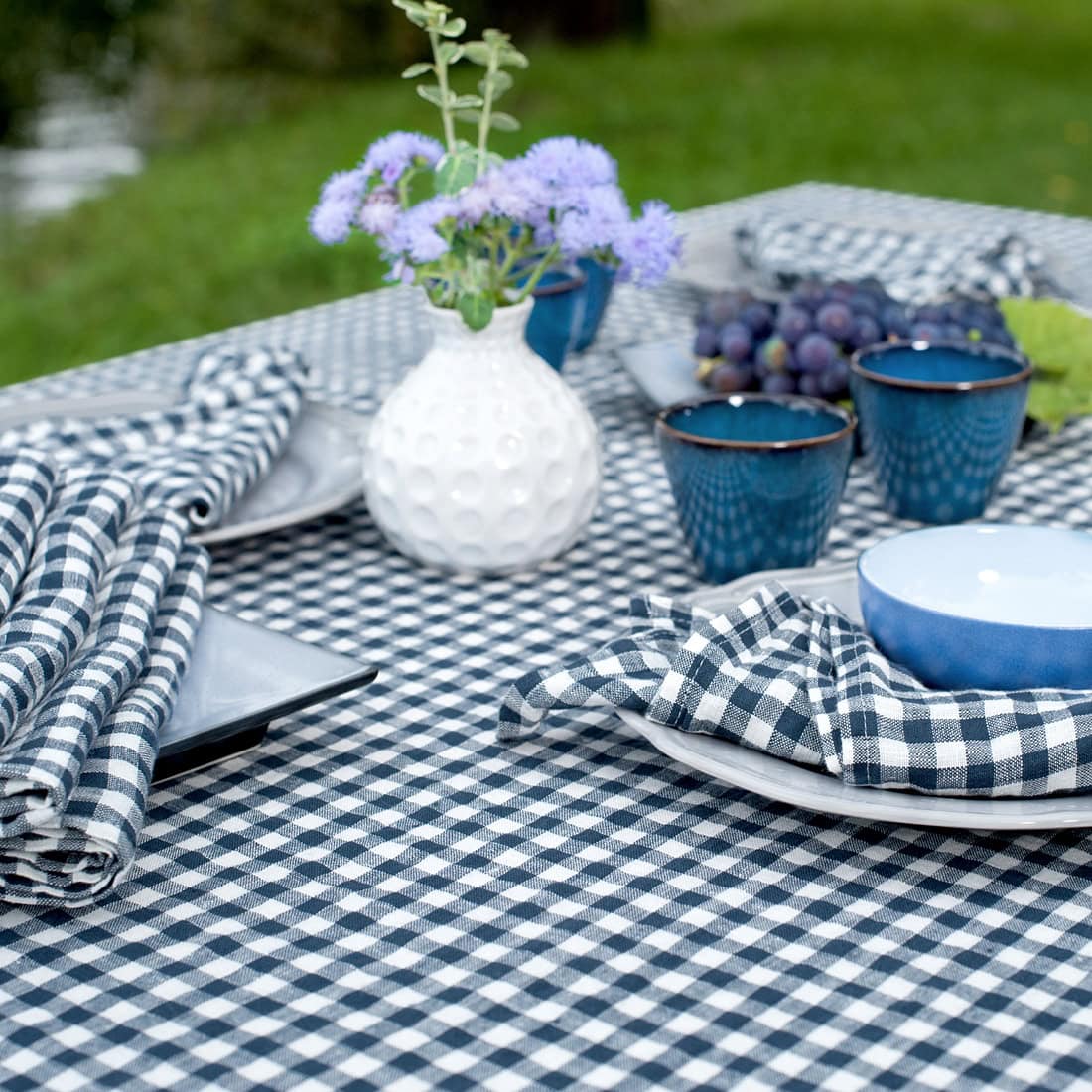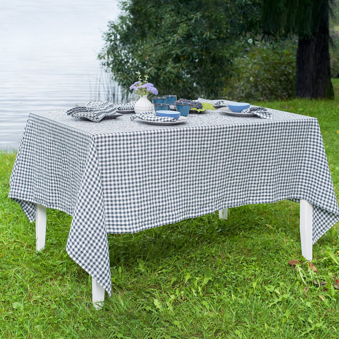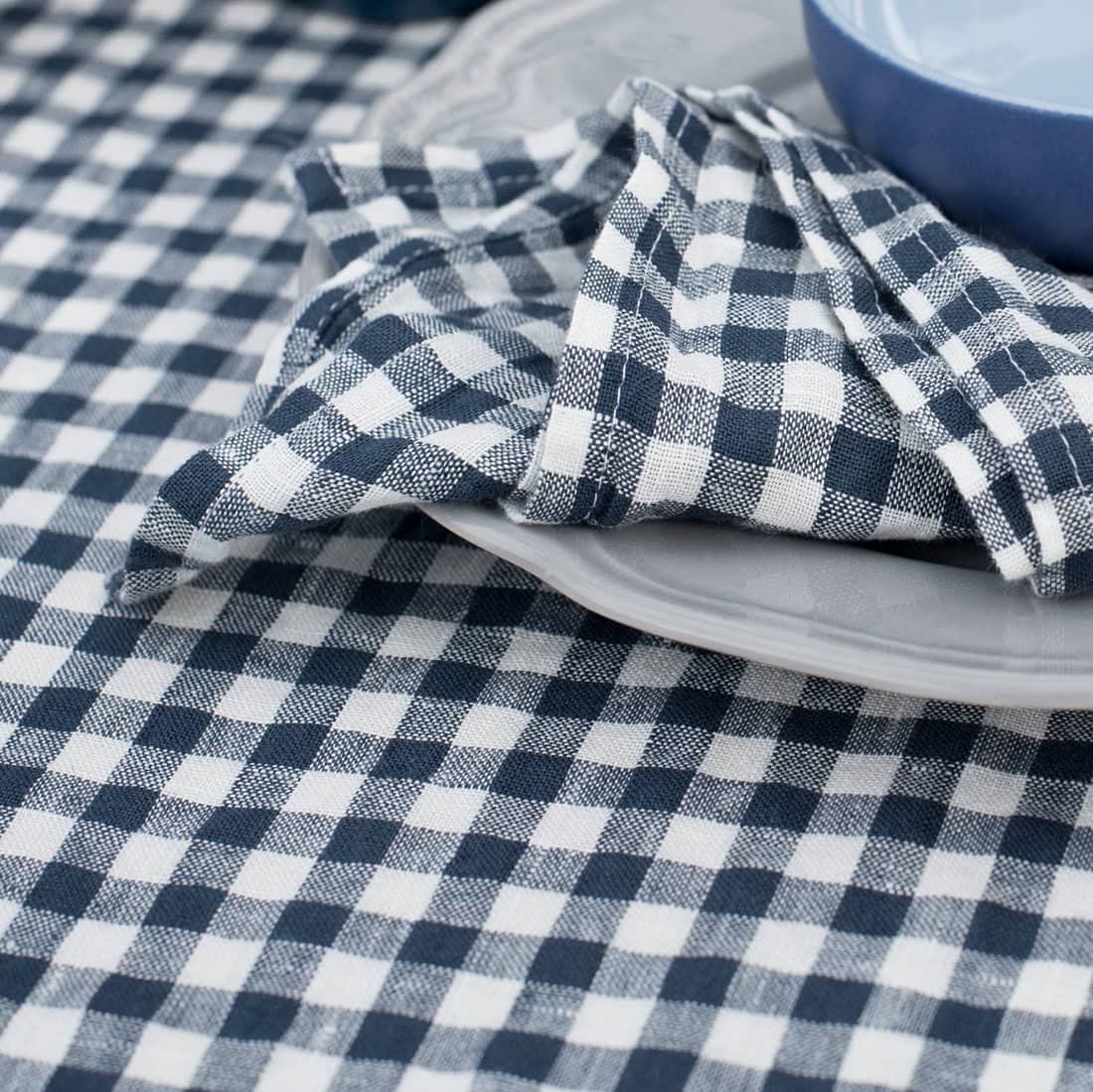 Obrus z pranej tkaniny 100% lnianej wytkanej w klasyczną, regularną granatowo – mlecznobiałą krateczkę. Tkanina lniana po poddaniu praniu w procesie produkcji na stałe nabywa gniecioną fakturę, staje się miękka i nie musi być prasowana po praniu. Przytulny obrus do ozdoby stołu „na luzie”. W naszej kolekcji znajdziesz serwetki z identycznej tkaniny do kompletu.