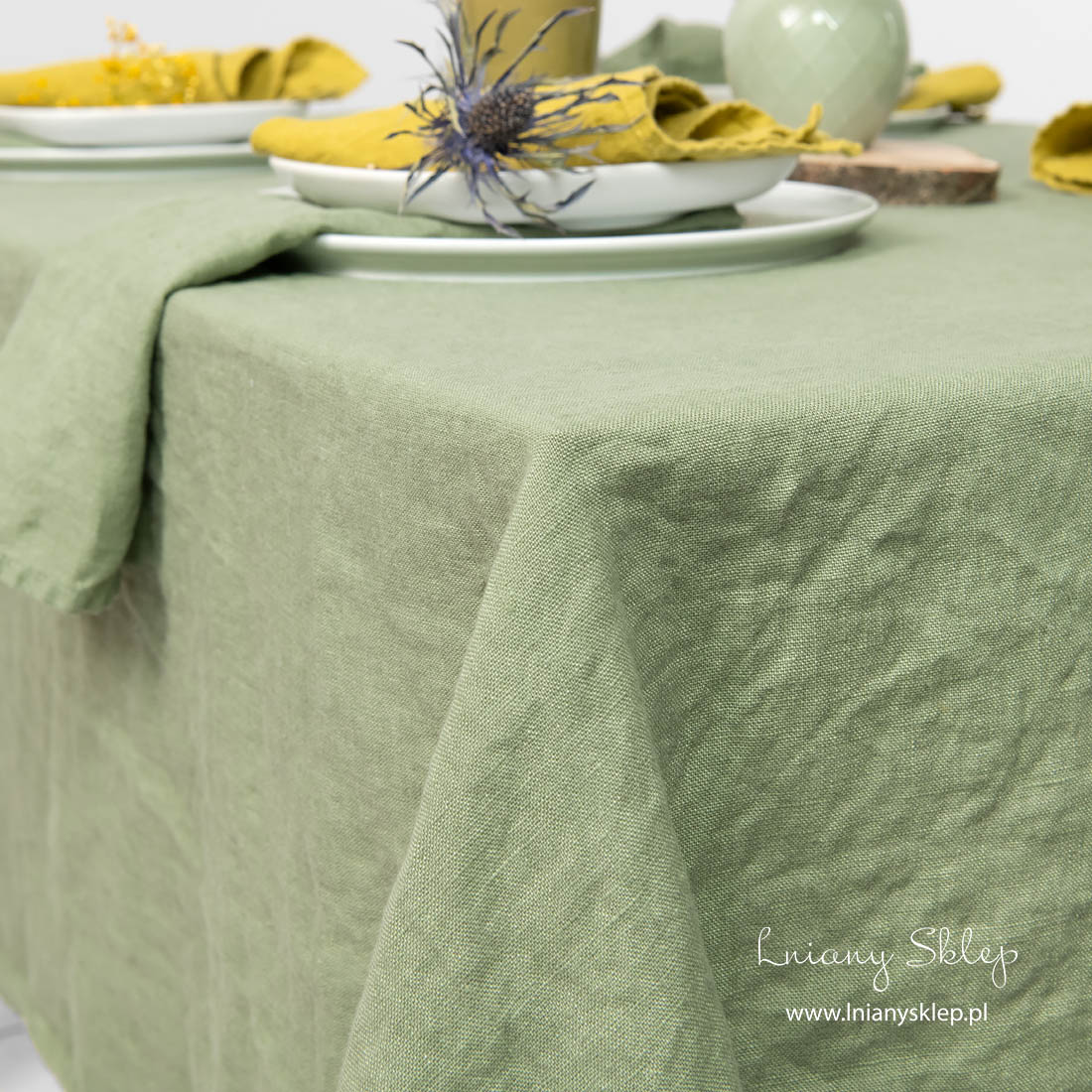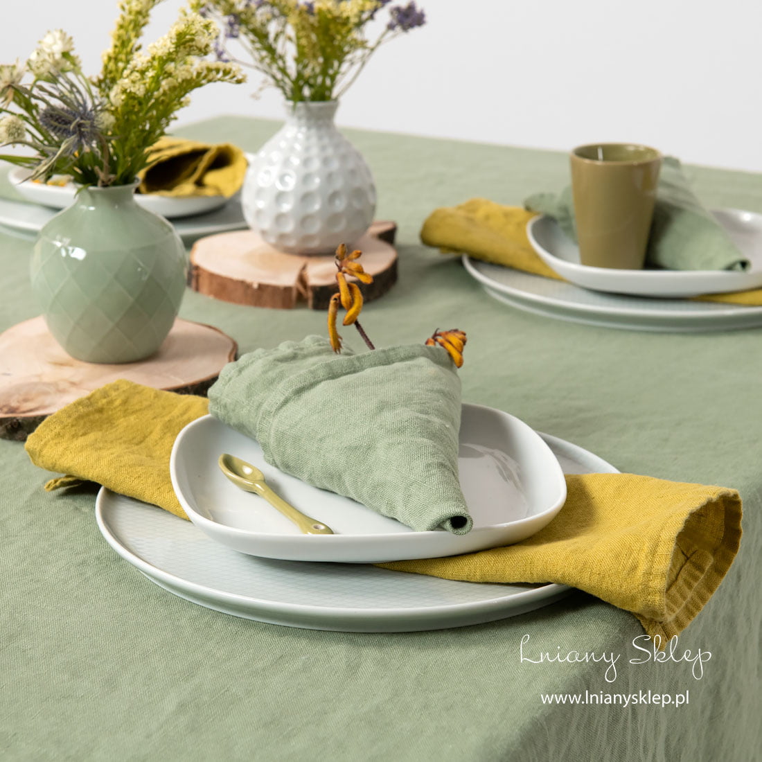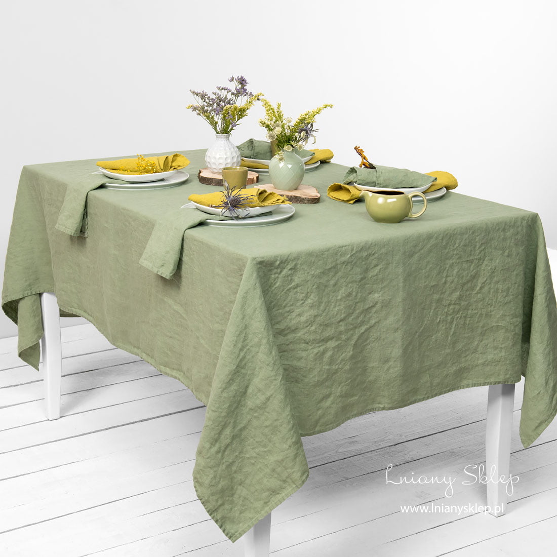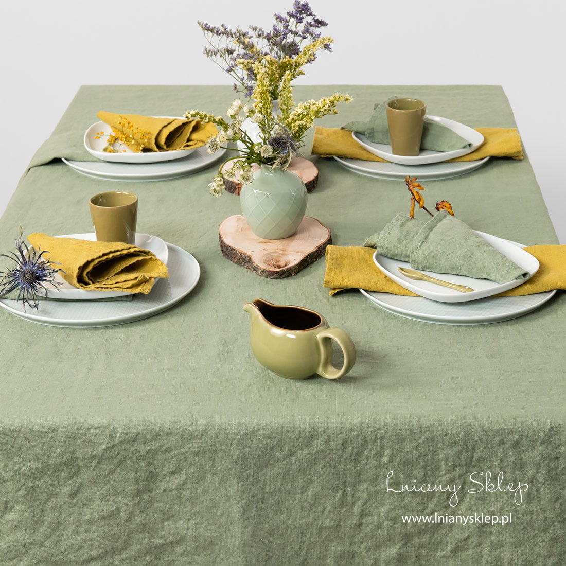 Obrus zielona oliwka prany len jest mięciutki, ma po praniu lekko gniecioną fakturę, więc jak wszystkie produkty z pranego lnu, można go nie prasować. Do kompletu można dobrać różne serwetki: żółte, jasnozielone albo w innym kolorze. Na święta dobierz dekoracje stołu w kolorze czerwonym albo złotym – obrus w pastelowej barwie natury da się pięknie się skomponować na wiele sposobów.