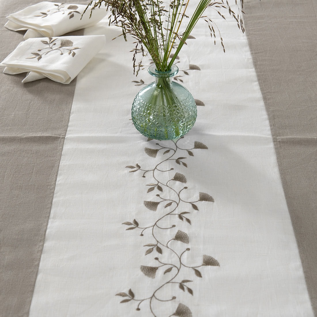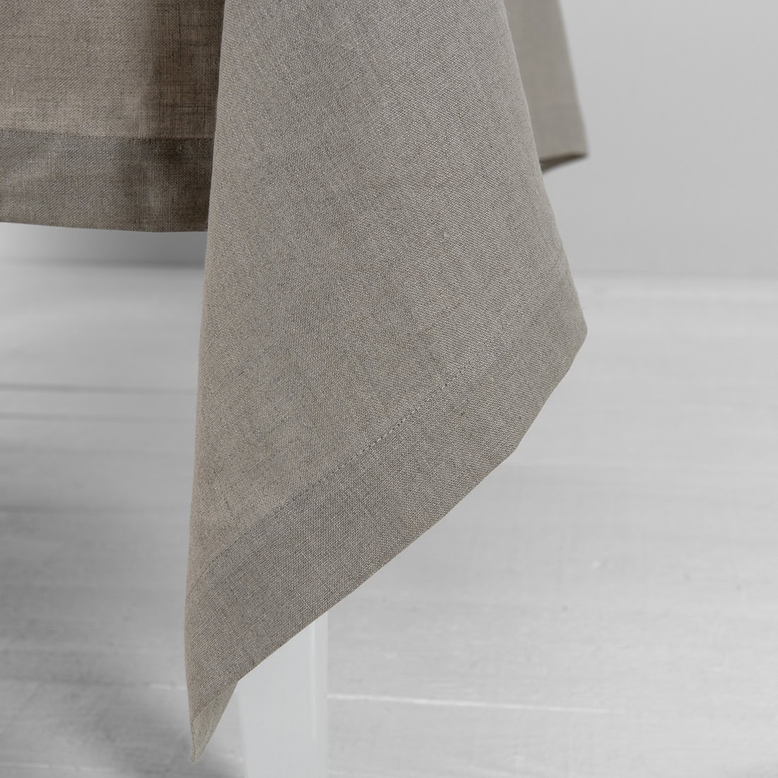 - Kolor: środek – z mlecznobiałej (lekko żółtawej) tkaniny lnianej, brzegi obrusu – z niebarwionej tkaniny lnianej (szarej w piasek)