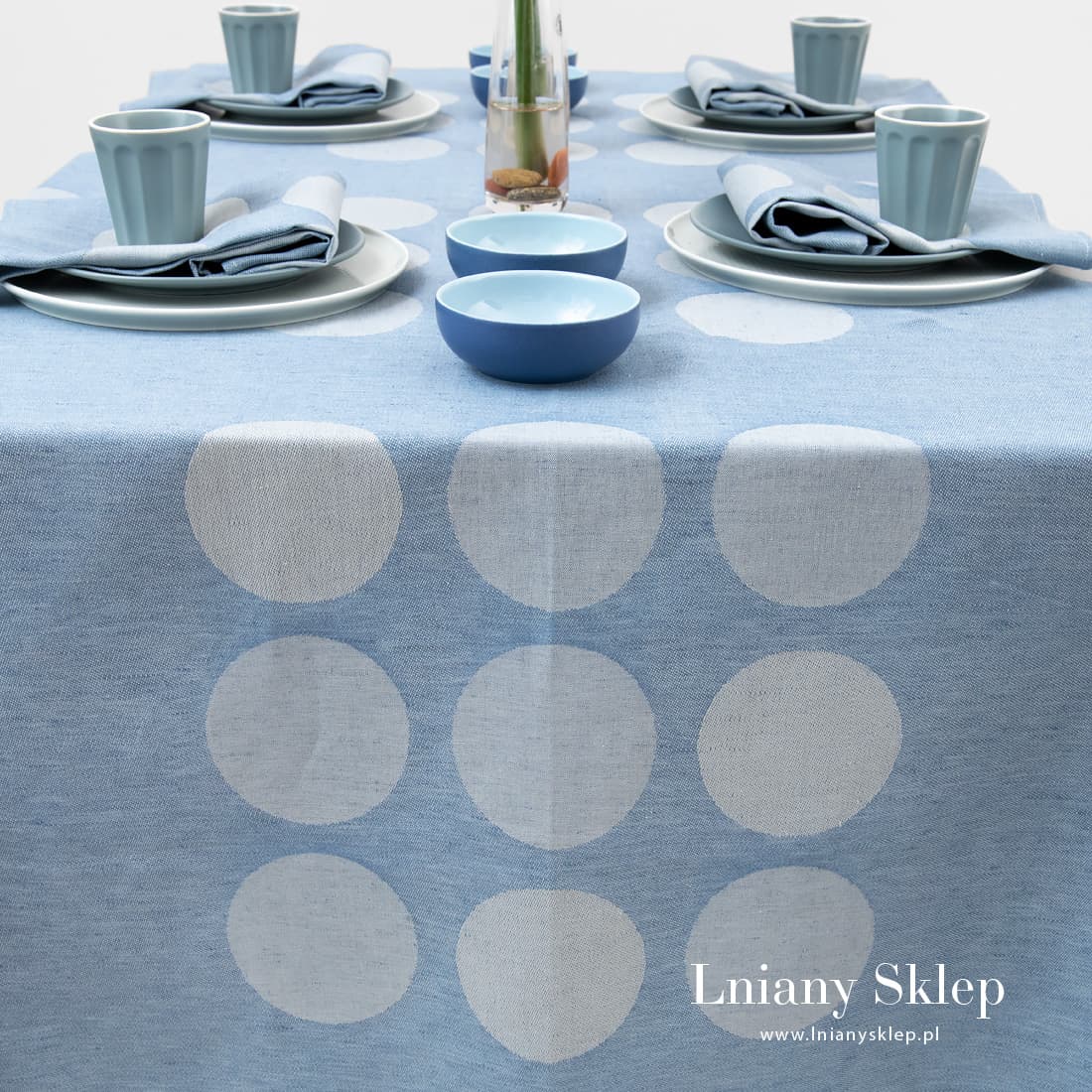 Niebieski obrus z tkaniny lniano - bawełnianej. Tkanina żakardowa została wytkana w duże grochy na niebieskim tle z przędzy niebieskiej i szarej o niebieskim odcieniu. Dopasuj do obrusu serwetki z identycznej tkaniny z naszej kolekcji PANAMA. Ozdób pięknie stół obrusem i serwetkam w niecodzienny, figlarny wzór, zaproś kogoś miłego na romantyczną kolację.