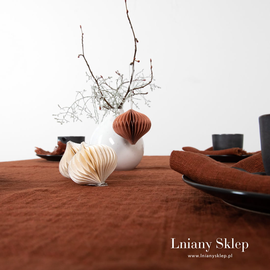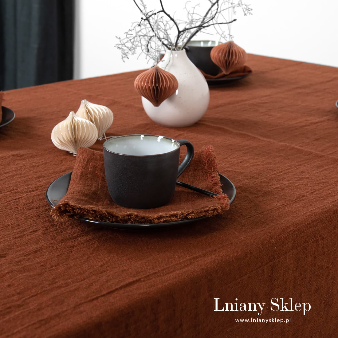 Rudy obrus z pranej tkaniny lnianej wytkanej melanżowo z przędzy brązowej i rudej (brązowej o czerwonym odcieniu). Brzegi obrusu zdobią figlarne strzępione frędzelki długie 1,5cm. W naszej kolekcji znajdziesz serwetki z identycznej tkaniny. Przytulny obrus w barwie ciepłej jesieni będzie sympatyczną ozdobą stołu na wiele okazji.