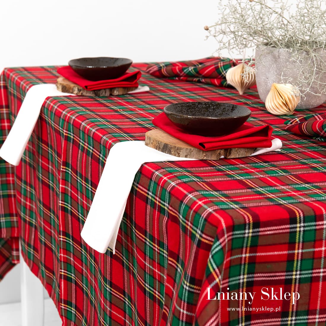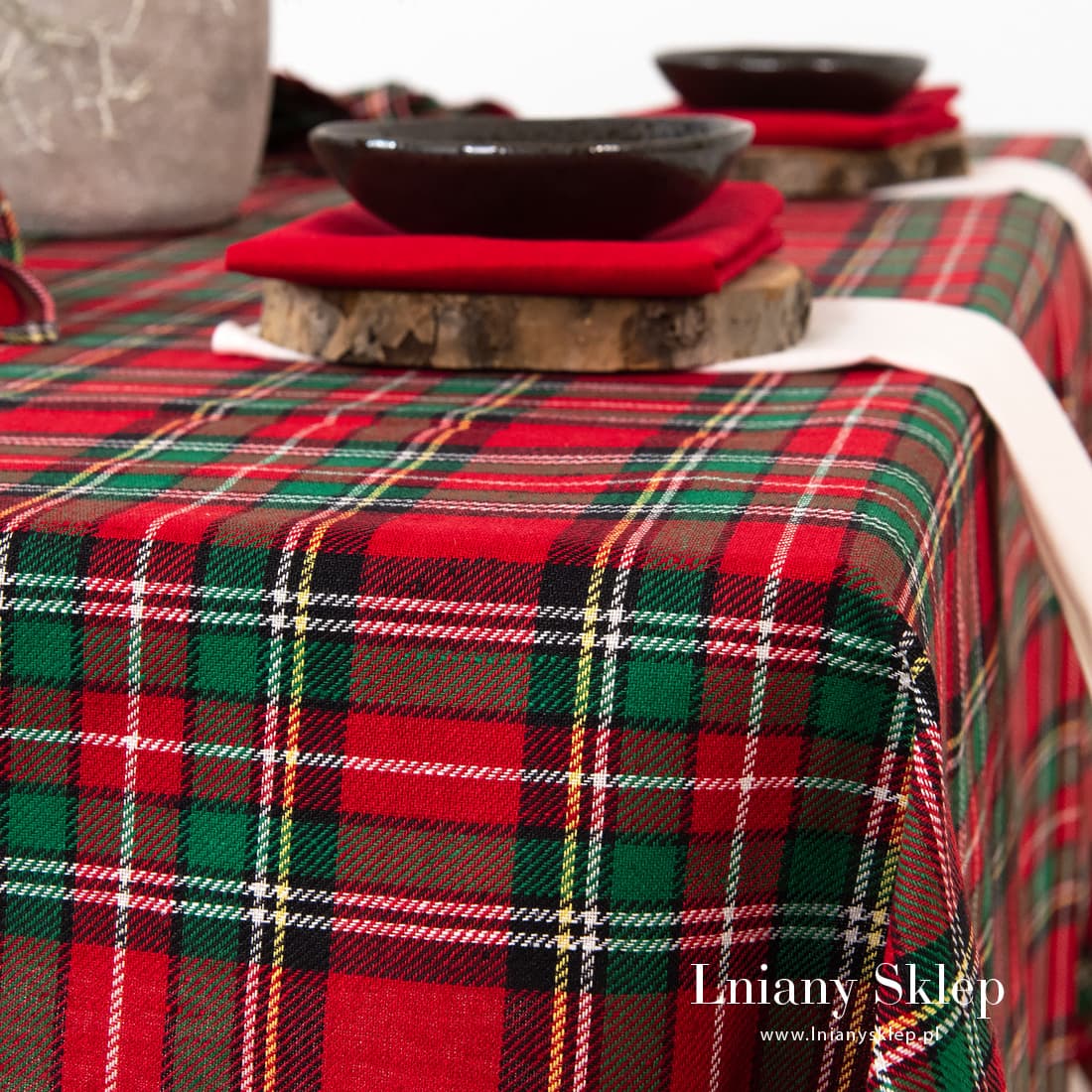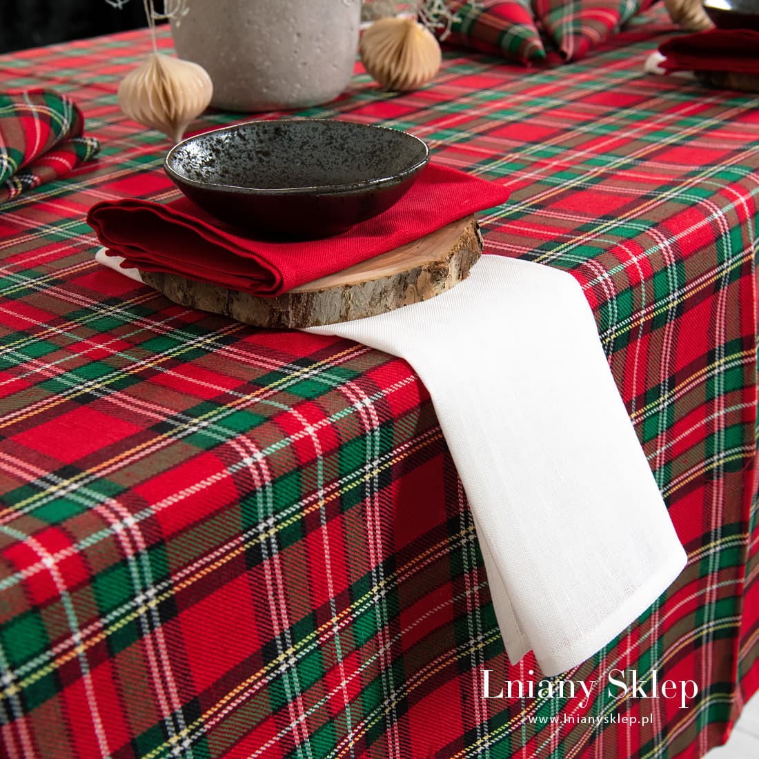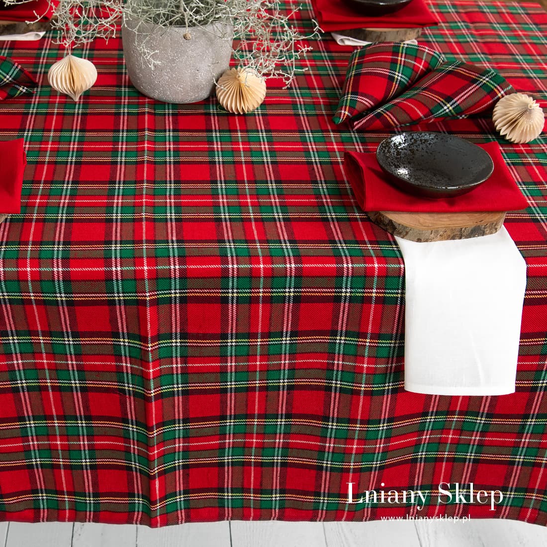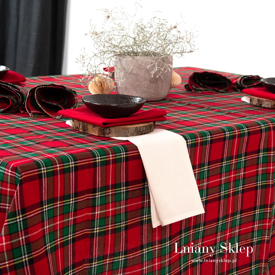 Obrus w kratkę z tkaniny lniano - bawełnianej wytkanej splotem skośnym. Czerwono – zielona kratka podkreślona białymi, żółtymi i czarnymi liniami kojarzy się z Wigilią i Nowym Rokiem. W naszej kolekcji znajdziesz serwetki - bankietki z identycznej tkaniny. Lniany Sklep pomoże Ci się przyszykować do zbliżających się Świąt!