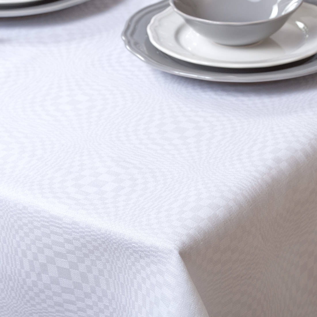 Śnieżnobiały lniano - bawełniany obrus wytkany w kratkę o różnej wielkości. W zależności od kąta padania światła wytkany wzór gra i nieco się zmienia. Zaproś gości do stołu nakrytego świątecznie śnieżnobiałym, mieniącym się w świetle obrusem. Do obrusu można dobrać śnieżnobiałe, gładko wytkane serwetki lniane.