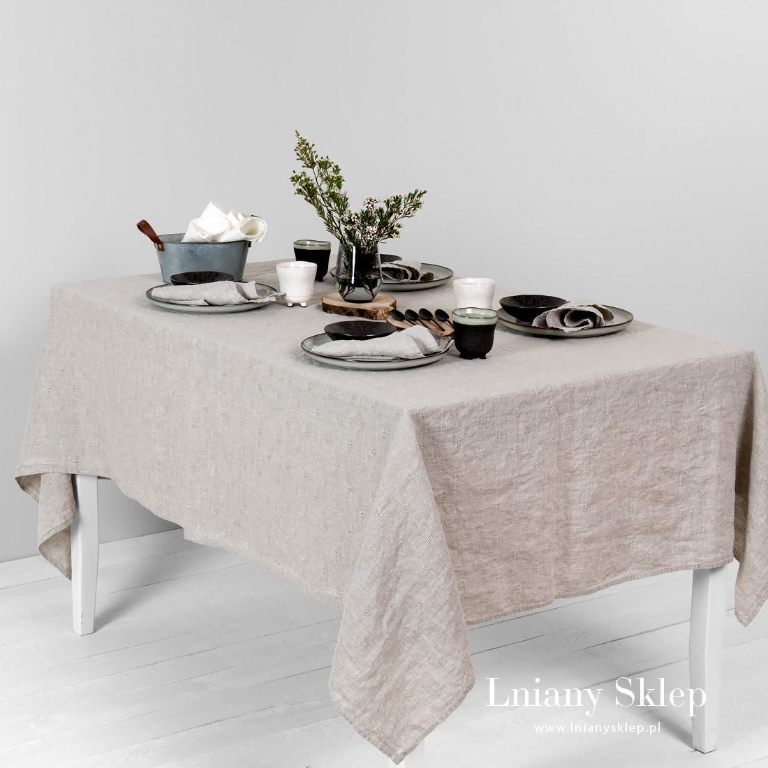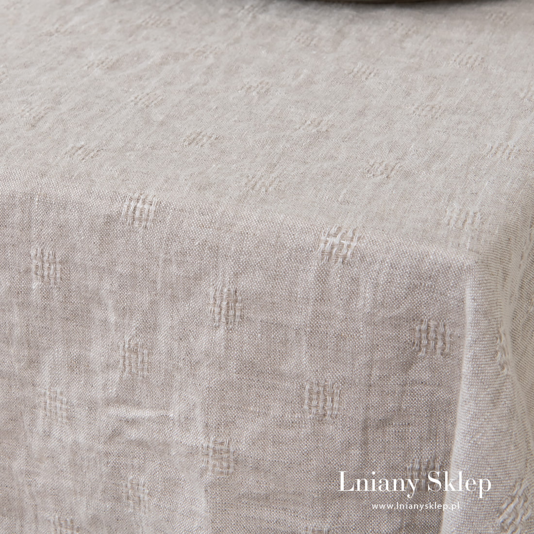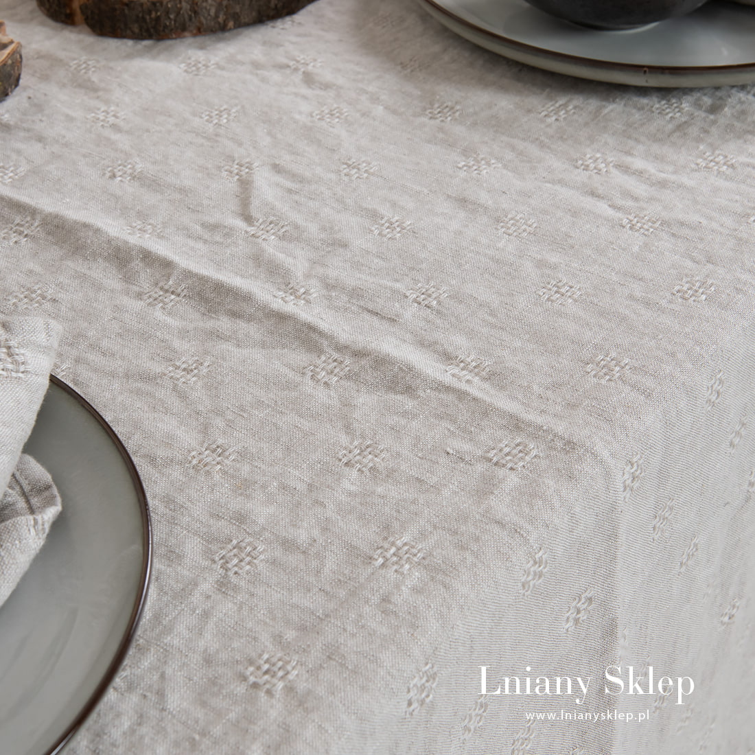 SOLO szary obrus wykonany został z tkaniny wytkanej z białej i szarej (o piaskowym odcieniu) niebarwionej przędzy. Gładko tkane tło obrusa ożywiają rzadziej wytkane, ażurowe „okienka”. Obrus z tak dziś aktualnej, pranej tkaniny naturalnej nie wymaga dokładnego prasowania, jego lekko gnieciona faktura pięknie się prezentuje we współczesnych wnętrzach albo na stole w ogrodowej altance. W kolekcji mamy serwetki z identycznej tkaniny.