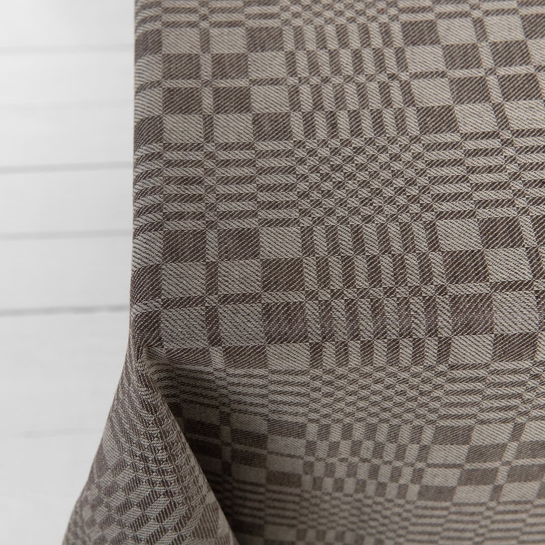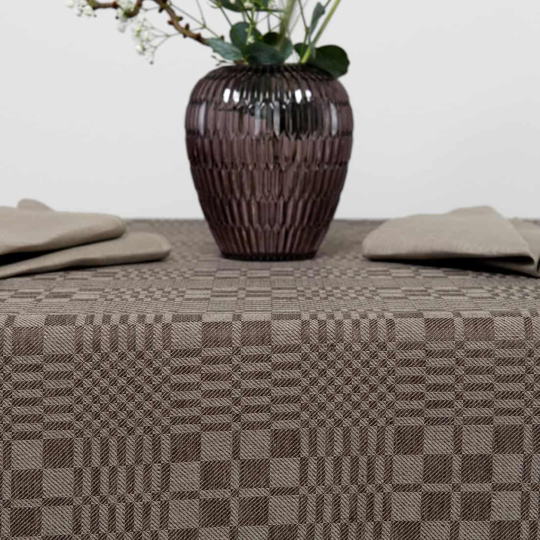 • Brązowy obrus wytkany splotem skośnym w kratkę