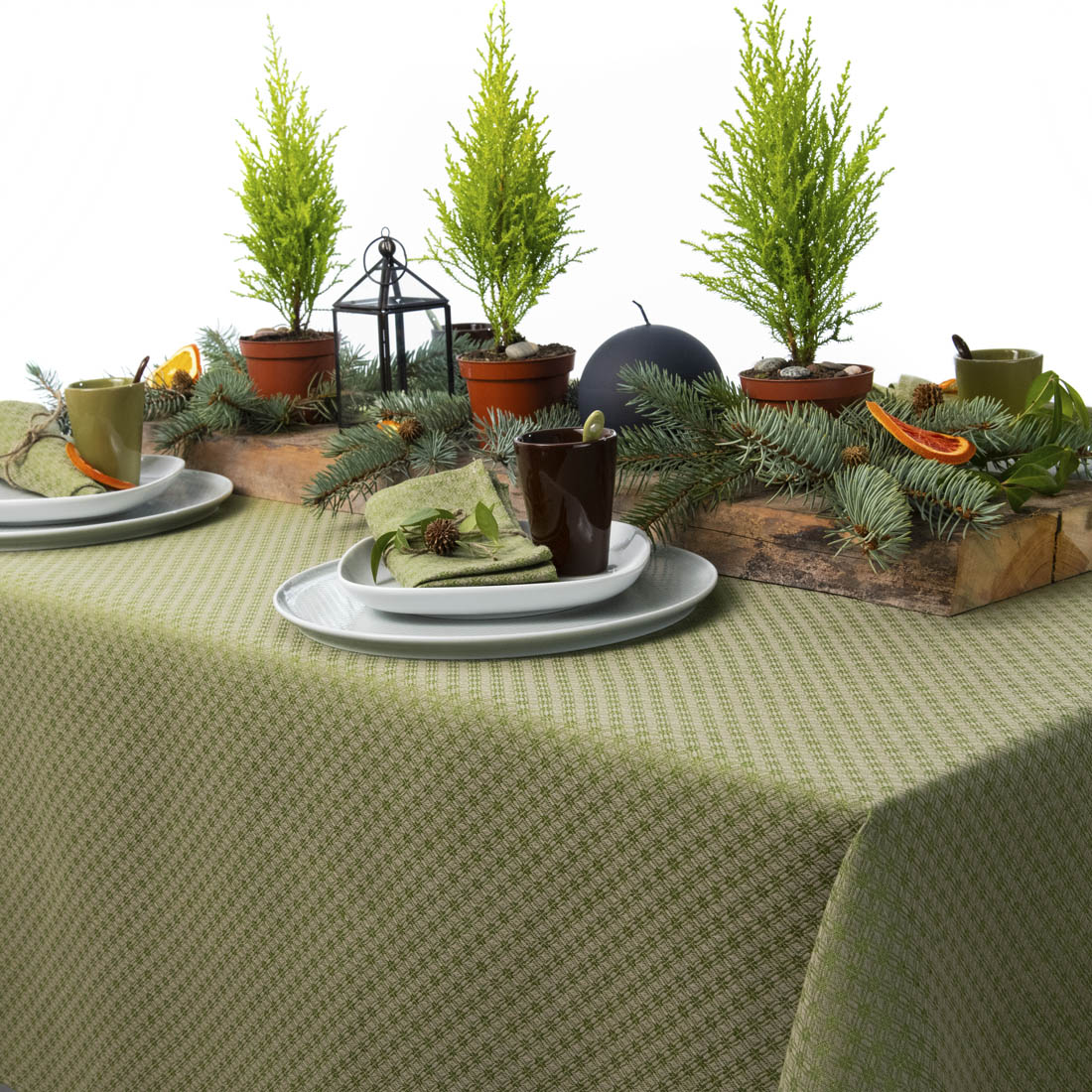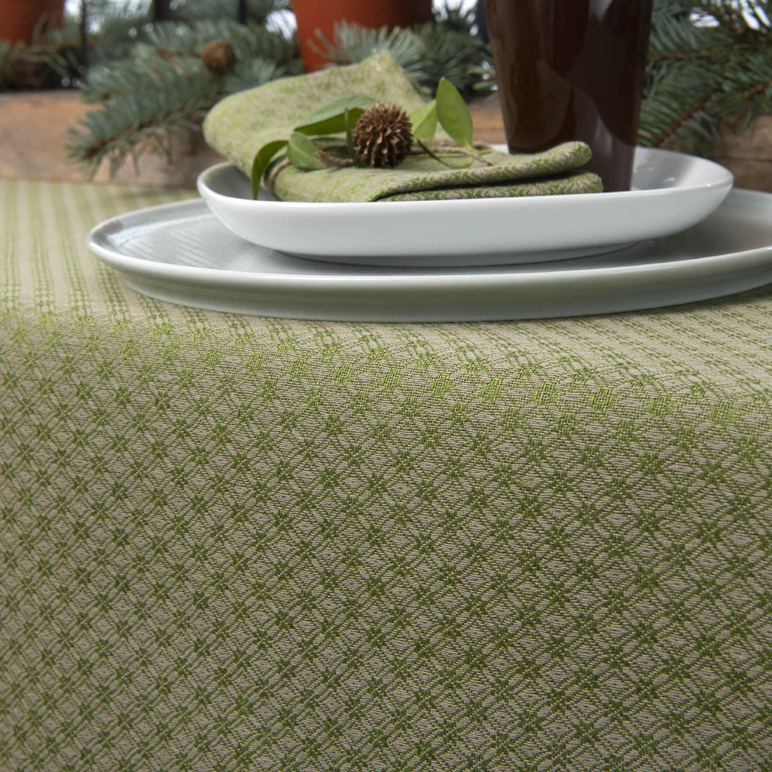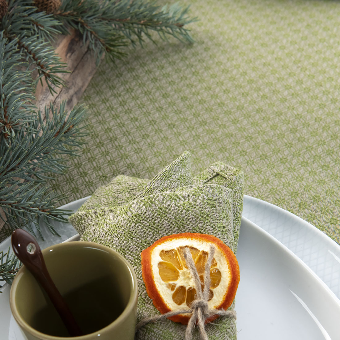 Lniano - bawełniany obrus wytkany we wzór zielonych i szarych rombów. W miejscu styku rombów wzór układa się w geometryczne kwiatki. Kolorowy obrus stanie się ozdobą świątecznego i codziennego stołu. W naszym sklepie można dobrać serwetki stołowe do kompletu.