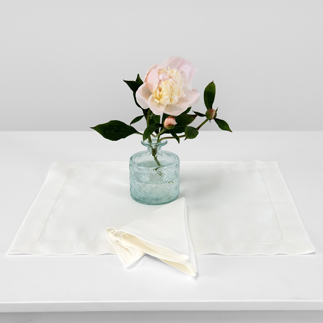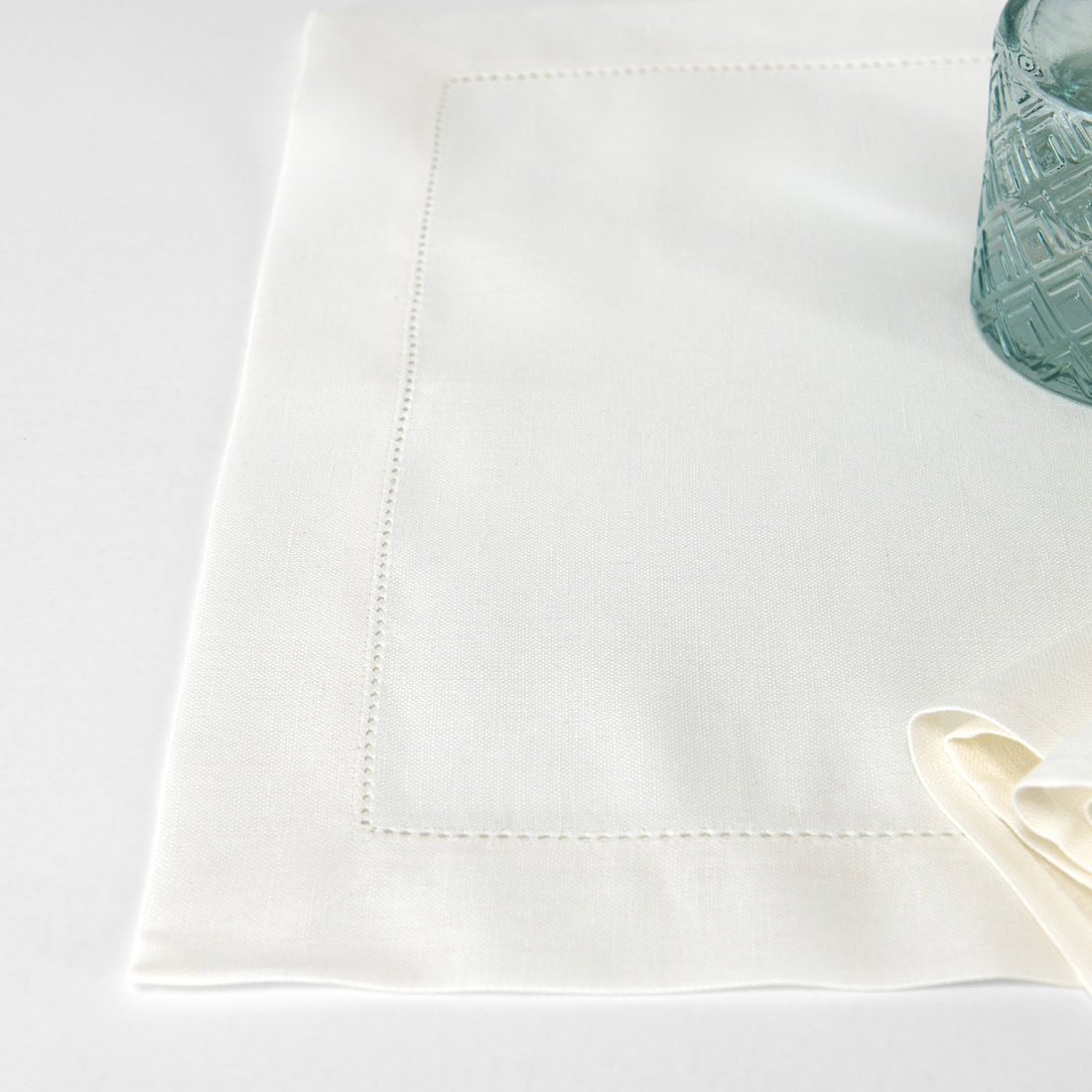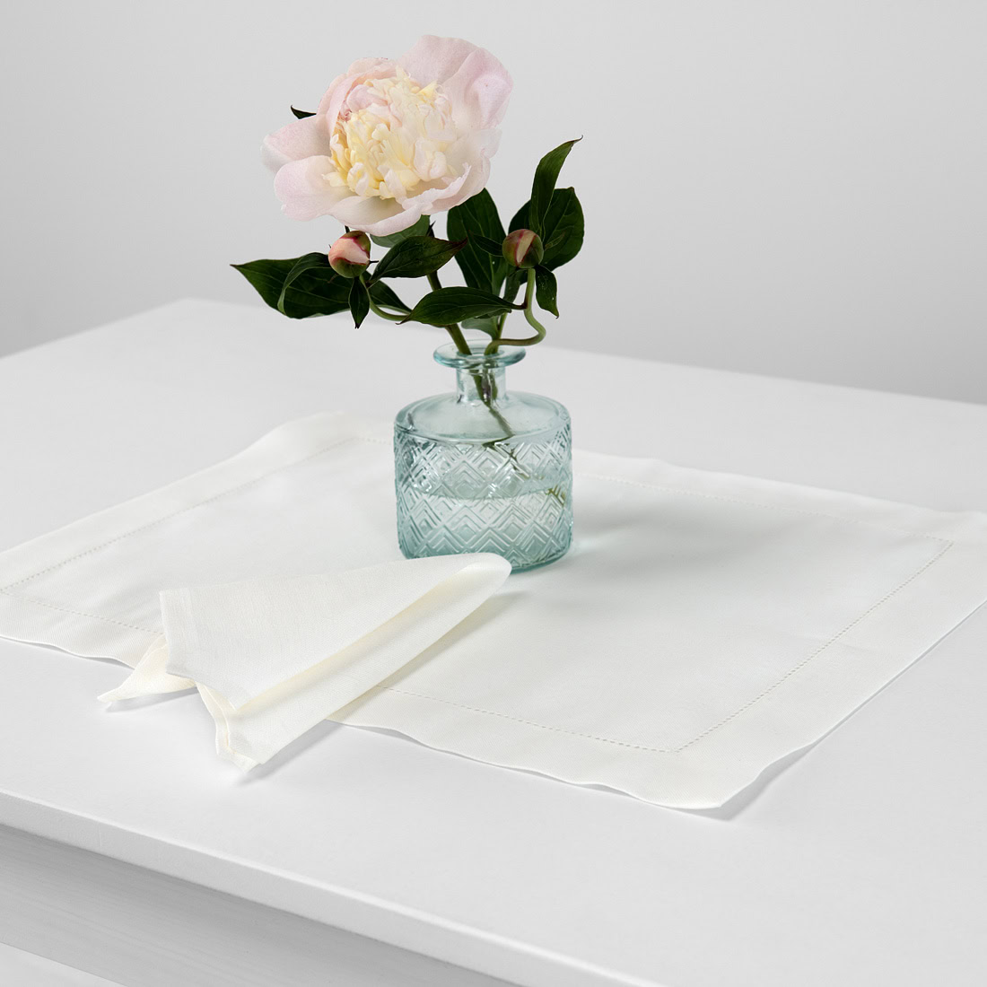 Mlecznobiała (żółtawa), lniano - bawełniana, gładko tkana podkładka stołowa. Brzeg podkładki ozdobiono mereżką i szeroką bordiurą. Delikatnie zdobiona podkładka doda elegancji każdemu - codziennemu i świątecznemu stołowi.